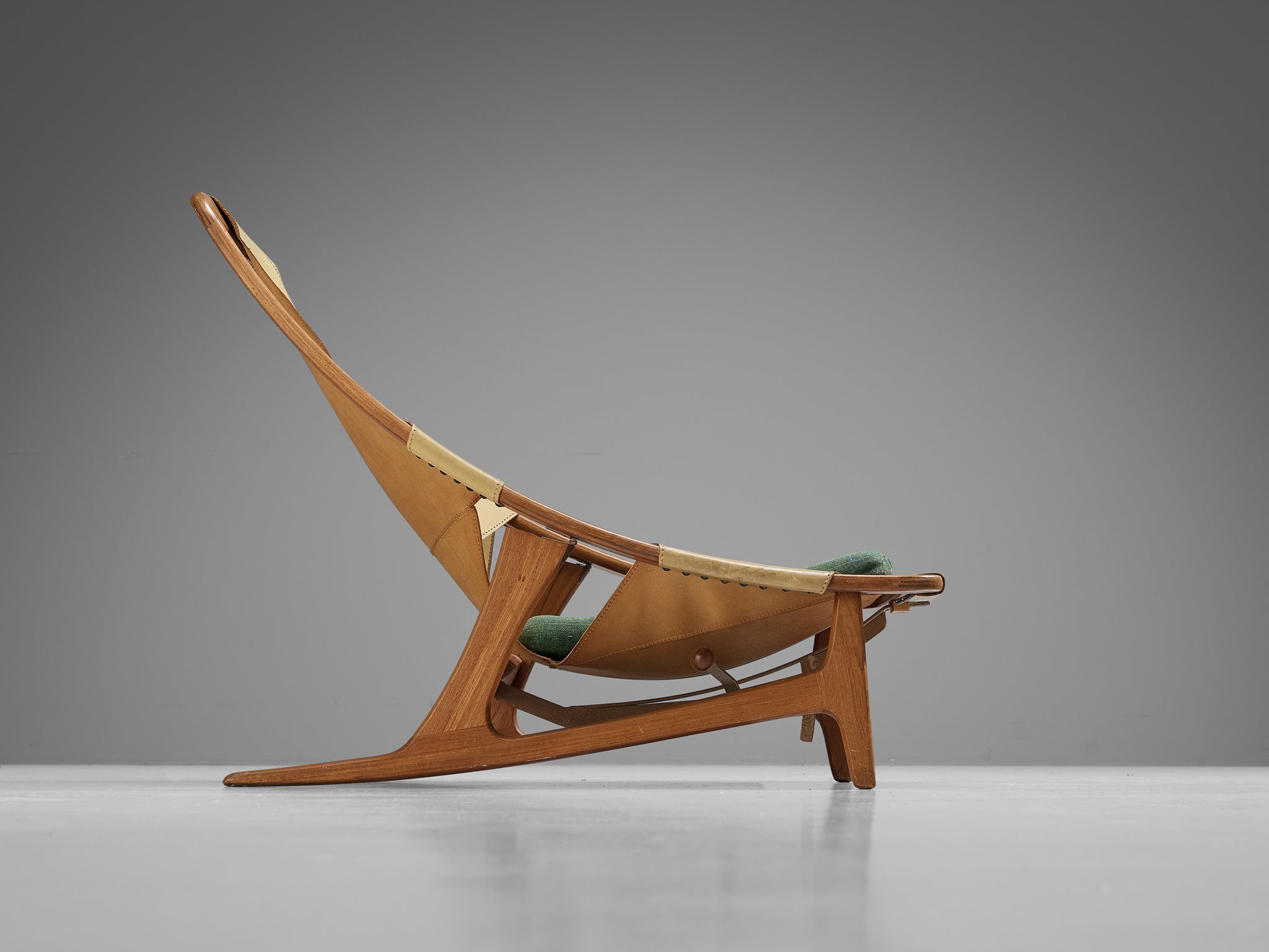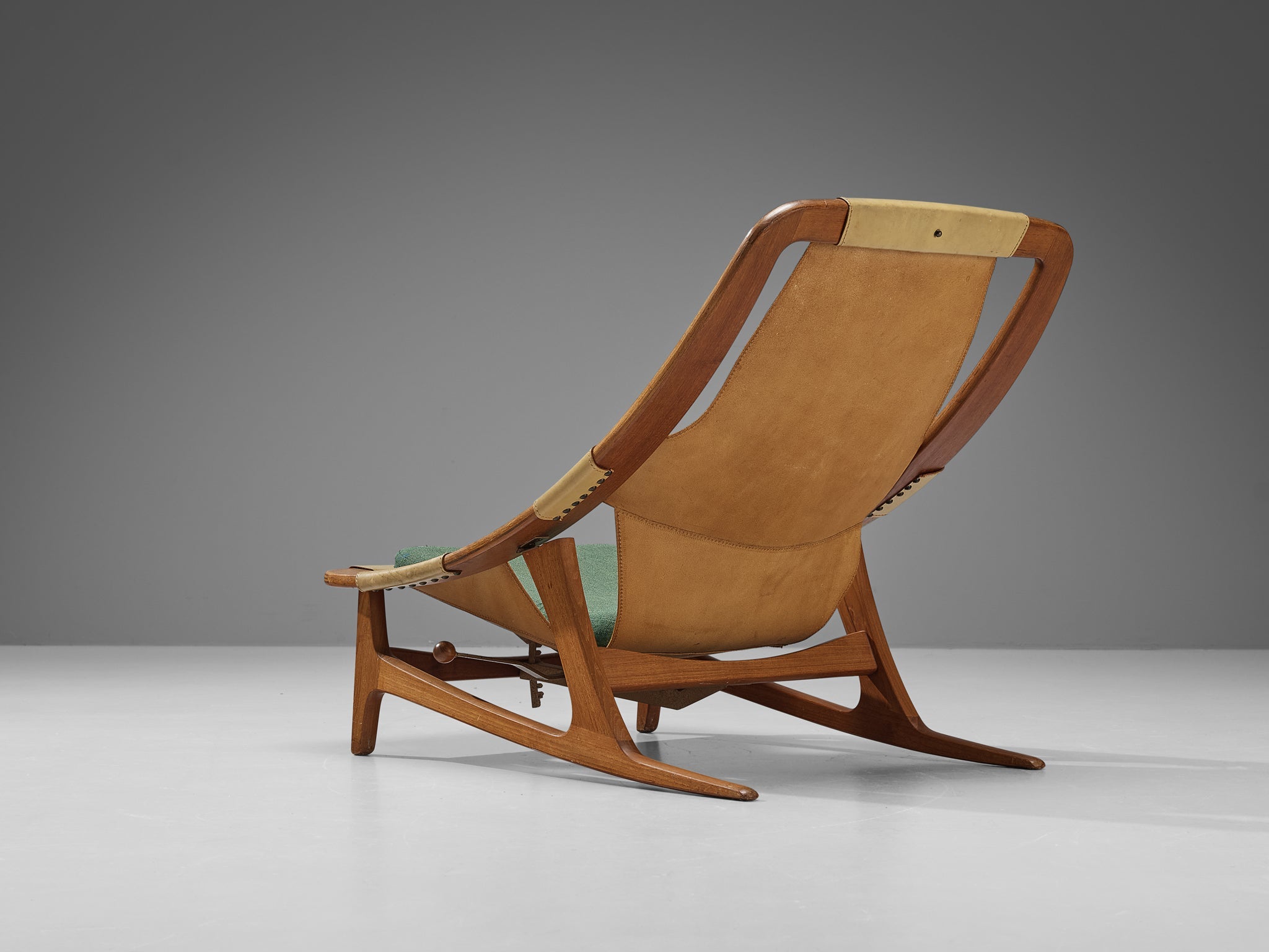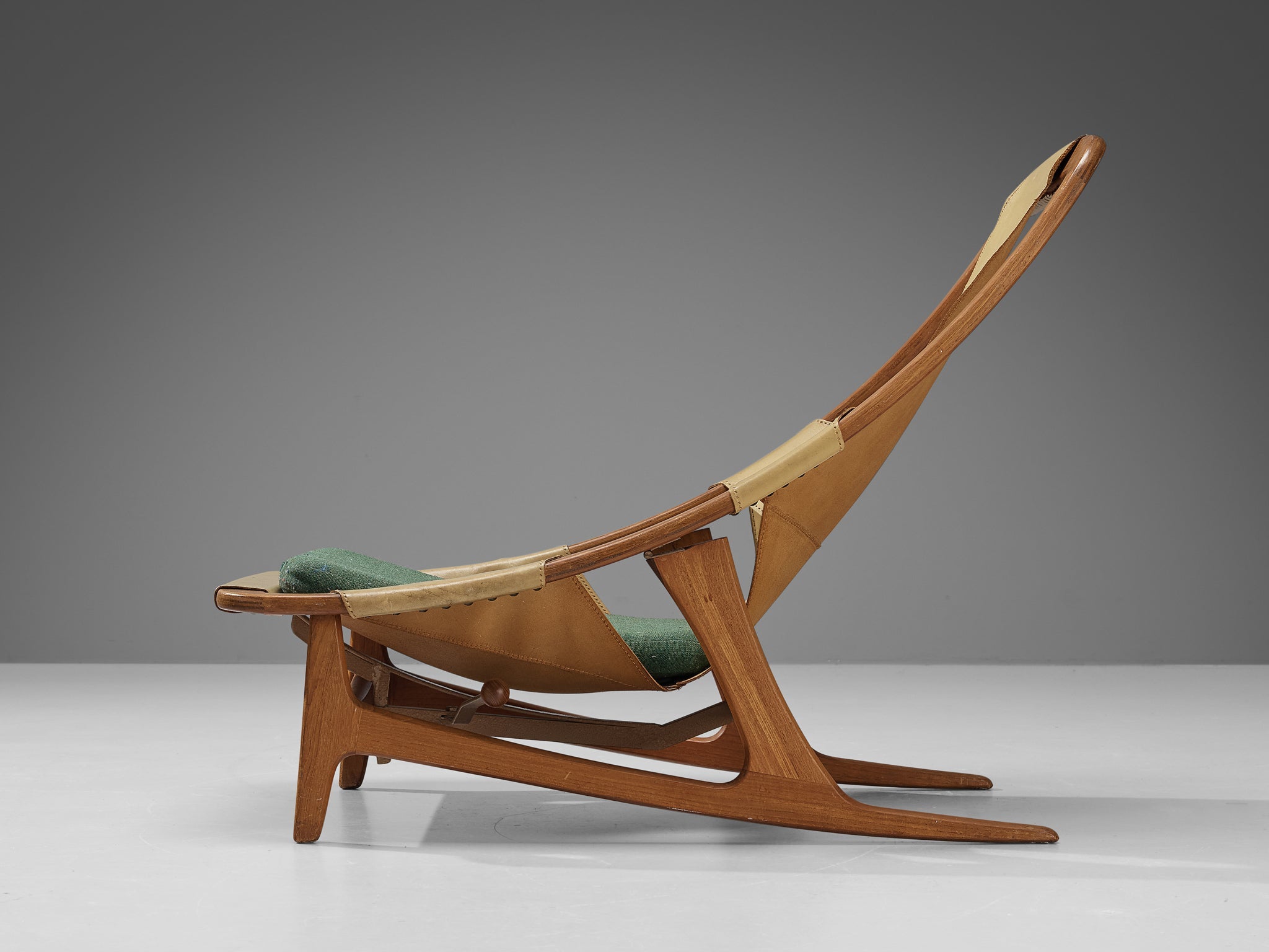 This easy chair is designed by Norwegian designer Arne F. Tidemand Ruud and produced by Norwegian company Norcraft. This chair is very dynamic due its design and shapes. The teak frame shows beautiful curves and lines. Beautifully crafted and detailed are the sled legs. Both the combination of materials and the overall shape reminds of a hunting chair. Camel colored saddle leather is used for the seating that fits perfectly around the body. An inventive feature of this piece is the adjustable seat, that can be put in a relaxed position as well.