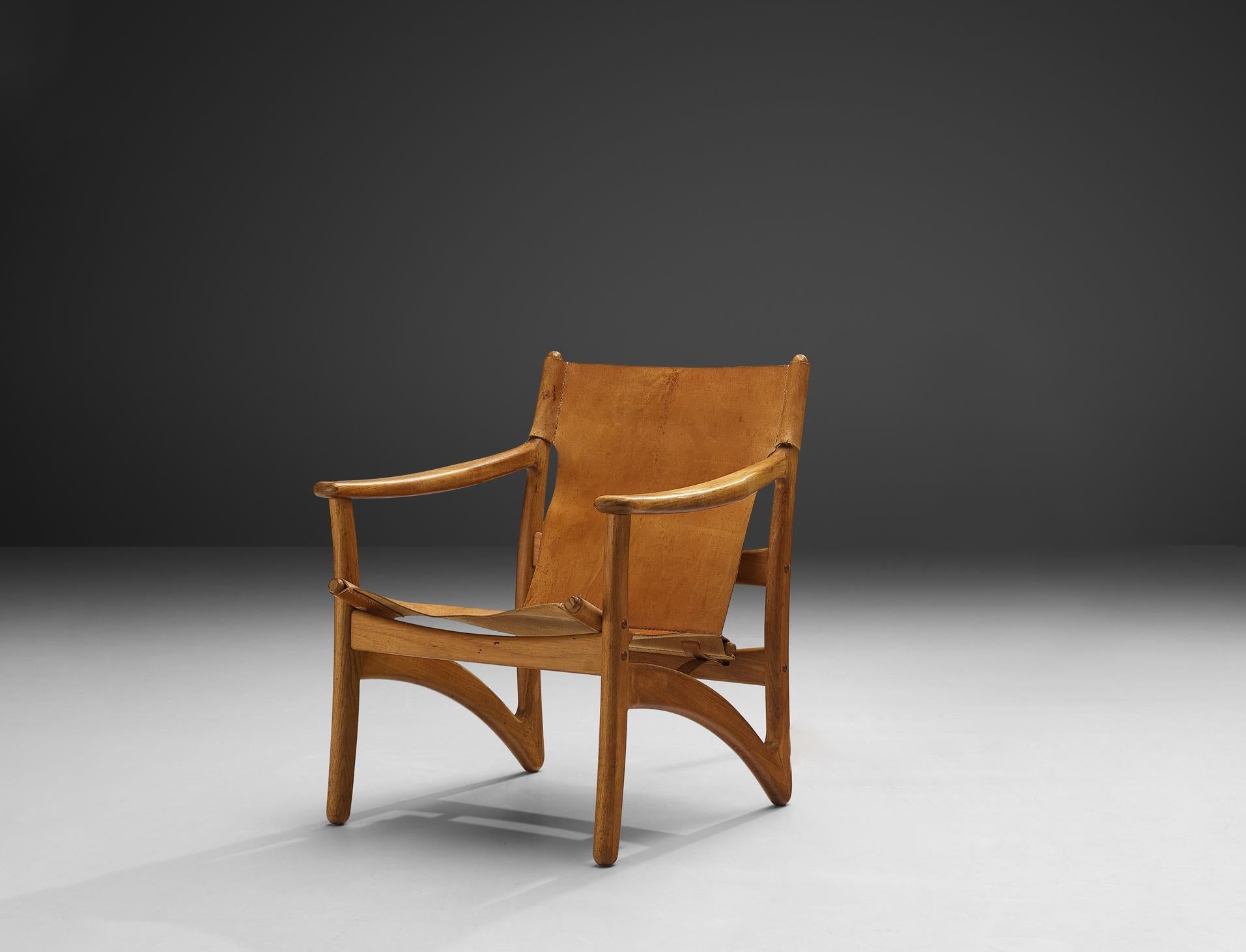 This chair reflects the hallmarks of 1960s Danish modern design: a streamlined silhouette, an emphasis on natural materials, and a sculptural yet pragmatic approach to comfort. The frame is built of solid teak distinguished by its rich, warm color and smooth grain. Its softly curved arms and legs demonstrate the era’s fascination with organic lines (rather than rigid geometric angles). The gently angled backrest and low-slung seat height speak to a human-centered approach to design: comfortable seating was paramount, but it had to be executed in an elegantly minimal form. In place of bulky upholstery, the seat and back are rendered in taut cognac leather, slung between the wooden supports. All in all, this piece exemplifies the understated craftsmanship and commitment to functional beauty that defined Danish modern furniture throughout the mid-century era.