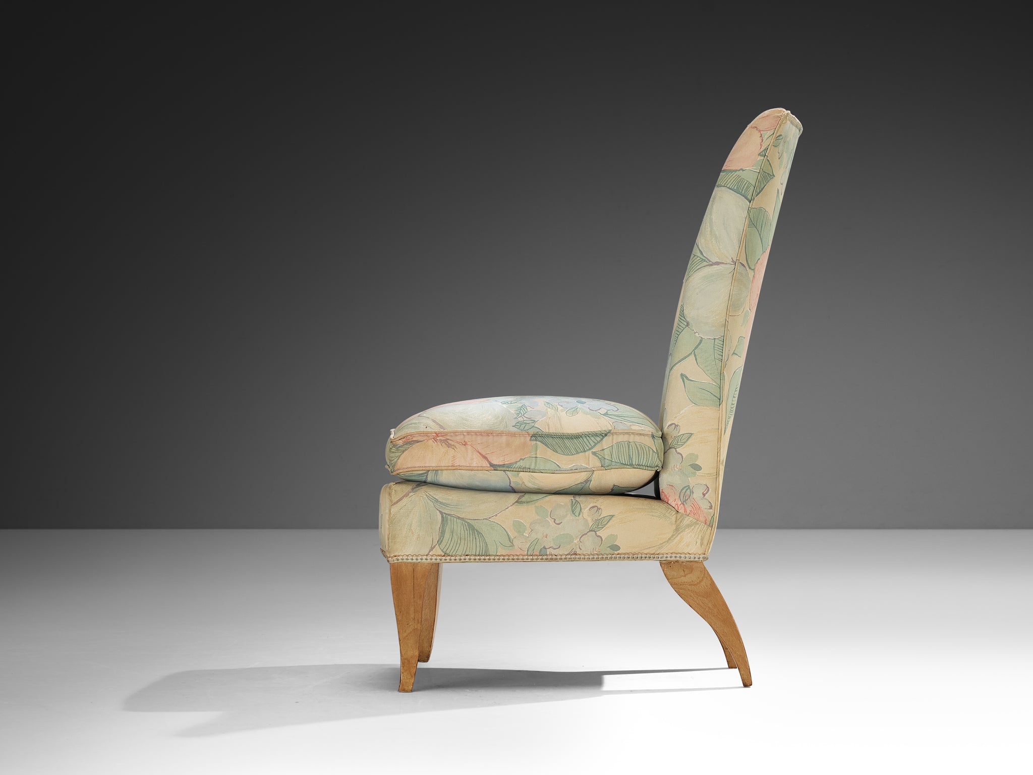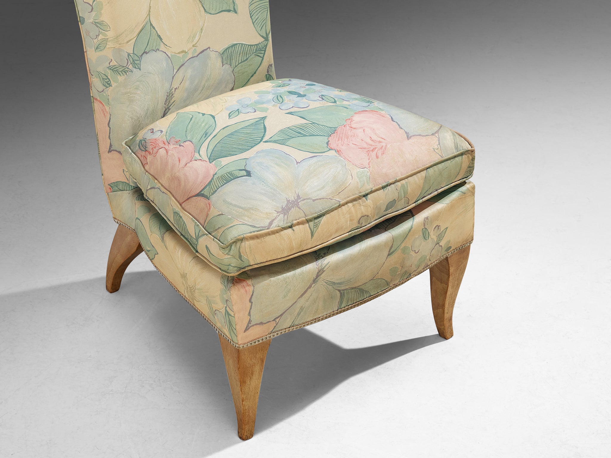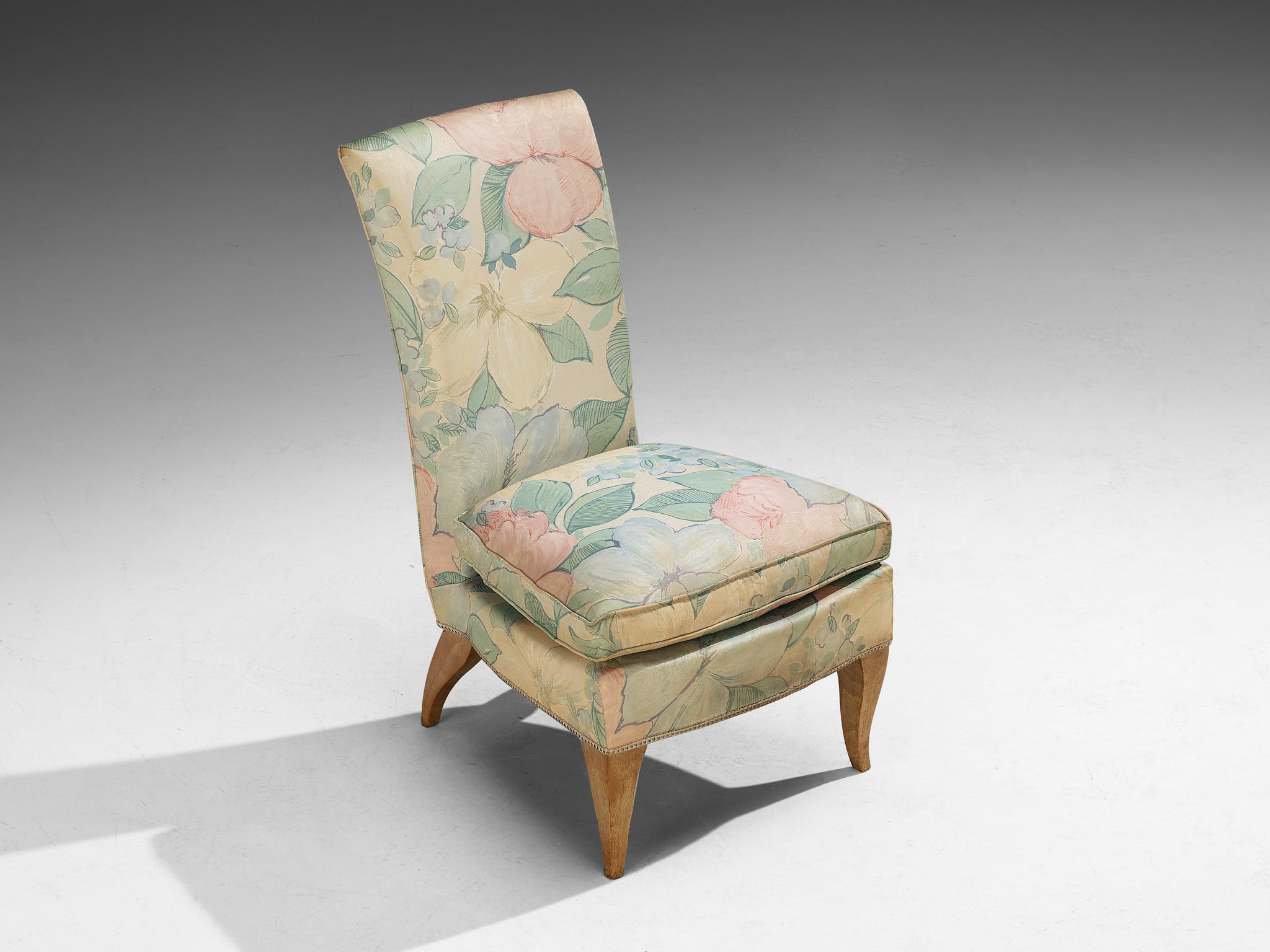 This charming slipper chair, crafted in France during the 1940s, is a beautiful example of Art Deco elegance and craftsmanship. Upholstered in a soft, pastel floral fabric, it displays romantic nostalgia. The gently curved backrest and plush seat cushion offer both comfort and style, making it an inviting addition to any interior. Its legs, shaped in solid beech wood, provide a warm contrast to the upholstery and reflect the high-quality materials and attention to detail characteristic of Italian furniture design from that era.