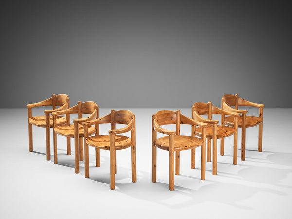 Italian Set of Six Armchairs in Pine with Light Blue Laced Backrest Seating MorentzItalian Set of Six Armchairs in Pine with Light Blue Laced Backrest Seating Morentz