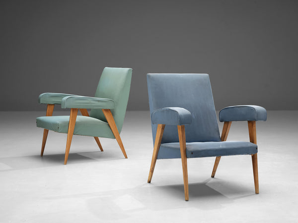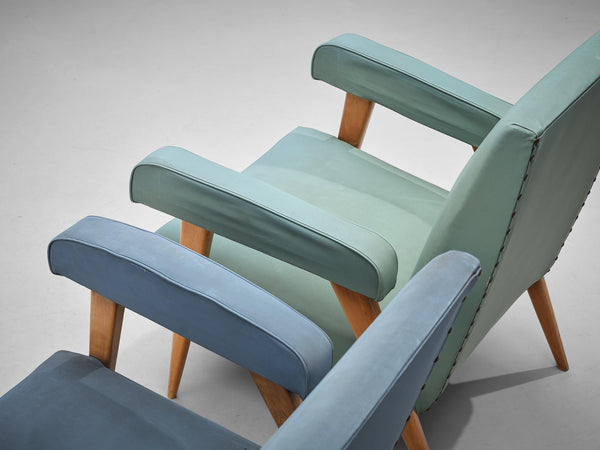 Pair of Charming Italian Mid-Century Lounge Chairs in Light Blue Damask Fabric