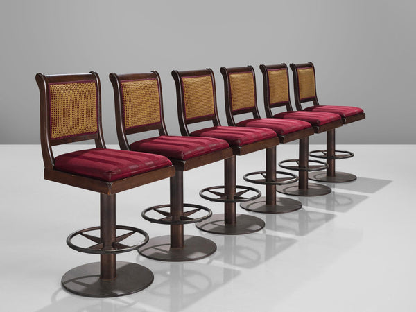 Gianfranco Frattini for Cassina Set of Eight Barstools in Stained Walnut and Red Leatherette Seating MorentzGianfranco Frattini for Cassina Set of Eight Barstools in Stained Walnut and Red Leatherette Seating Morentz