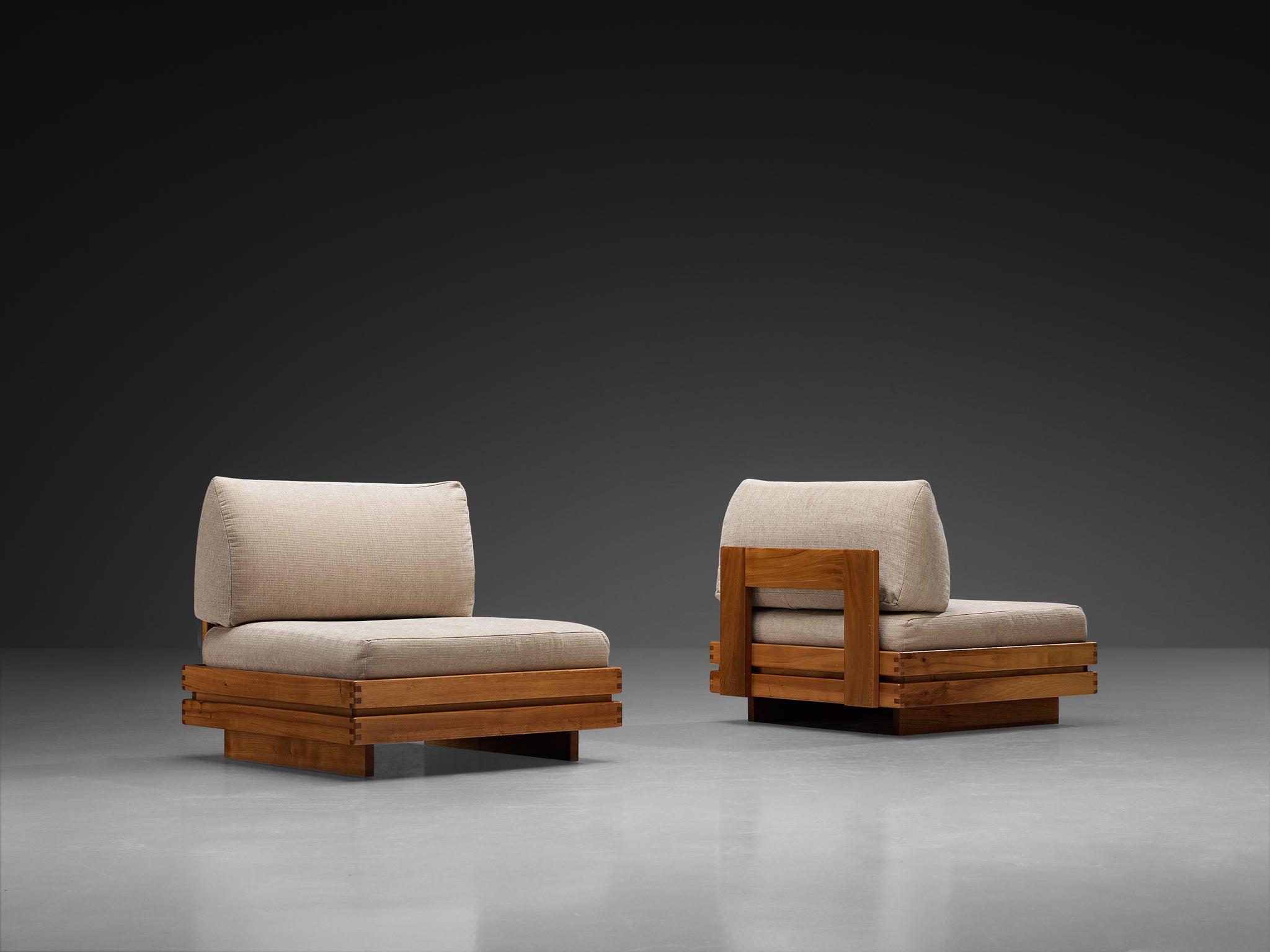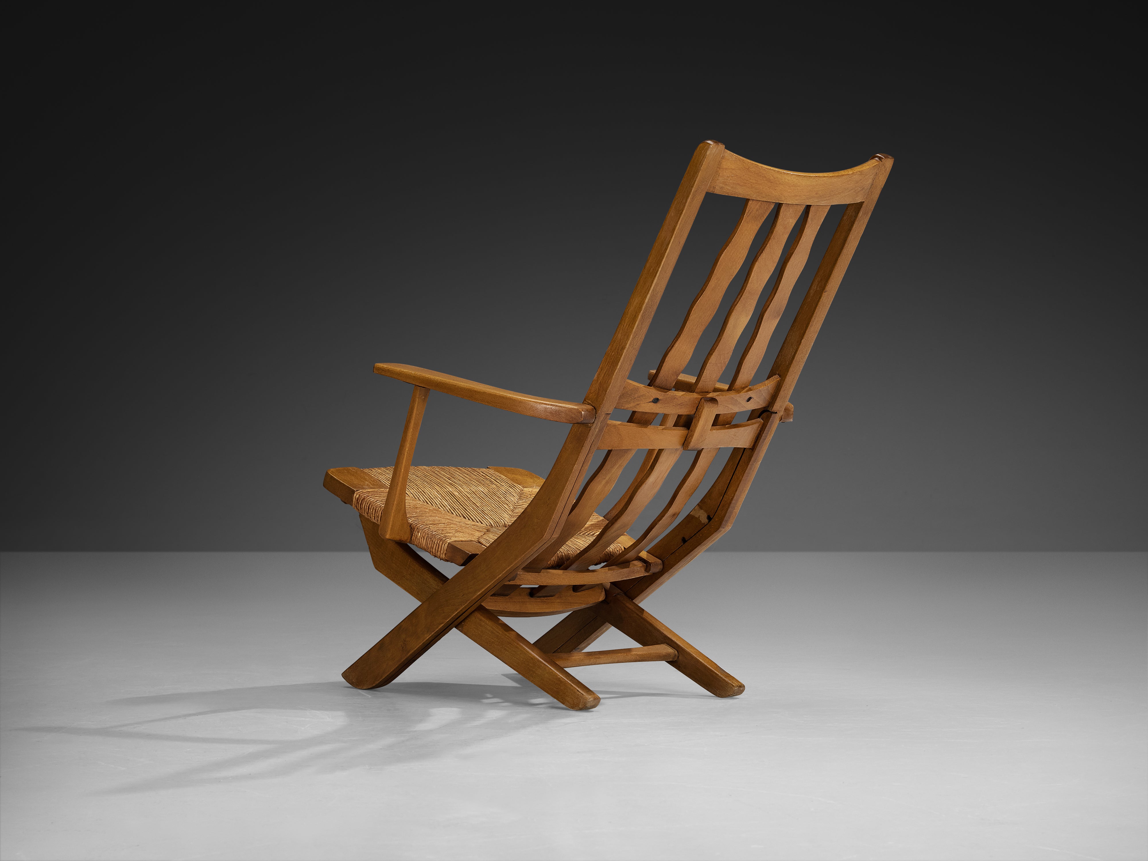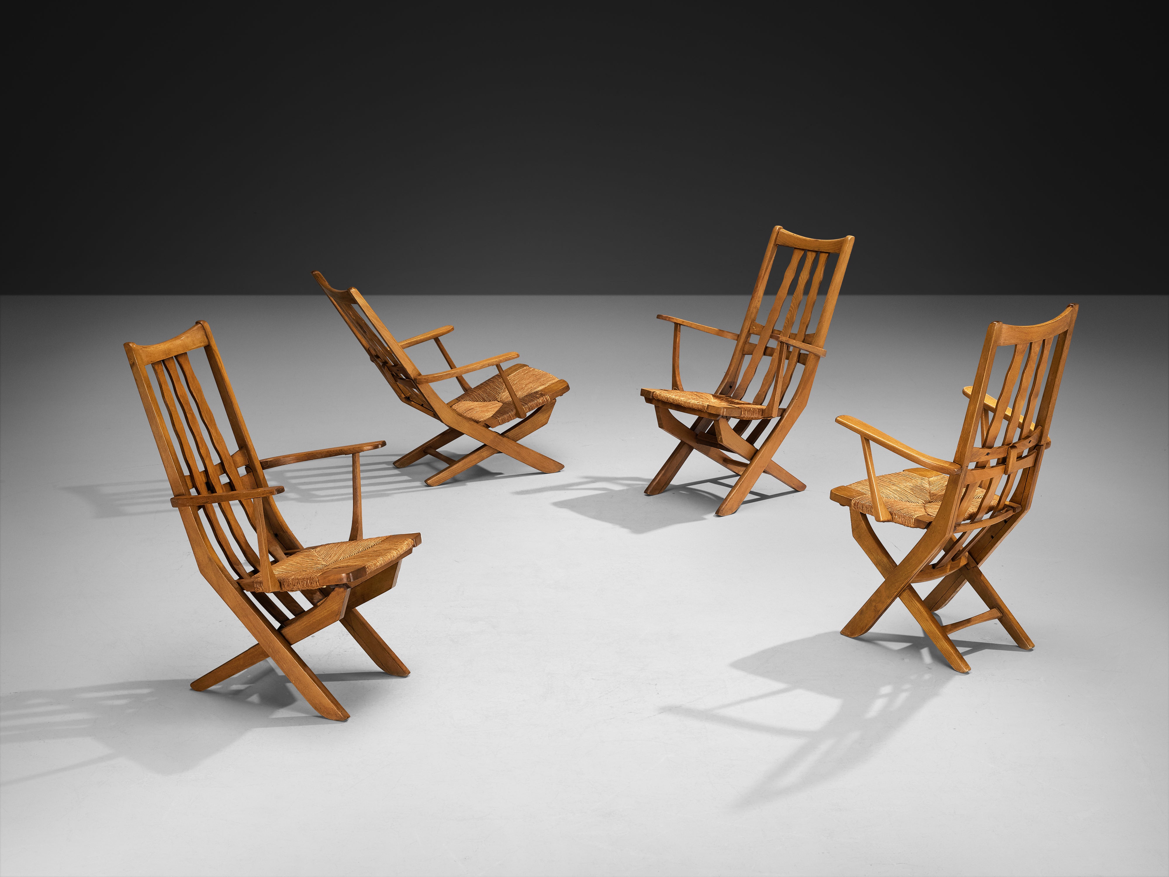 French Mid-Century Angular Lounge Chairs in Teak and Cane