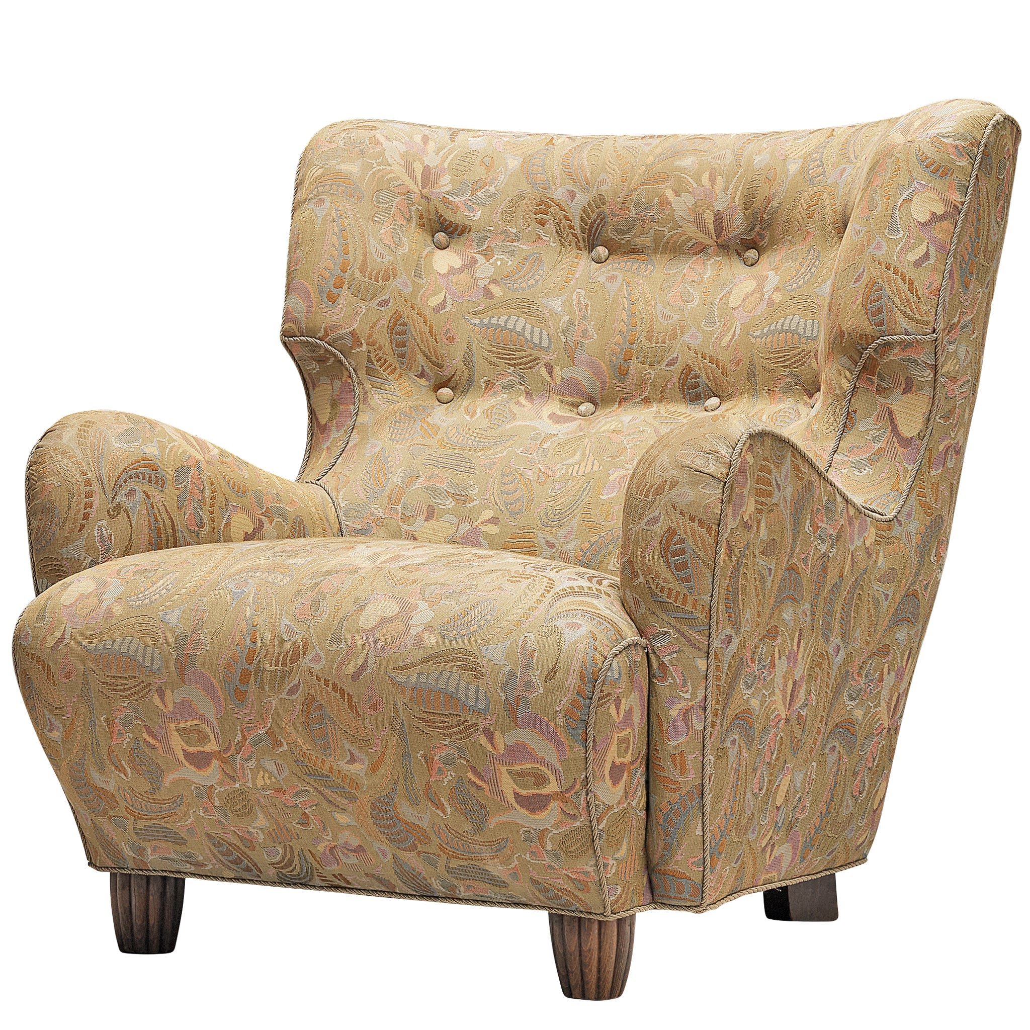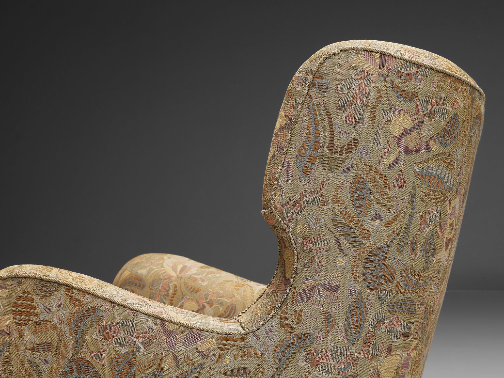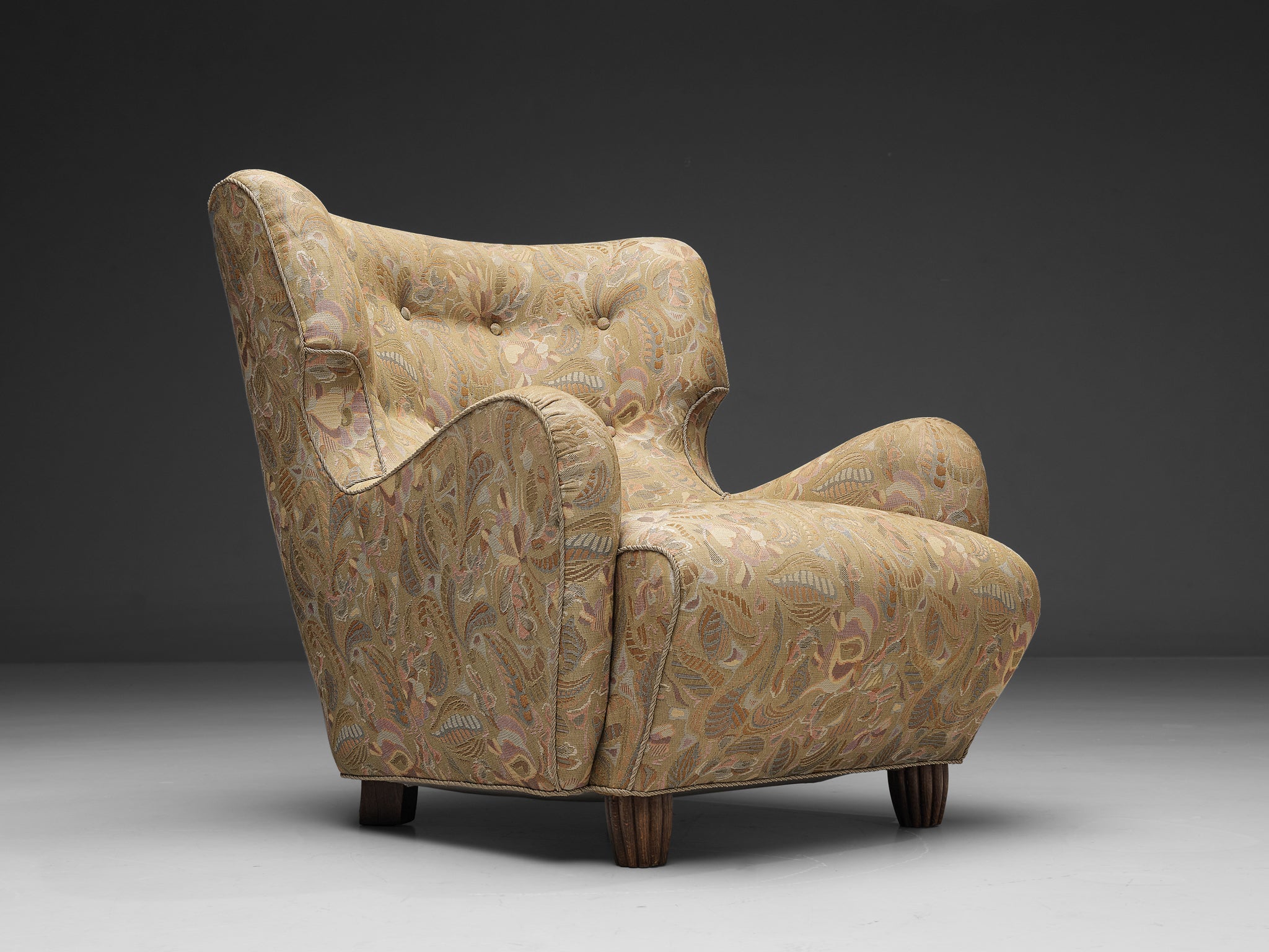 This easy chair with its soft edges, tufted buttons, and sturdy shapes is typical for design of the fifties. The imposing, curvaceous backrest creates a comfortable experience, stimulating the sitter to spend more time on it. The backrest of this chair has modest wings accompanied with bulky, round armrests that makes it possible to lay down your arms comfortably. The chair is upholstered in a decorative fabric with abstract motifs in soft colors dominating the surface. Interesting feature are the contrasted wooden legs.