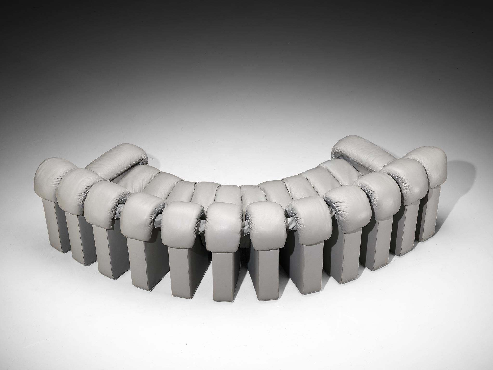 An amazing design by Ueli Berger, Elenora Peduzzi-Riva, Heinz Ulrich and Klaus Vogt for De Sede, Switzerland. This De Sede modular 'Snake' sectional sofa contains twelve elements in original light grey leather upholstery, of which ten centrepieces and two higher armrests. Any number of elements can be zipped together ensuring an endless shape suitable for every room and occasion.