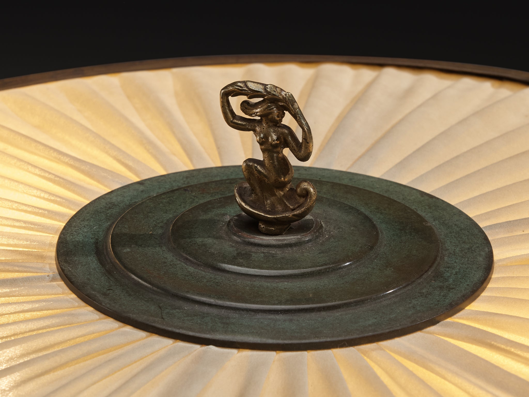This exquisite table lamp, crafted in Scandinavia during the 1930s, is a striking example of refined Art Deco design. Made from brass and bronzed brass, the lamp features a sturdy round foot and a cylindrical pillar adorned with elegant decoration. The alternating bands of raised, highly polished brass contrast beautifully against the darker patinated surfaces, lending a rhythmic and sculptural quality to its form. The shade is encircled in a refined white pleated fabric, softly diffusing the light. This light is crowned with a decorative finial shaped as a graceful woman figure.