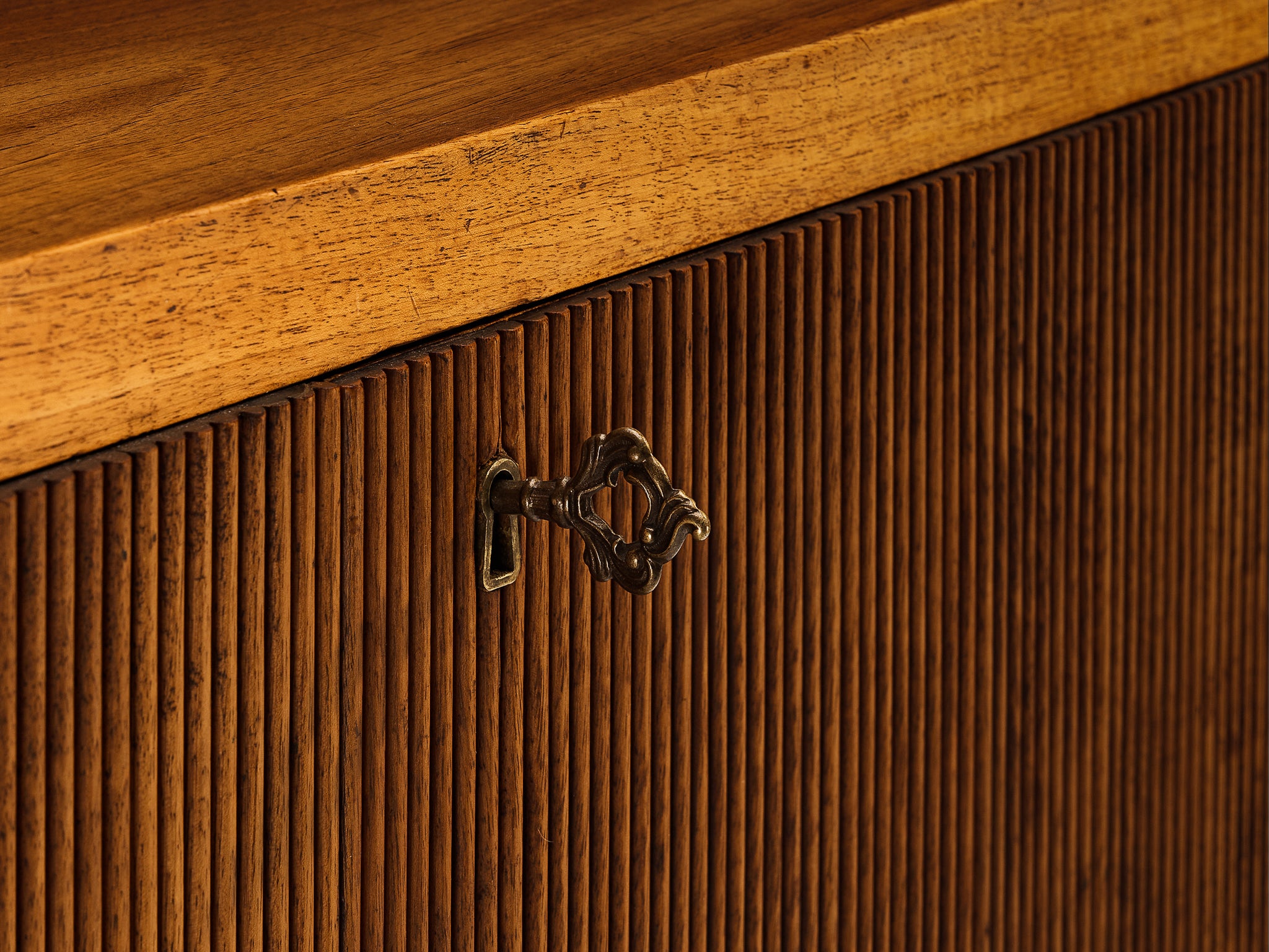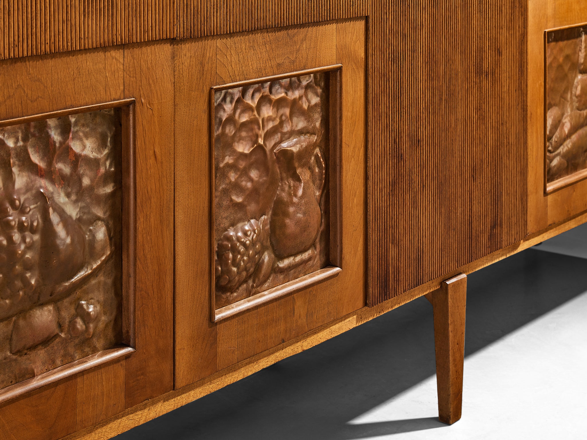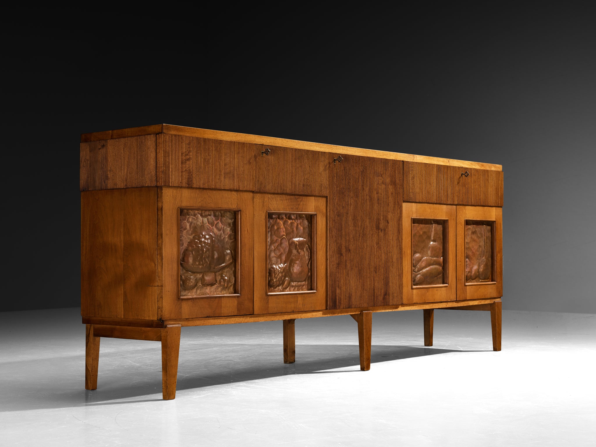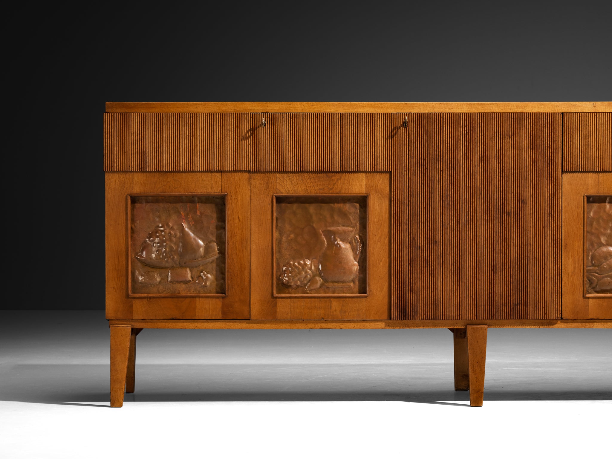 The shape of this 1940s Italian walnut sideboard is firmly rooted in the modernist ethos of the period, yet it carries with it a tactile warmth and a sculptural presence. The front is divided into alternating vertical sections of ribbed grissinato carving and smooth walnut planes, which create a subtle play of shadow and linear rhythm. At the heart of this cabinet are four square copper reliefs set into the lower cabinet doors, showcasing a variety of still lifes intricately formed and hammered. The walnut wood, with its warm color and expressive grains, stands out magnificently, enhancing the piece's overall allure. This Italian masterpiece captures the very essence of Italian modern design, blending elegant form with intricate detail.