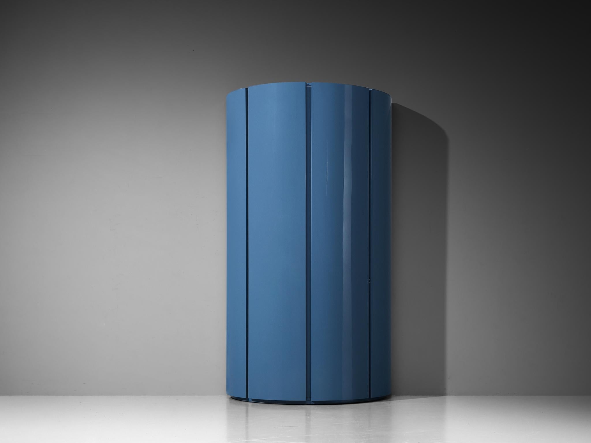 The present cabinet exemplifies Salvati and Tresoldi's philosophy on living space. It features a half-column cylindrical structure painted in a dazzling lilac color, embodying their commitment to vibrant, symbolic hues. This storage unit was part of an Italian apartment interior designed by Salvati and Tresoldi, which included other pieces that spoke the same design language. The curved door panels open to reveal multiple shelves structured along its length with an additional drawer, showcasing their innovative approach to combining form and function within a harmonious, playful space.