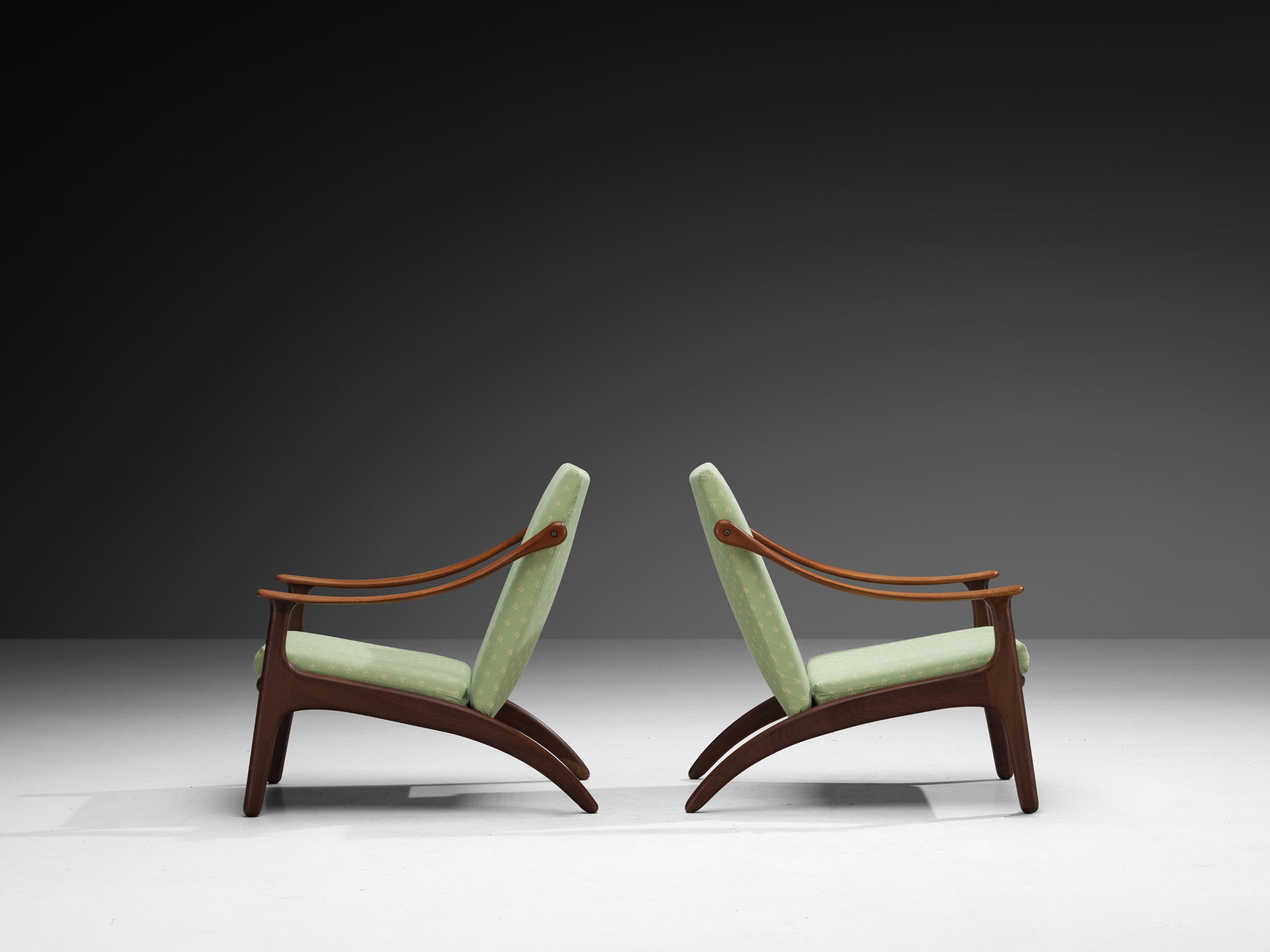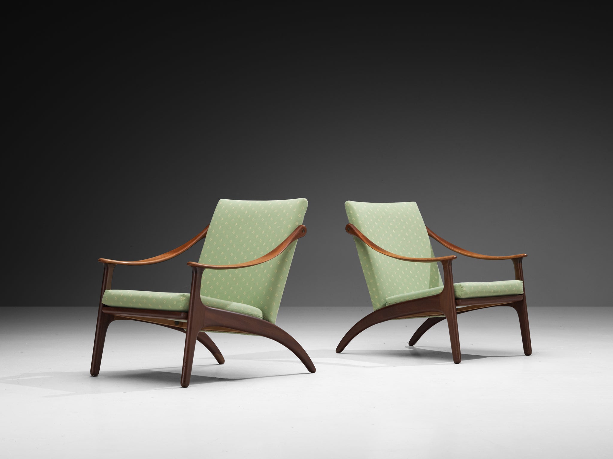 Arne Hovmand-Olsen and P. Mikkelsen pair of lounge chairs, teak, fabric, Denmark, 1950s