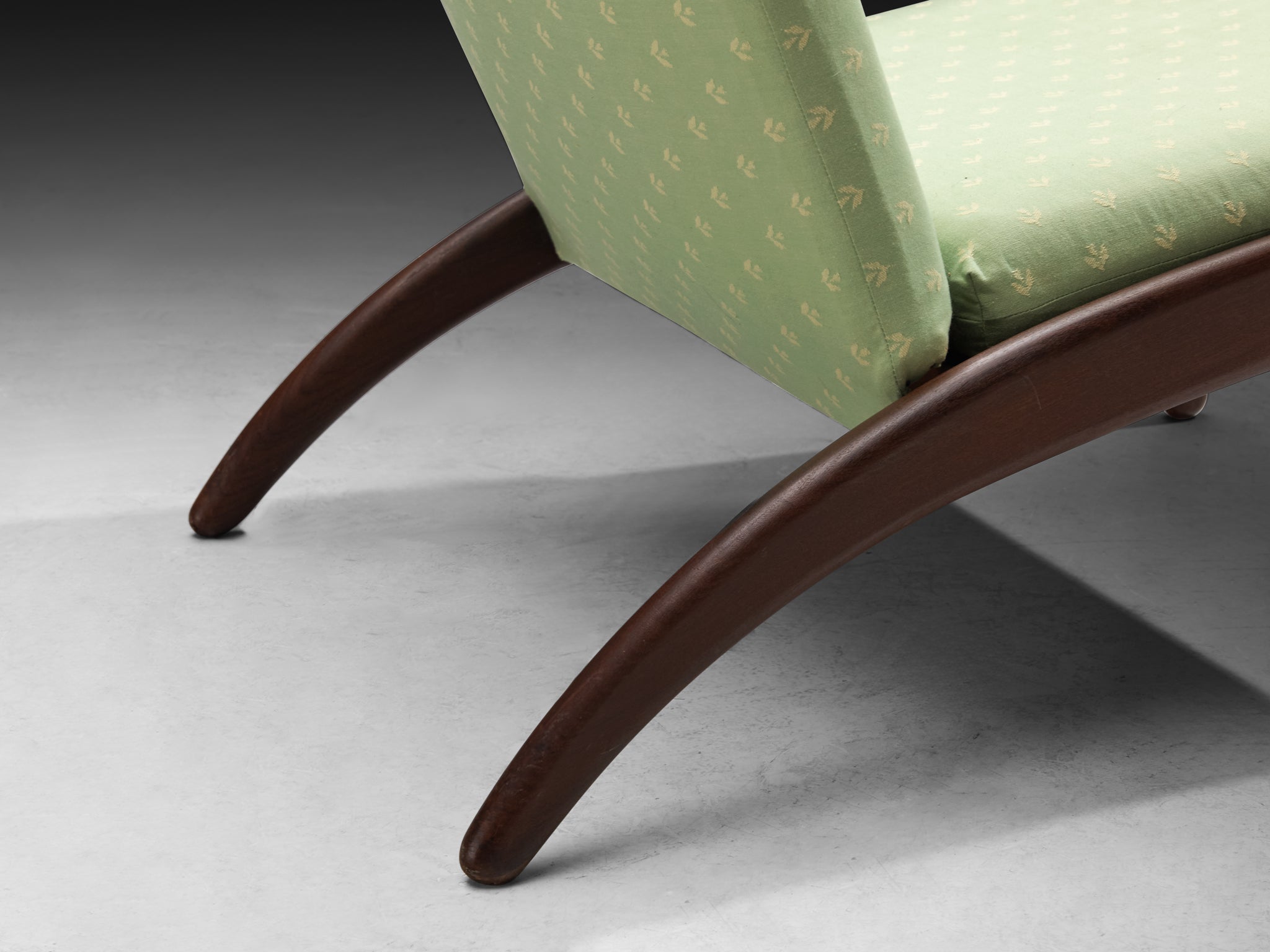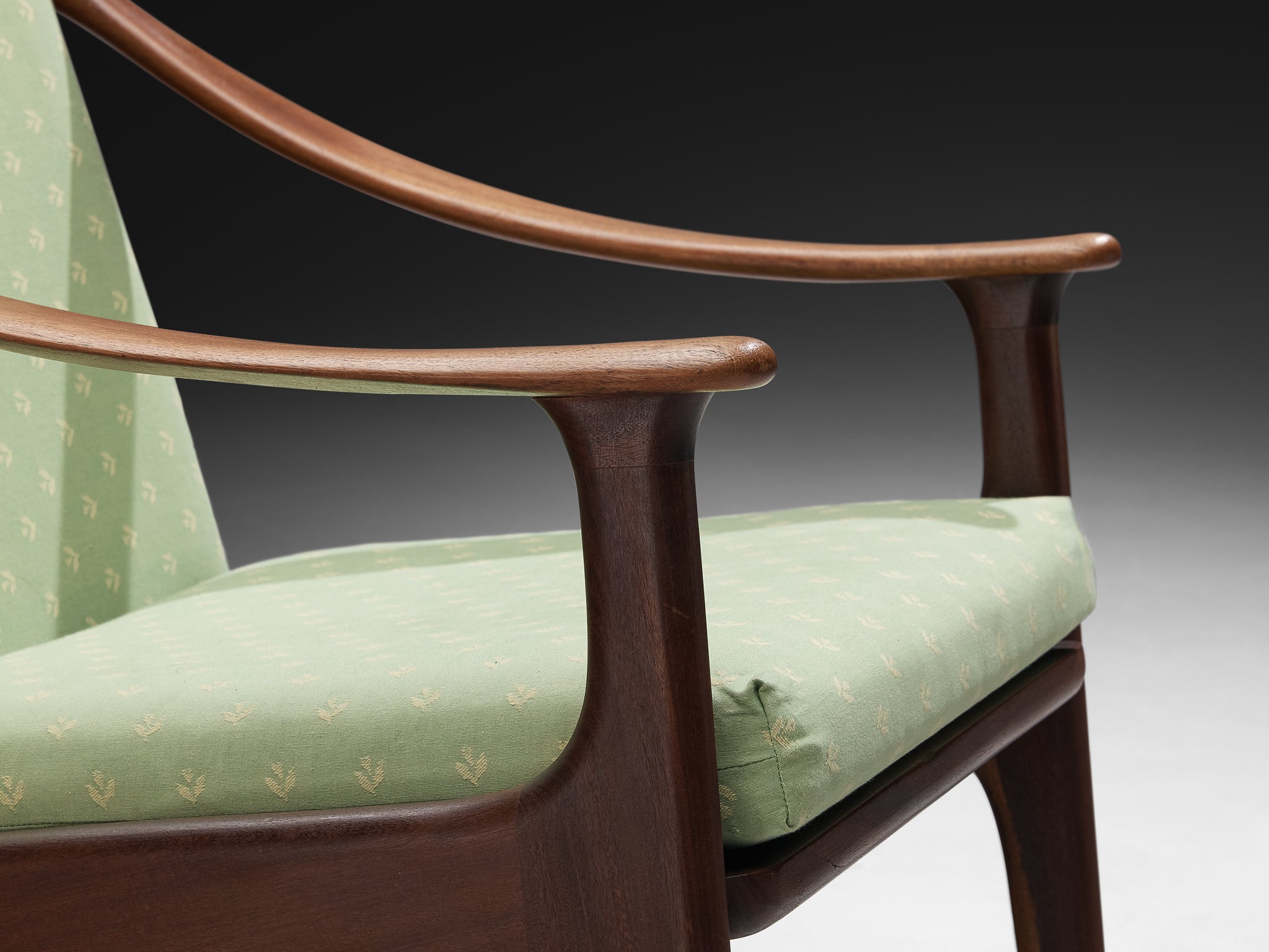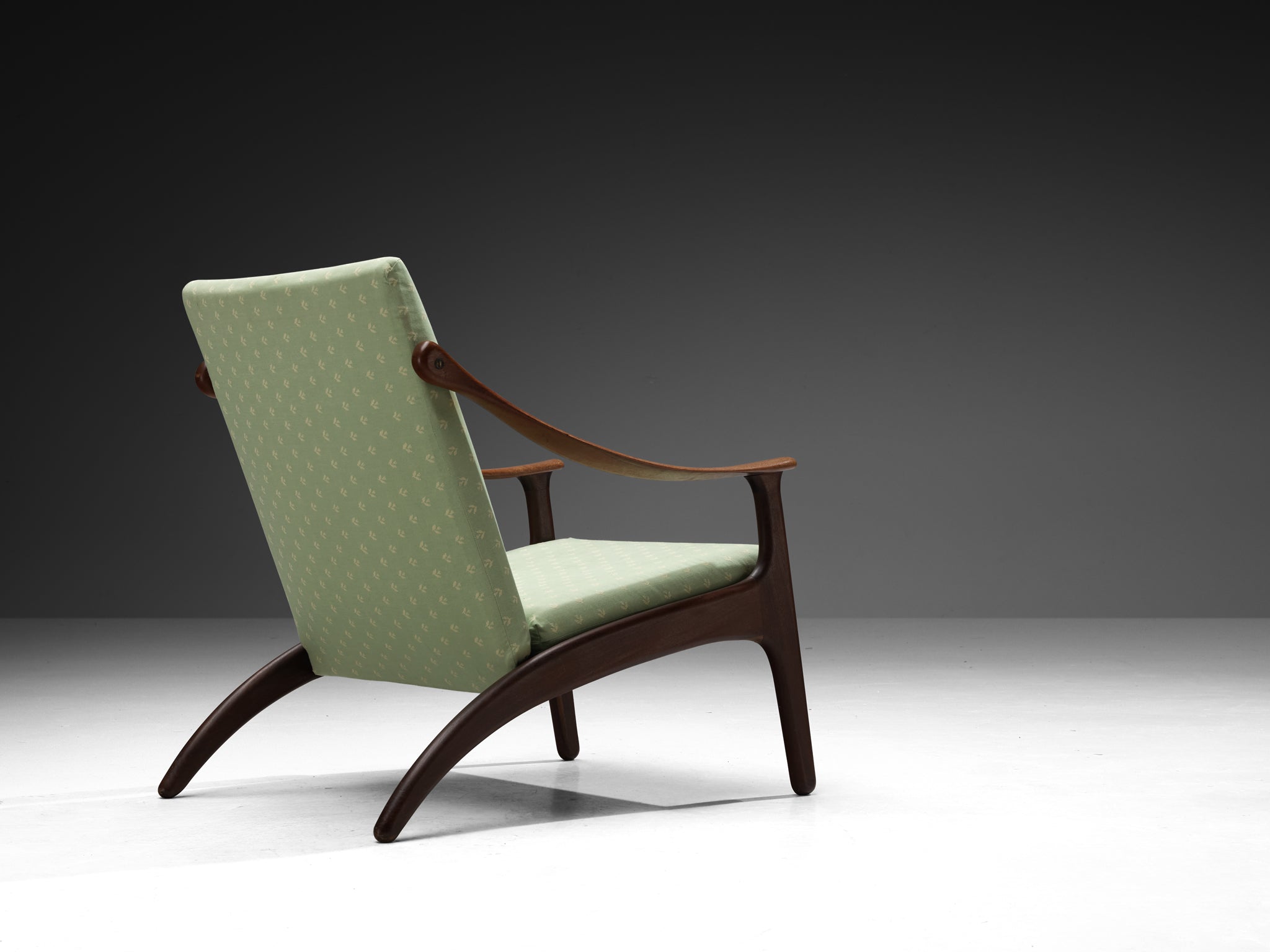 This exquisite pair of lounge chairs designed by Arne Hovmand Olsen for P Mikkelsen in the 1950s is a striking example of Danish craftsmanship. The chairs feature gracefully sculpted teak frames that showcase organic curves and refined joinery. The elegant armrests and angled legs create a sense of movement and lightness, while the green fabric upholstery, subtly patterned, adds a touch of softness and sophistication.