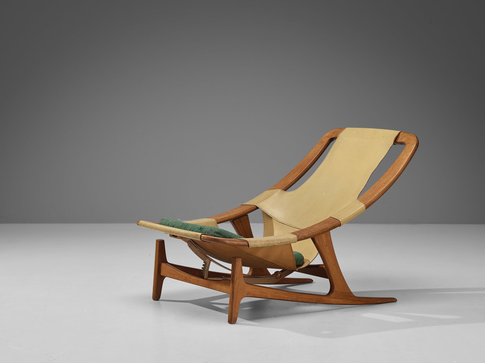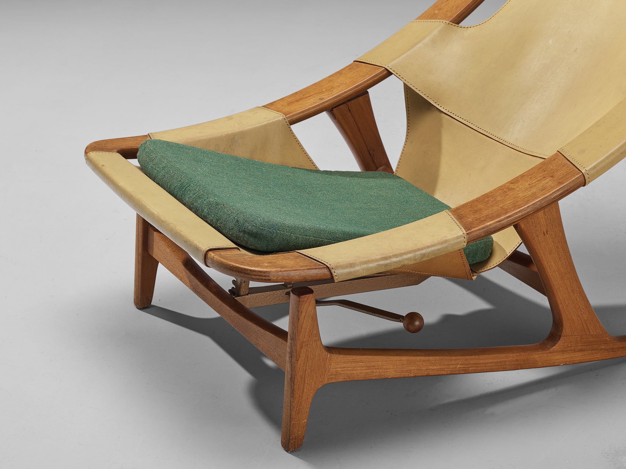This easy chair is designed by Norwegian designer Arne F. Tidemand Ruud and produced by Norwegian company Norcraft. This chair is very dynamic due its design and shapes. The teak frame shows beautiful curves and lines. Beautifully crafted and detailed are the sled legs. Both the combination of materials and the overall shape reminds of a hunting chair. Camel colored saddle leather is used for the seating that fits perfectly around the body. An inventive feature of this piece is the adjustable seat, that can be put in a relaxed position as well.