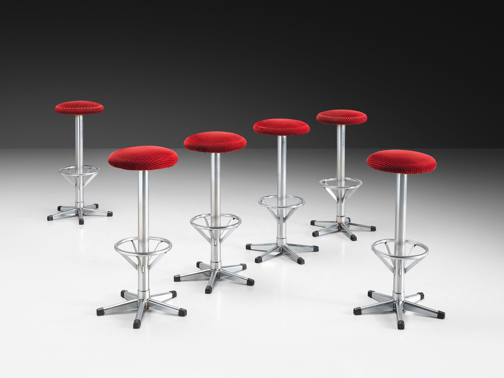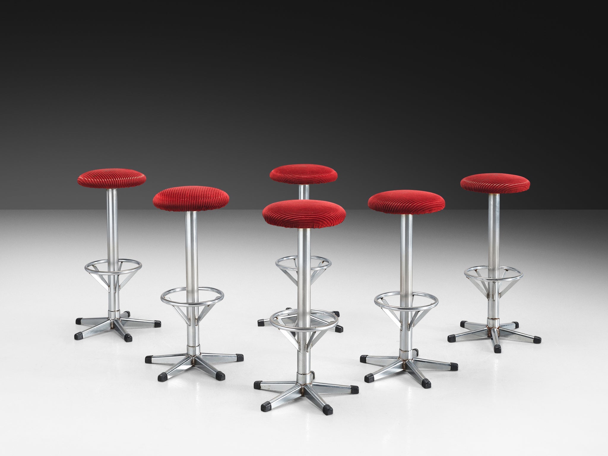 Exquisite barstools in red velvet upholstery. Due to the soft seat and back, these chairs provide a very pleasant seating comfort. The five-legged footrest emphasizes the functional design. The circle is the repetitive pattern in this design, as seen in footrest and seating. Well-made, sturdy and durable pieces, highly suitable for both residential bars and public places.