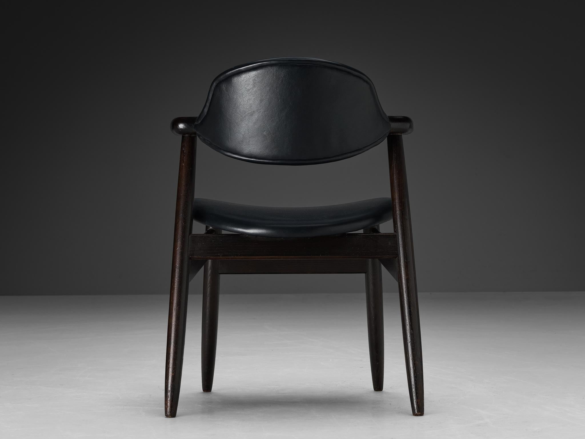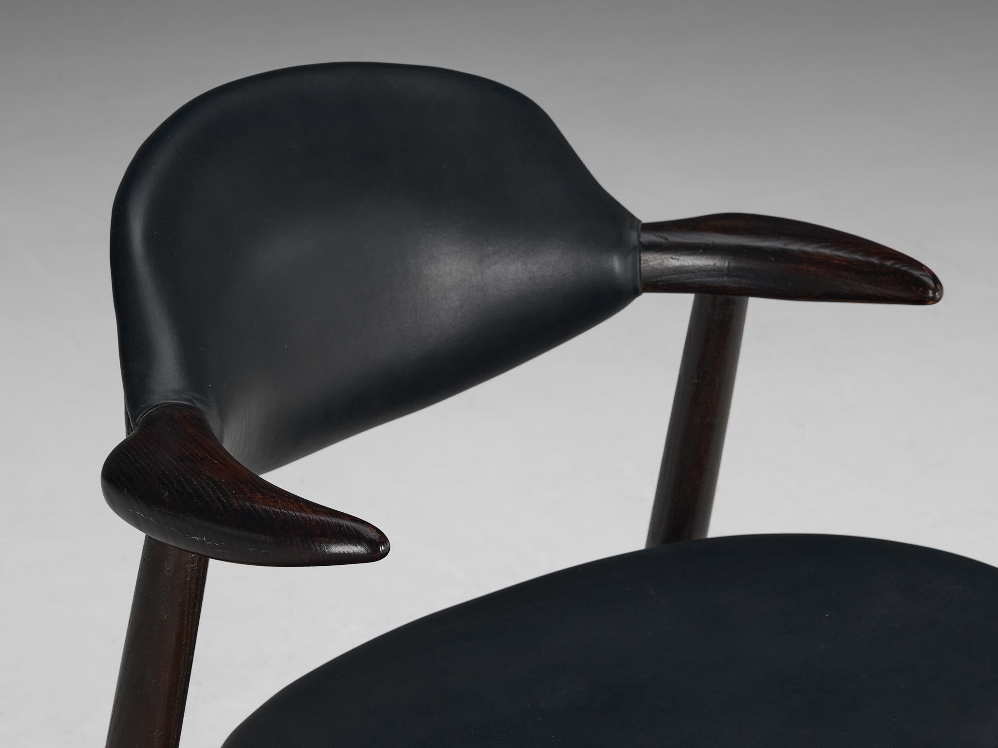 This dining chair from Dutch origin owes its name to the armrests that are based on the shape of a bull horn. The wooden frame illustrates a dynamic construction of sharp lines and slender shapes, contributing to its sturdy character. The upholstery of the seat and backrest in black leatherette combines wonderfully with the dark teak frame.