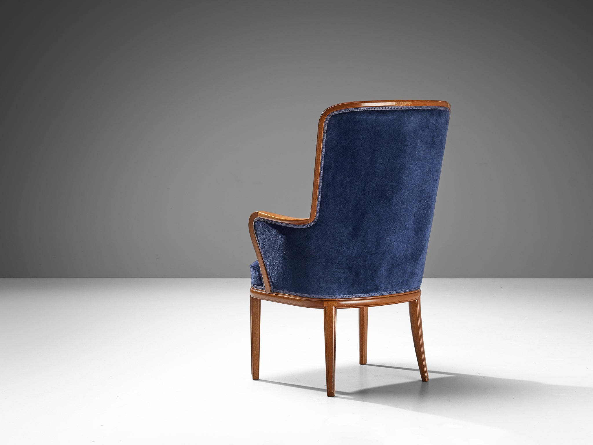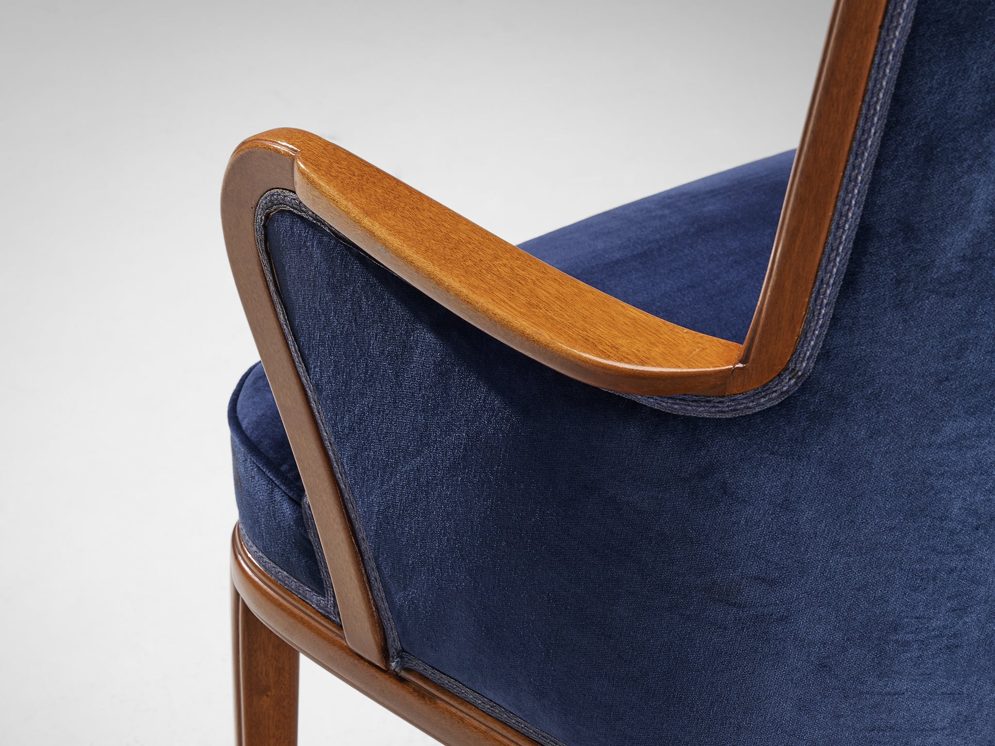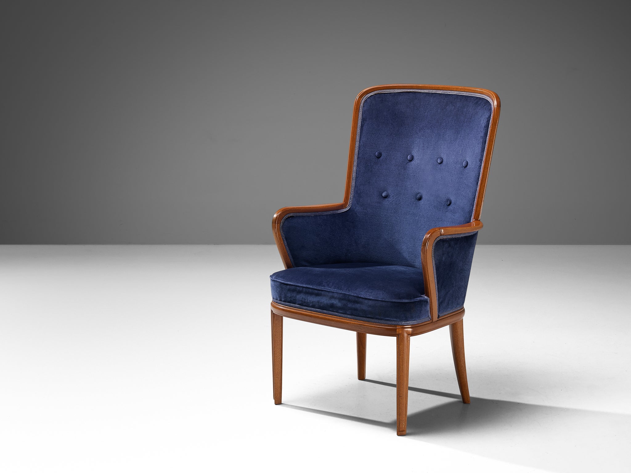 Carl Malmsten High Back Chair in Mahogany and Blue Upholstery