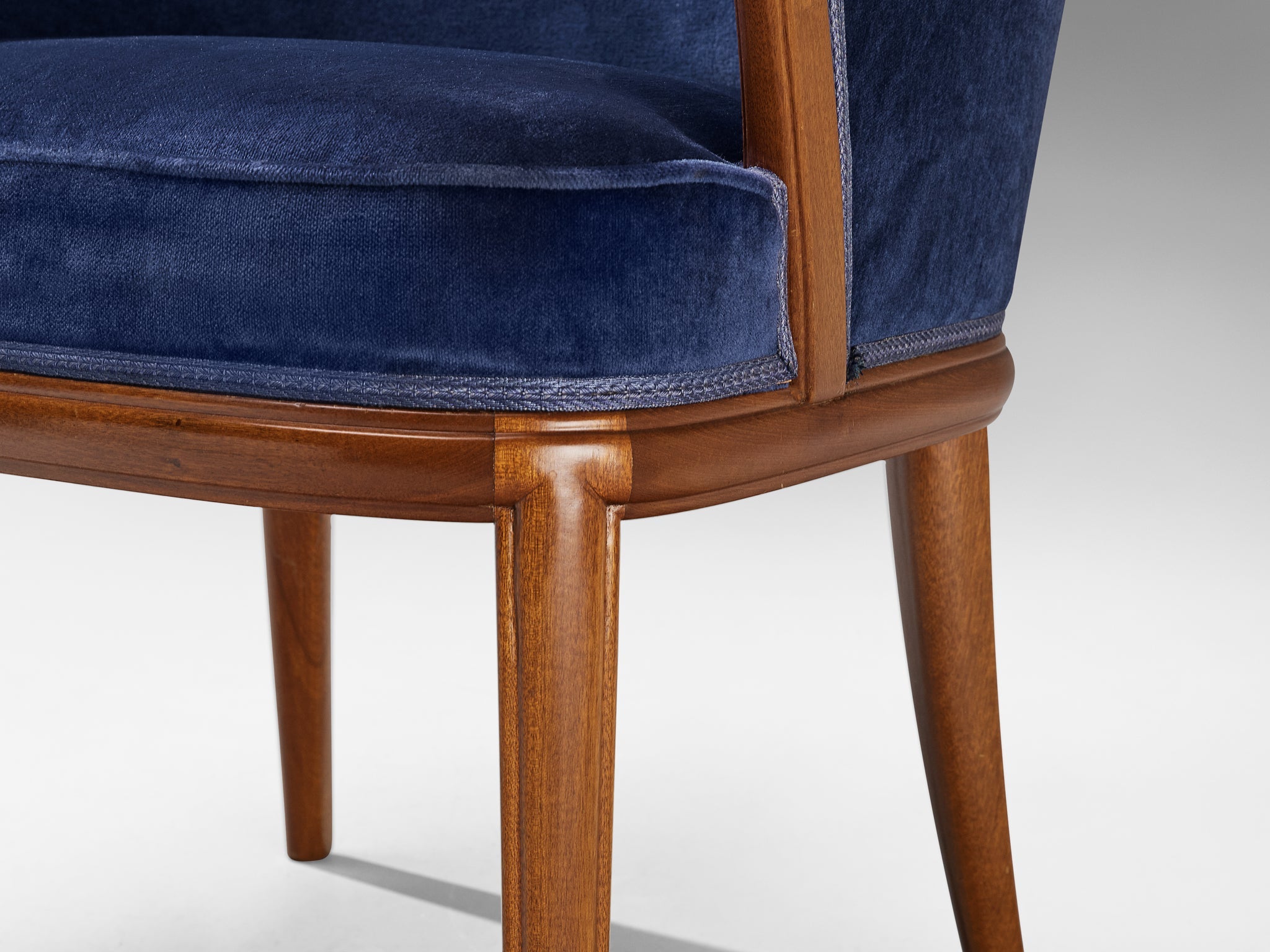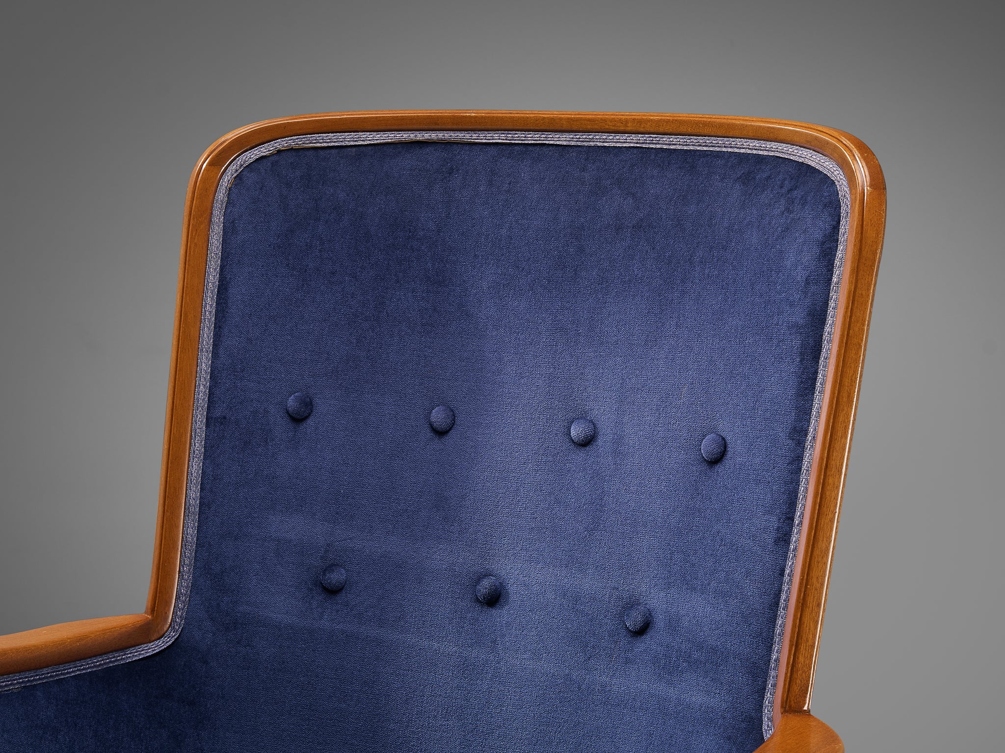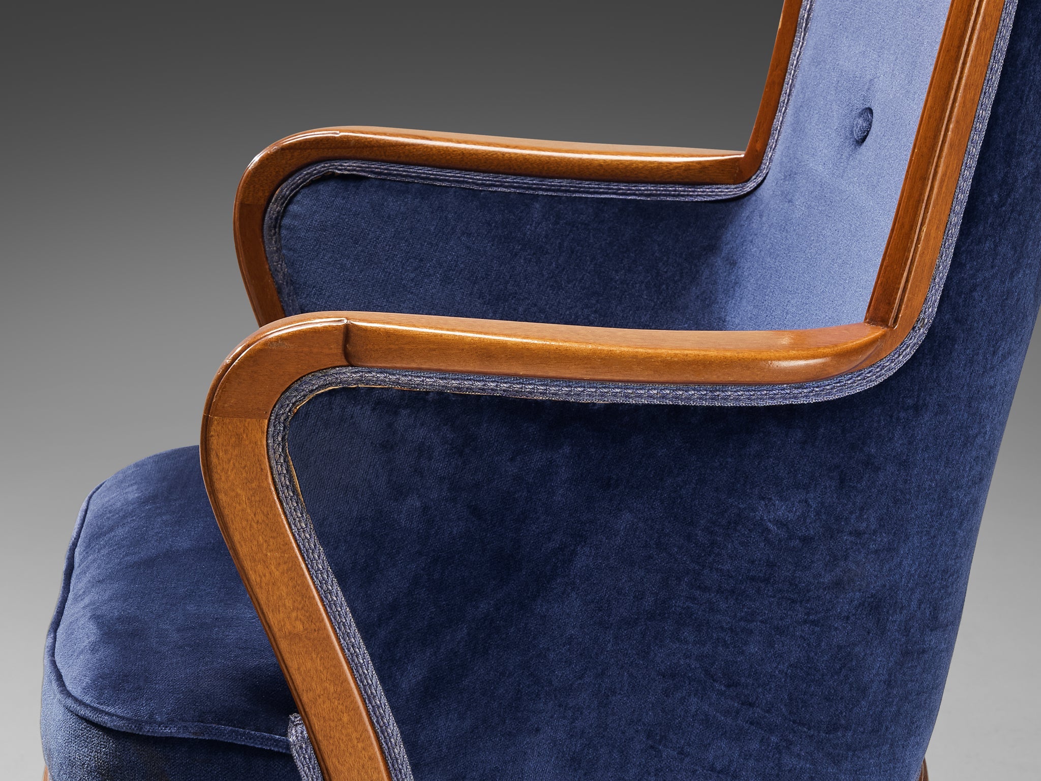 Carl Malmsten High Back Chair in Mahogany and Blue Upholstery
