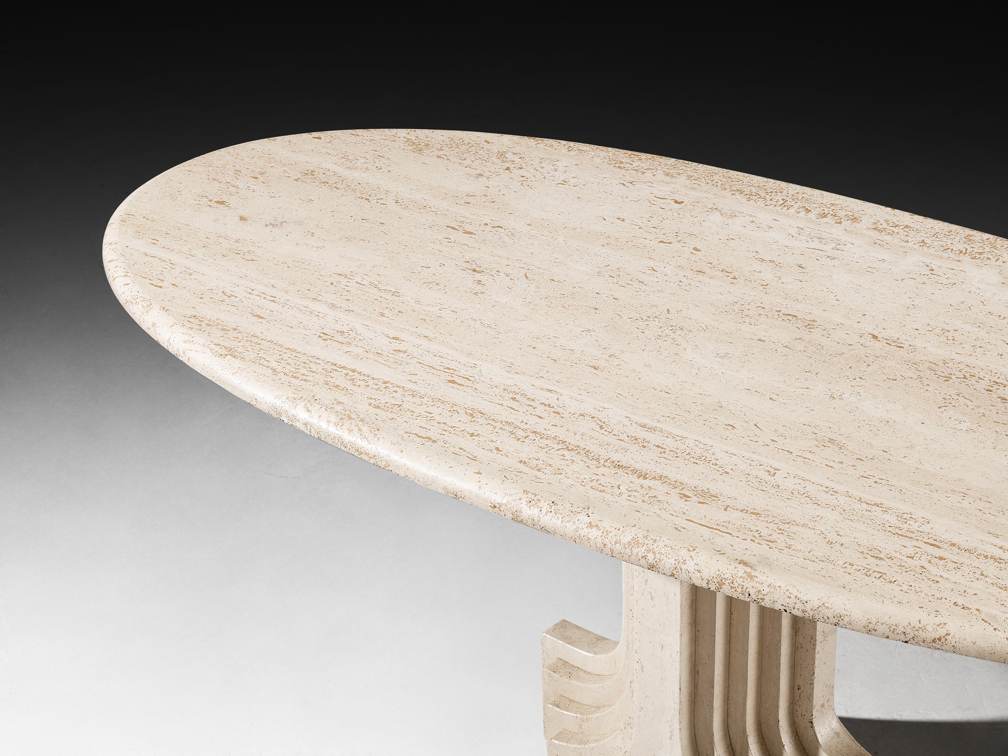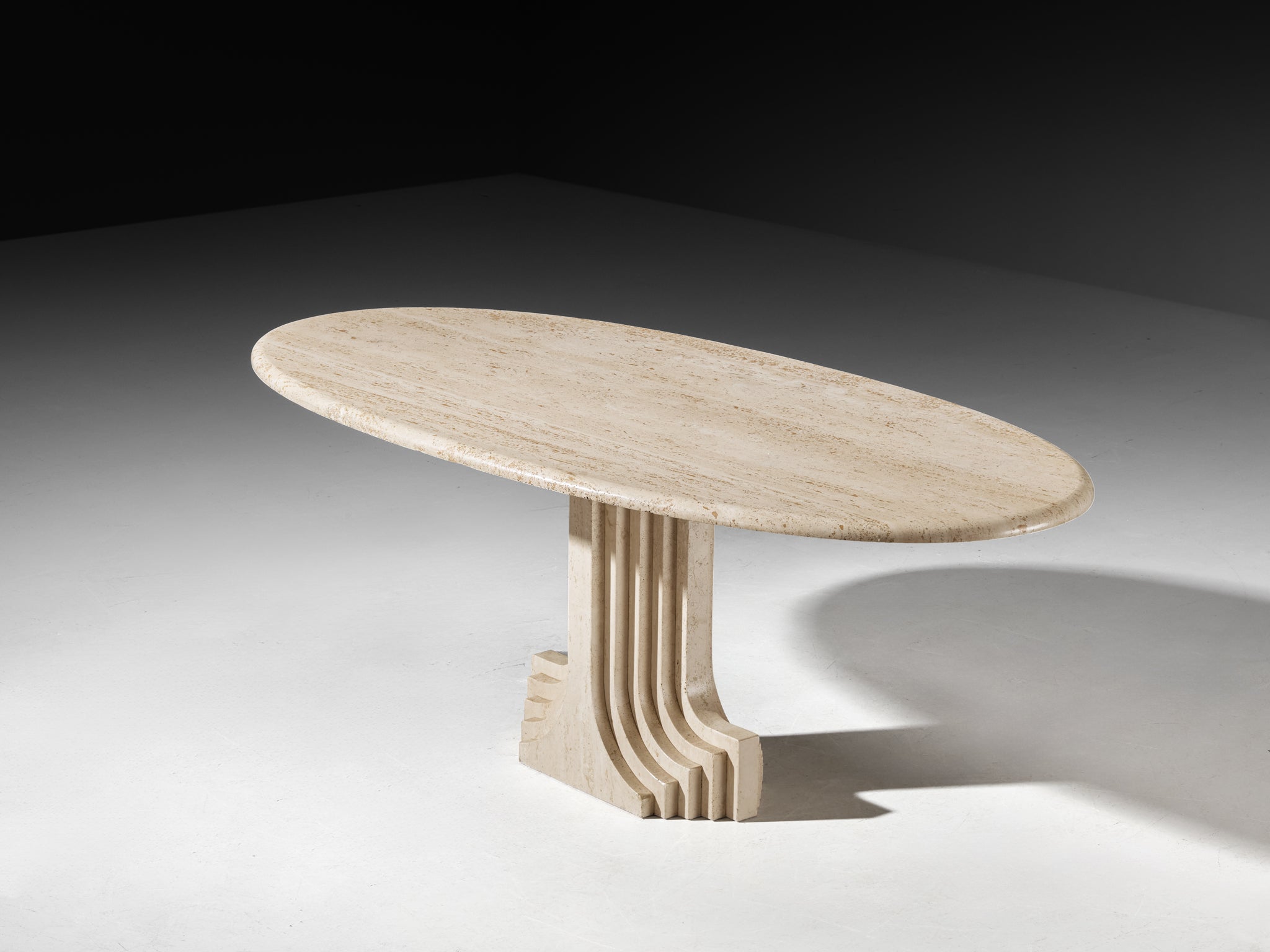 Architectural dining table made by Cattelan Italia in 1980. This model 'Argo' dining table shows a slender oval tabletop, beautifully shaped base in a wave like structure creating a sense of excitement. The Post-modern design period in which this table is designed and made, is notable for its use of luxurious materials like travertine, which was an innovative trend at the time. Anticipating a trend toward classic forms and enduring quality that soon gained lasting success.