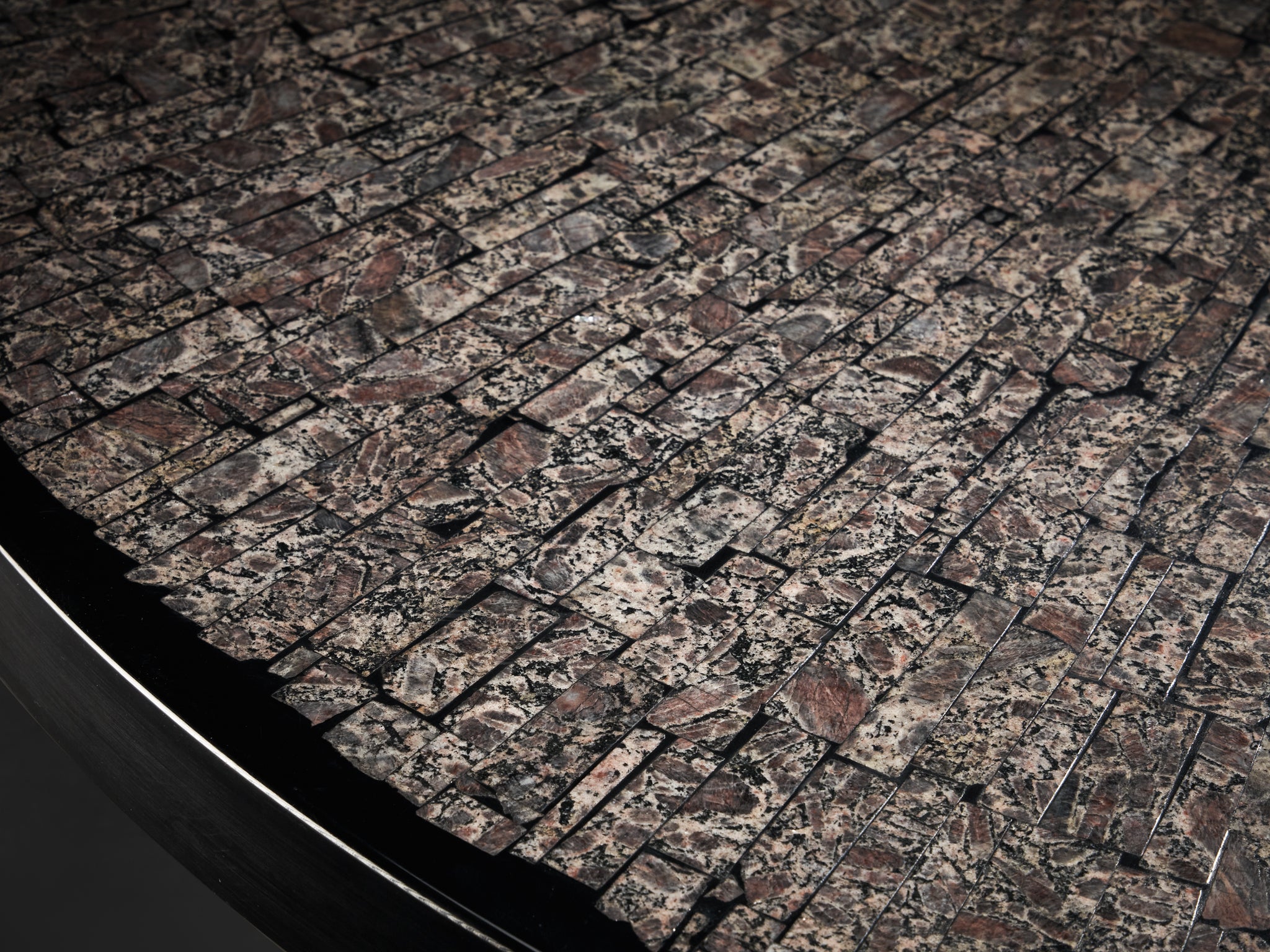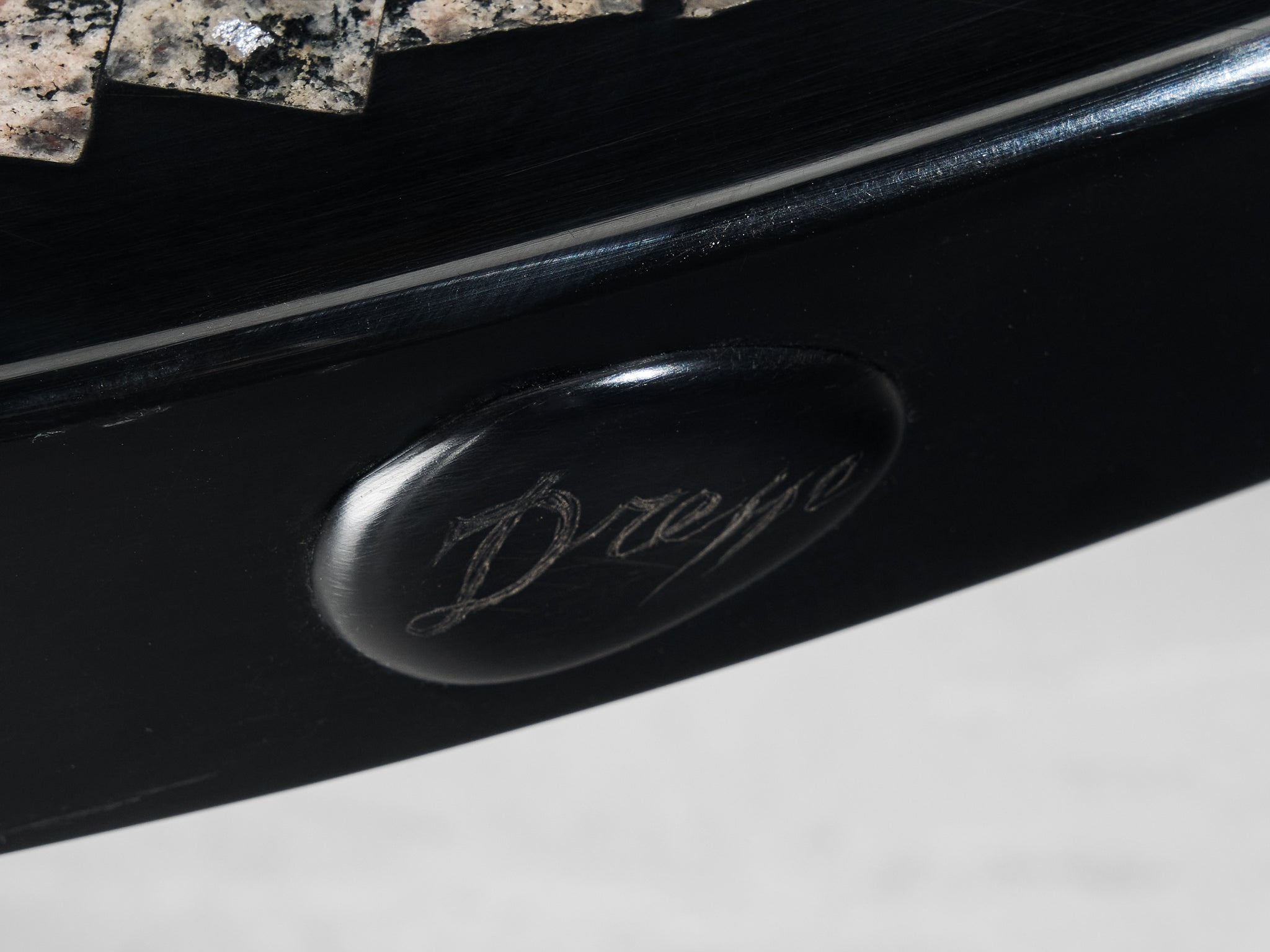 A striking round table designed by the hand of Belgian artist Jean Claude Dresse, dating back to the 1970s. This remarkable piece features a granite inlayed top sealed with resin, creating a captivating interplay of material and texture. Dresse’s signature craftsmanship is evident throughout, blending sculptural elegance with refined detail. The table has an almost monumental appearance by means of the architectural appearance of the legs that lift the top in a vigorous manner. Due to the artistic use of materials and texture combinations, the coffee table has a strong decorative character and hits the border between piece of art and furniture design.