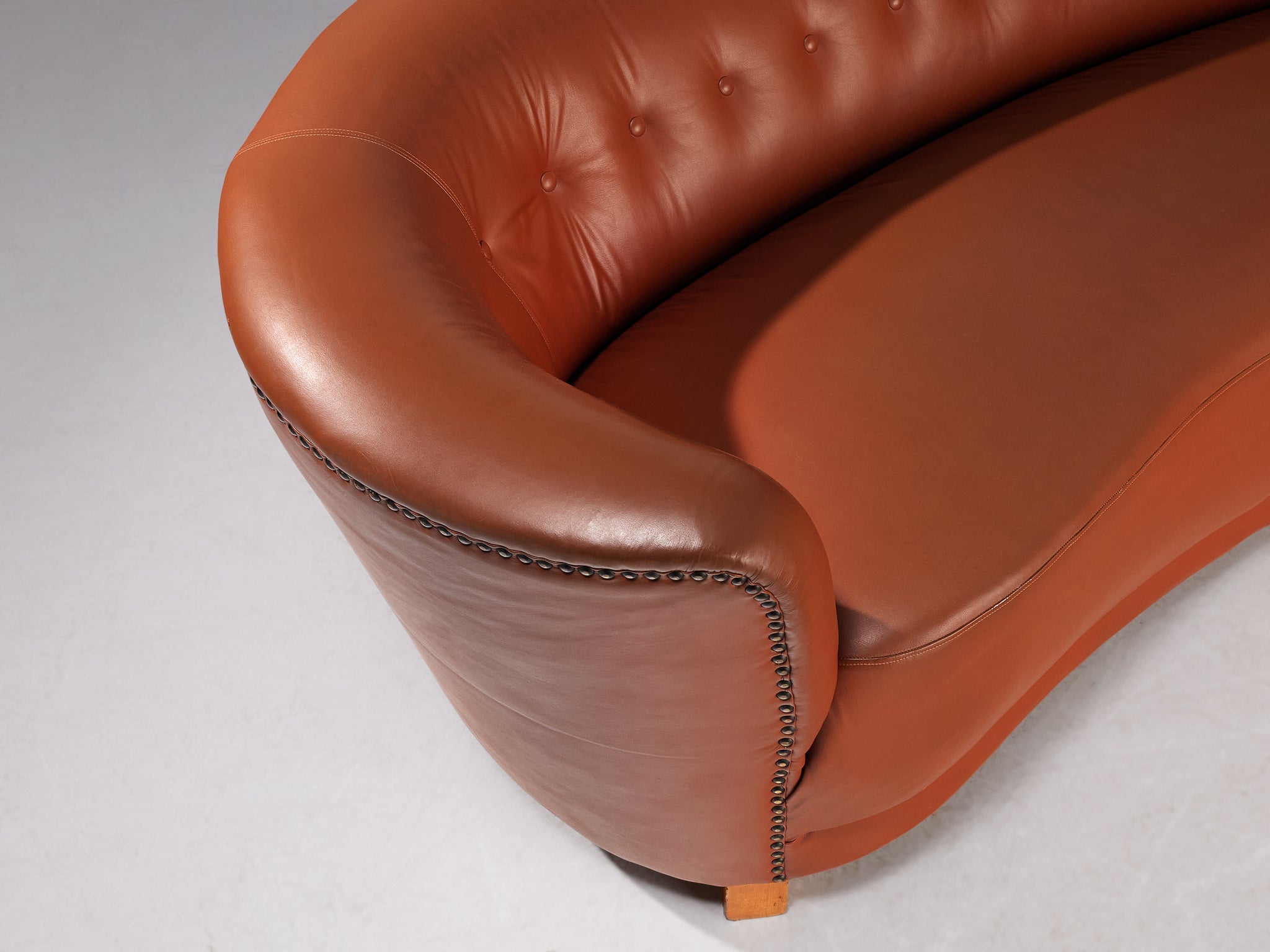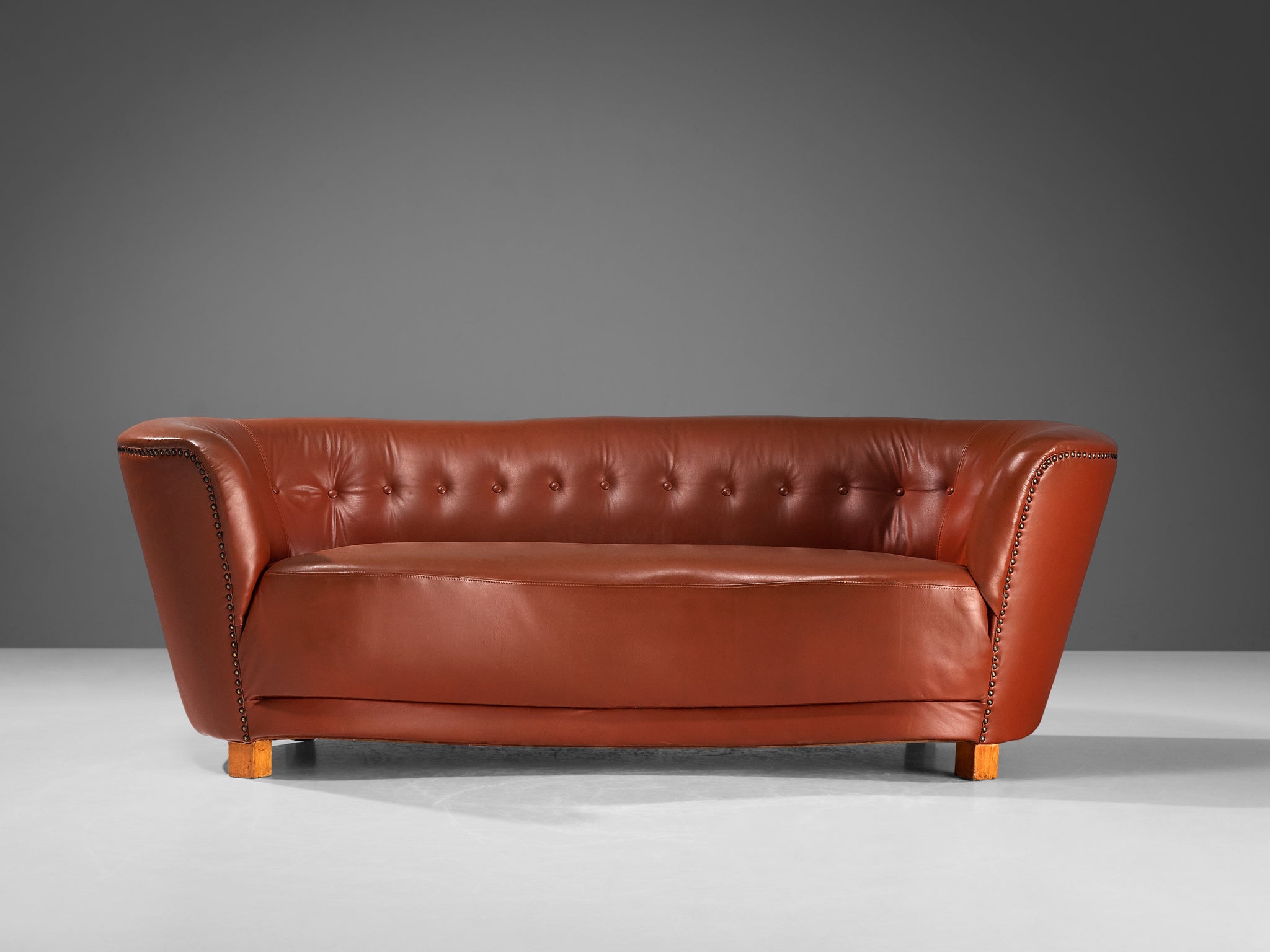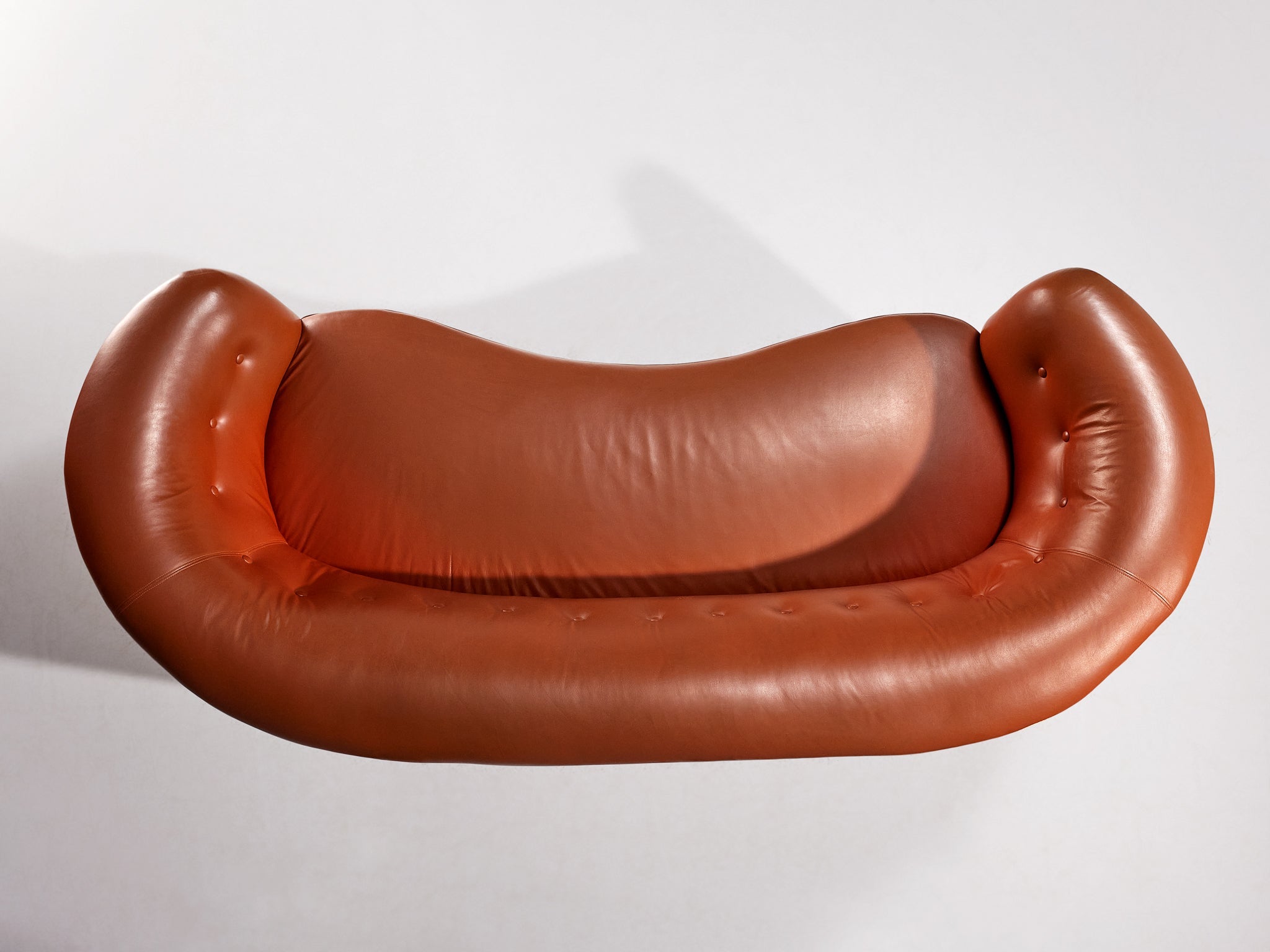 Danish Banana Sofa in Cognac Brown Faux Leather