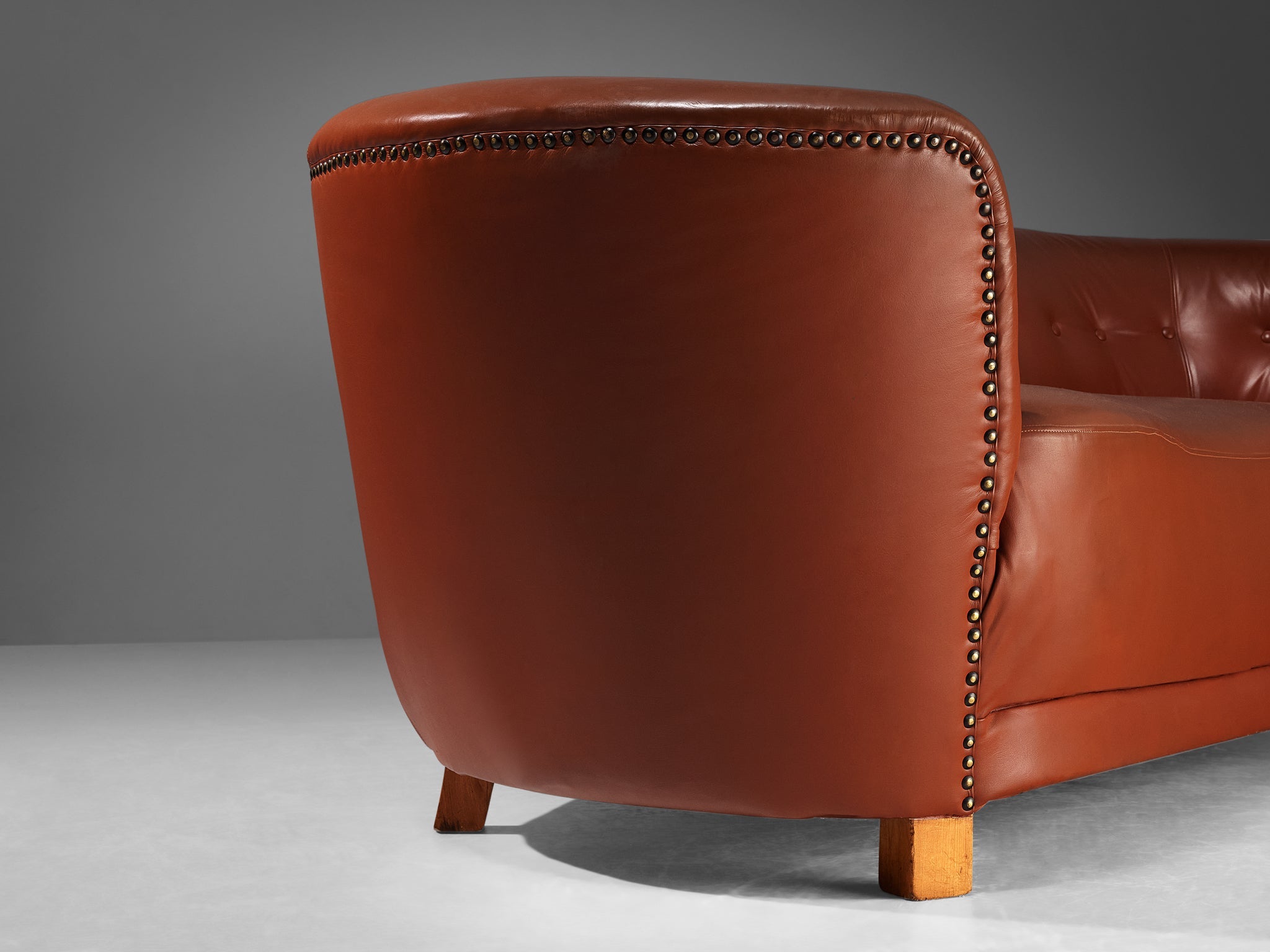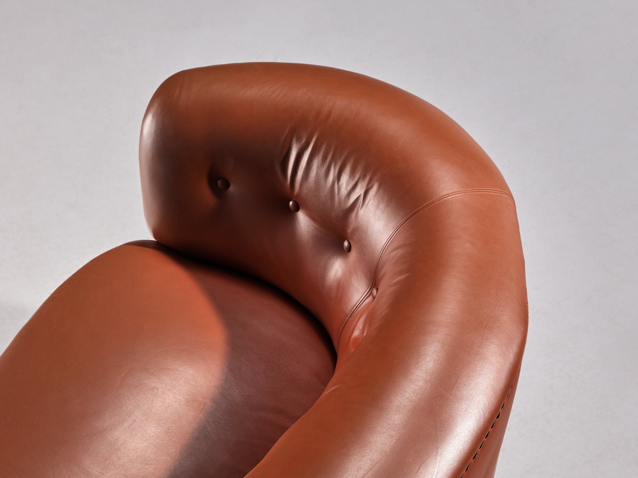This voluptuous sofa is based on a solid construction of round shapes and curvaceous lines. The seating area and the backrest are organically shaped and together with the absence of strict angles, the sofa attains a sculptural expression. The corpus is executed in a cognac brown faux leather and decorated with brass studs that emphasize the delicate form of the sofa. The piece shows traits of traditional furniture yet also has a contemporary touch.