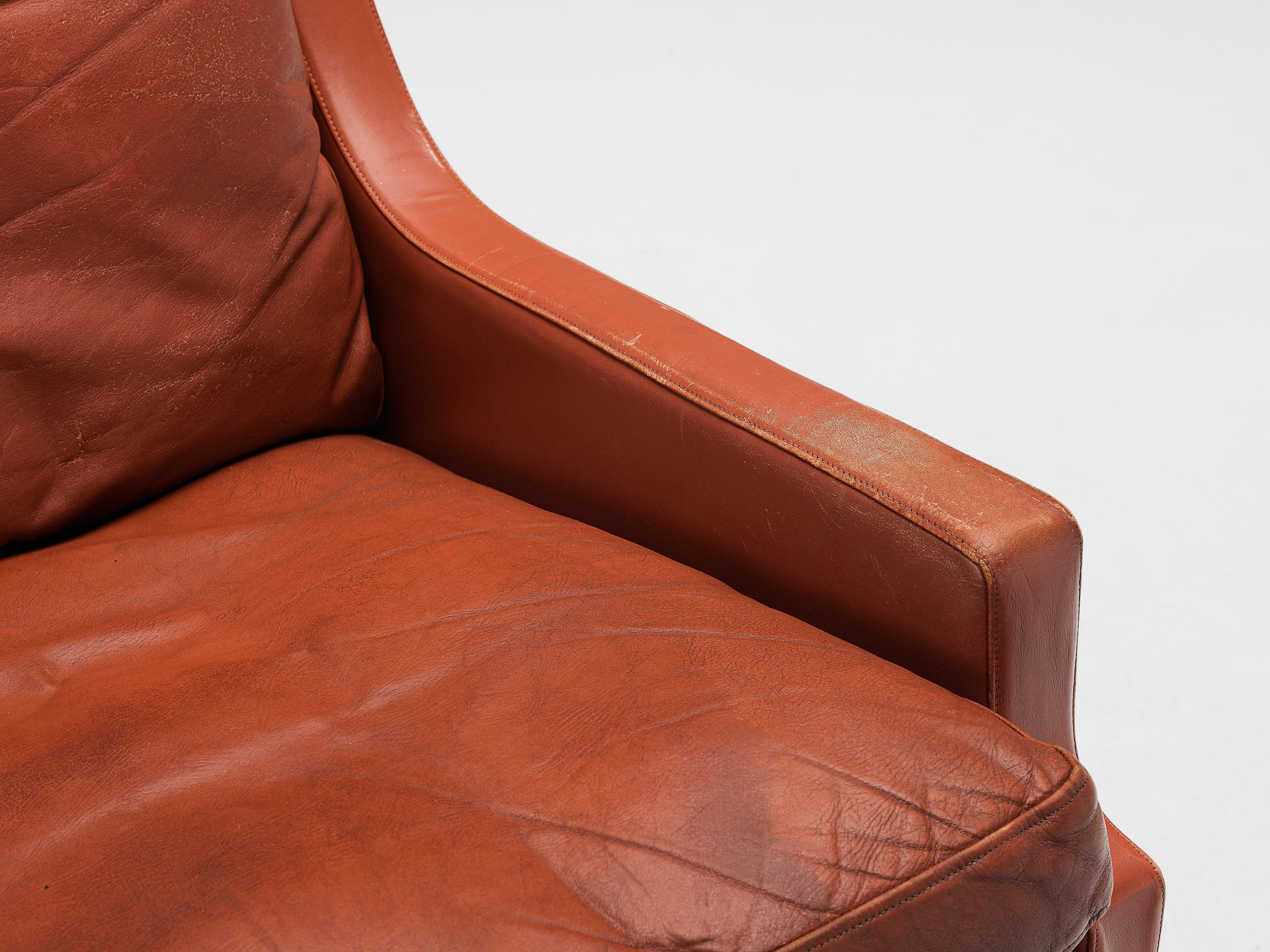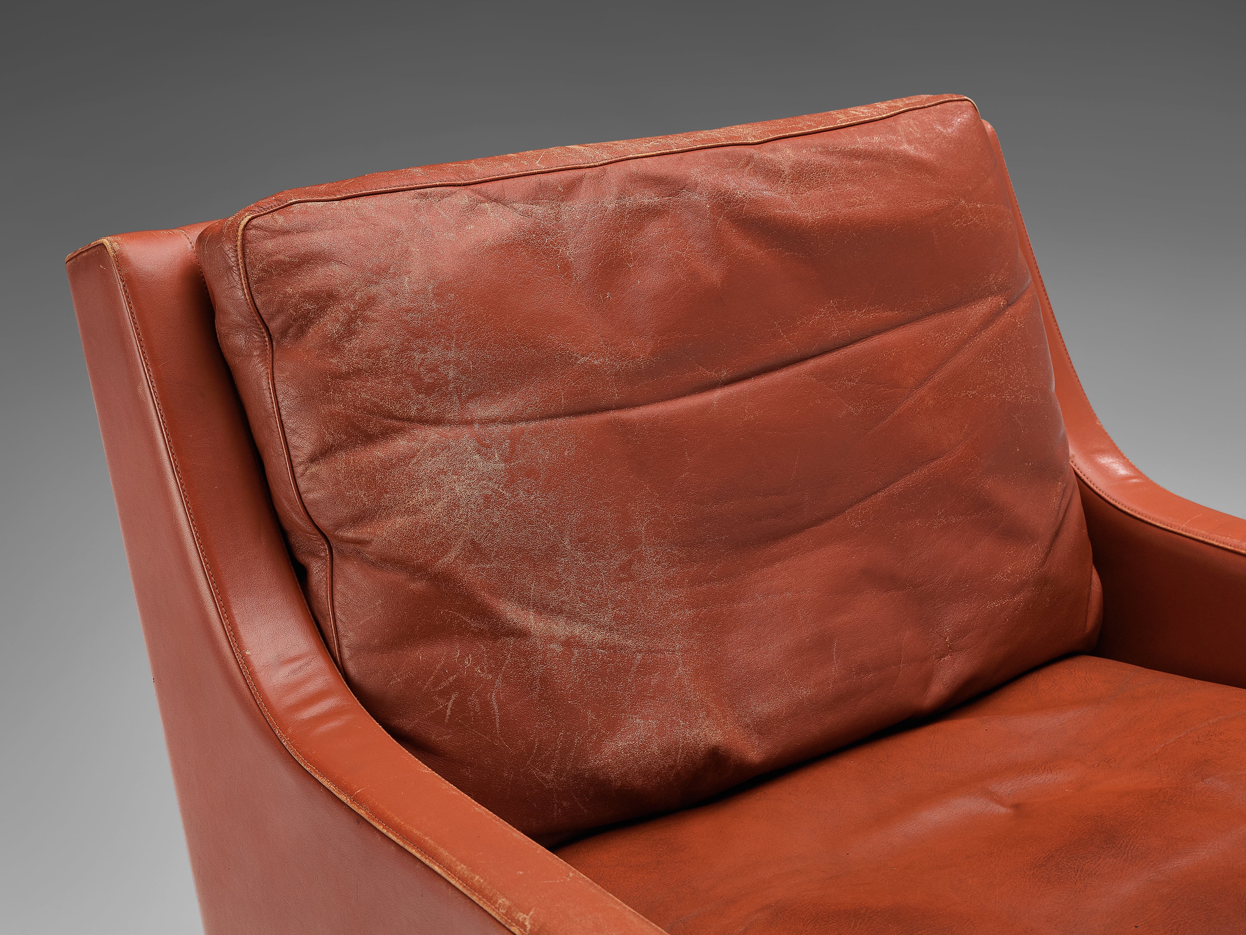 Lounge chair with visual references to Børge Morgensen’s designs. The slightly tilted backrest is joined by very low armrests which frame the seat. A patinated seat and backrest cushion provides comfort. Four legs in oak lift the chair up.