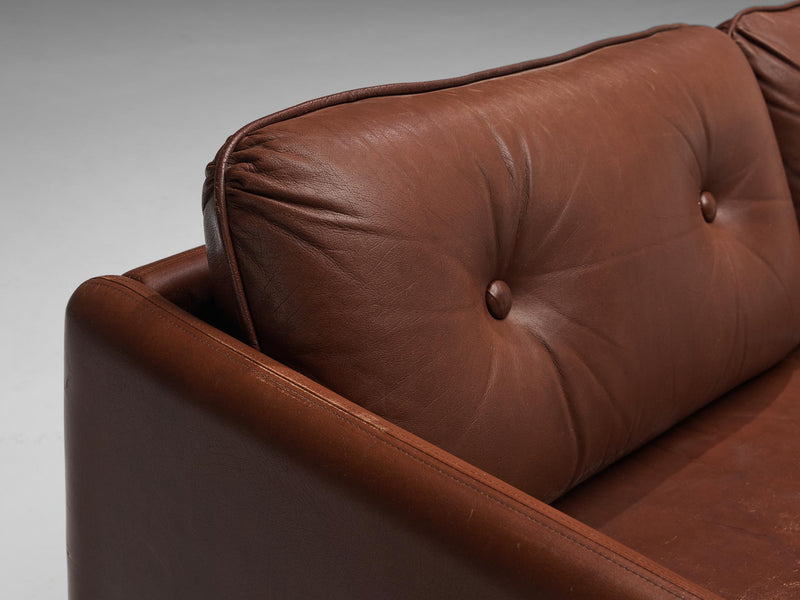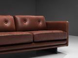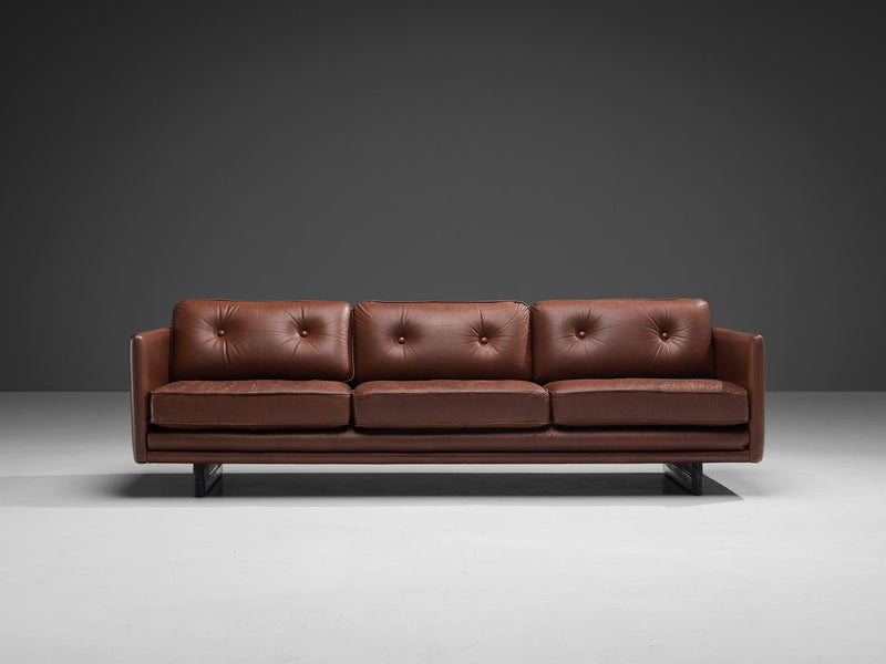 This comfortable three seater sofa holds a robust, sturdy character. The solid sled base is made of black lacquered oak. The sofa itself is executed in a thick, high-quality chestnut brown leather. The tufted cushions contribute to the elegant design of this Scandinavian sofa.