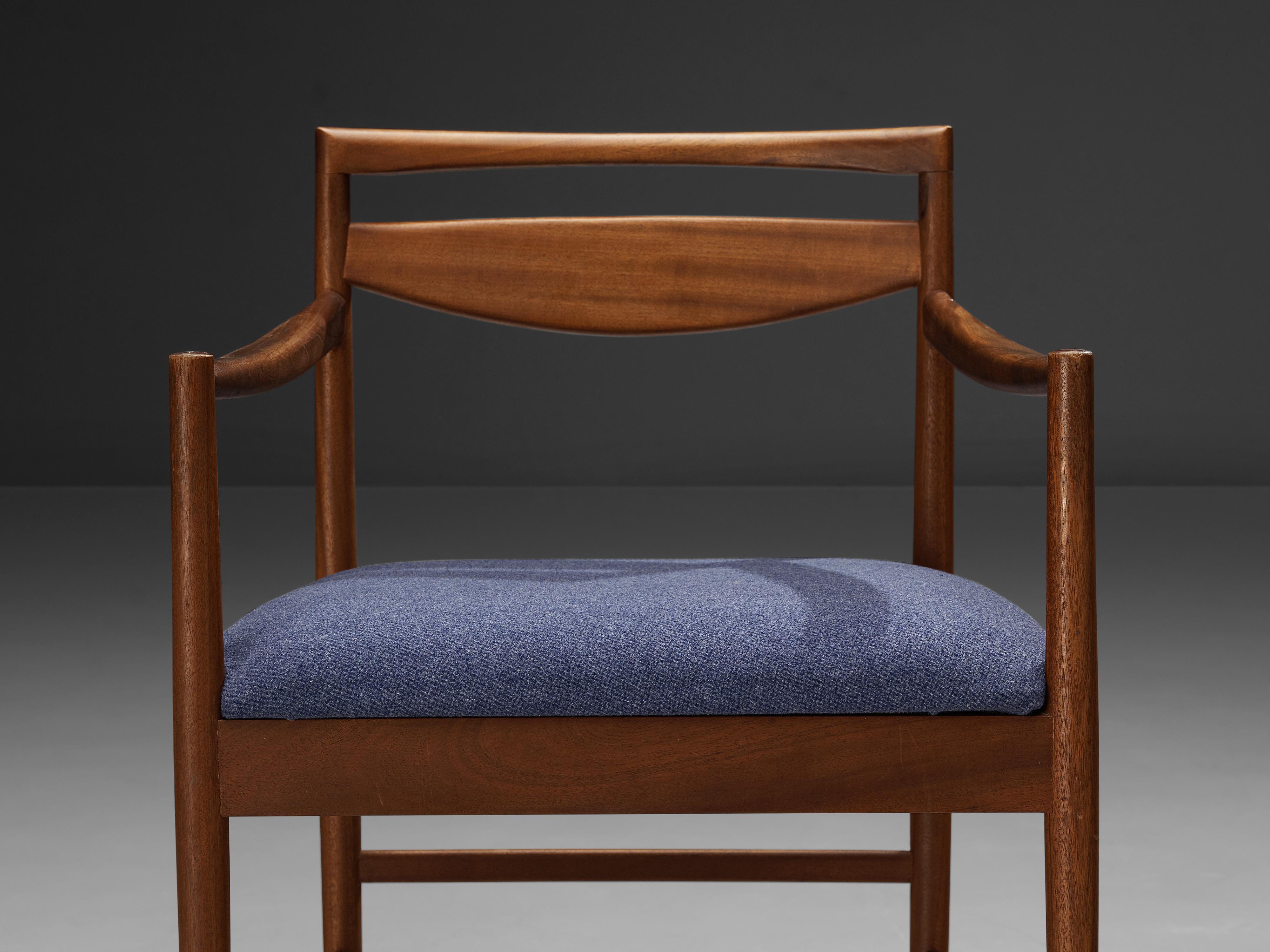 Stunning dining chair made in Europe in the 1960s featuring a striking backrest. The model is angular and modest as it is build up in mainly horizontal and vertical lines. Only the backrest is curved and frames a sculptural, oval shaped piece in the middle that is slightly tilted backwards.