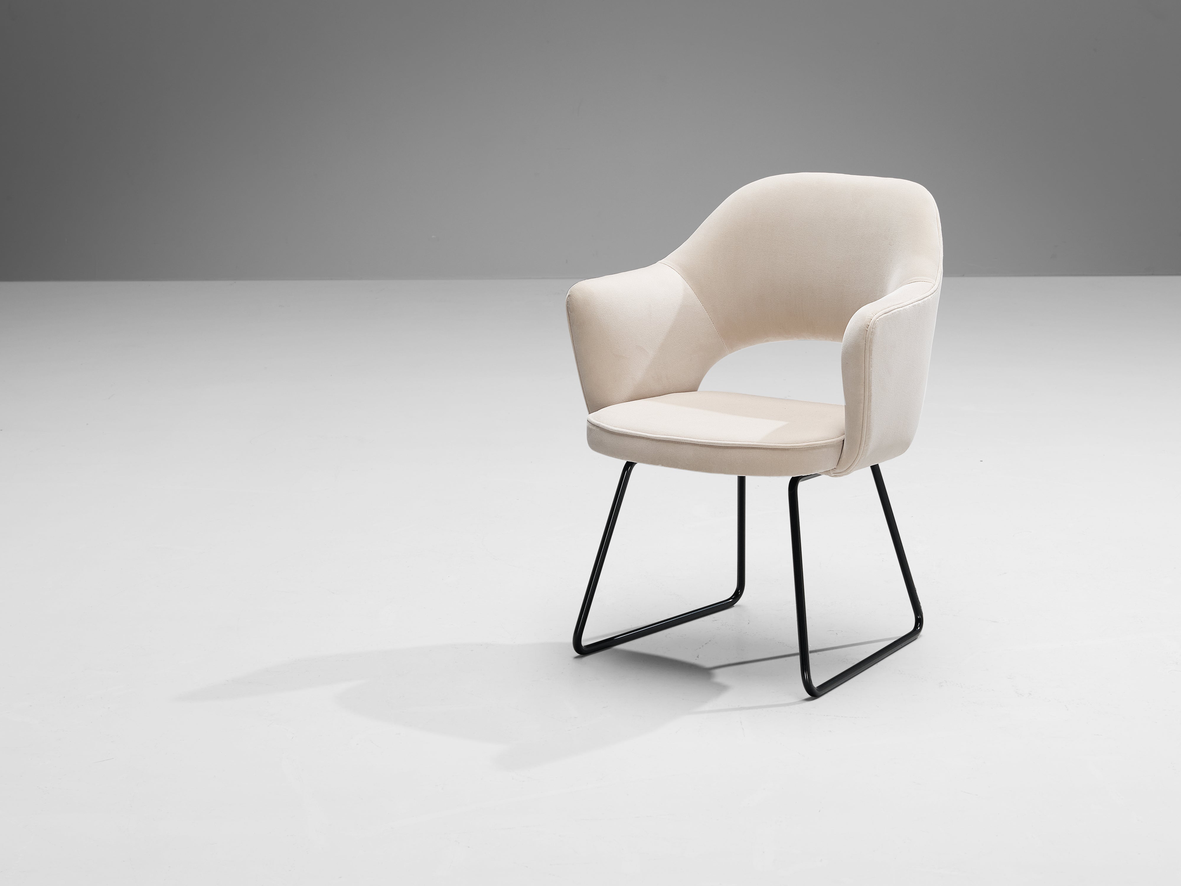 These armchairs were commissioned by the UNESCO Headquarters located in Paris. This iconic building was completed on 3 November 1958 by a team of three leading architects of that time: Bernard Zehrfuss, Marcel Breuer, and Pier Luigi Nervi. The Advisory Committee of Architects chaired by Walter Gropius and Le Corbusier, to name a few, were involved in the development of the architectural process. These chairs were part of the auditorium. This model features a sled base based on a trapezoidal shape, and, therefore, differs from his well-known ‘Conference’ chair introduced in 1946. The back has an open structure and runs smoothly into the armrests, creating nice comfort for the arms. The seat is reupholstered in Adamo & Eva "Ostrica" by Dedar, featuring a velvet texture in the color off-white. A mere 800 units of this particular model were manufactured exclusively for the project, specifically to furnish the main conference room and select work areas within the building. This quantity is significantly smaller when compared to the aforementioned iconic Conference chair, which is still in production, resulting in a much larger quantity of chairs being produced. Underneath each armchair, a small label with an UNESCO serial number is attached.