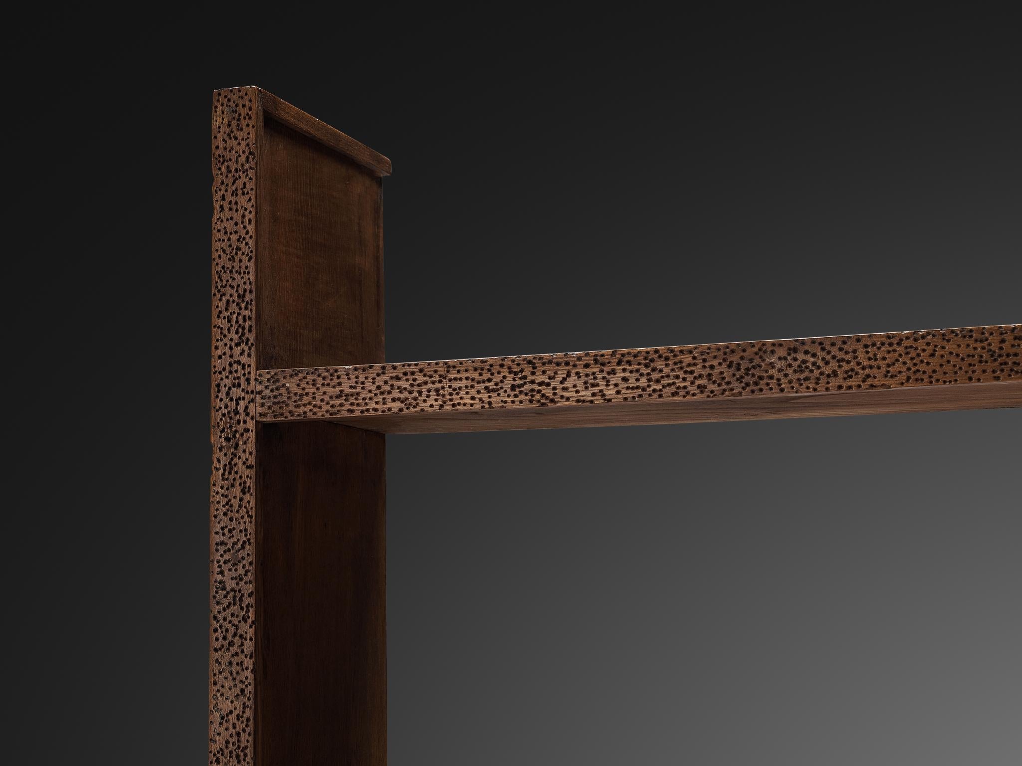 This bookcase shows the characteristics of Ernesto Valabrega's designs. The dynamic engraved wood, gives the piece real character. A nice detail are the small legs on each side of the shelves which creates an elegant feature.