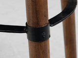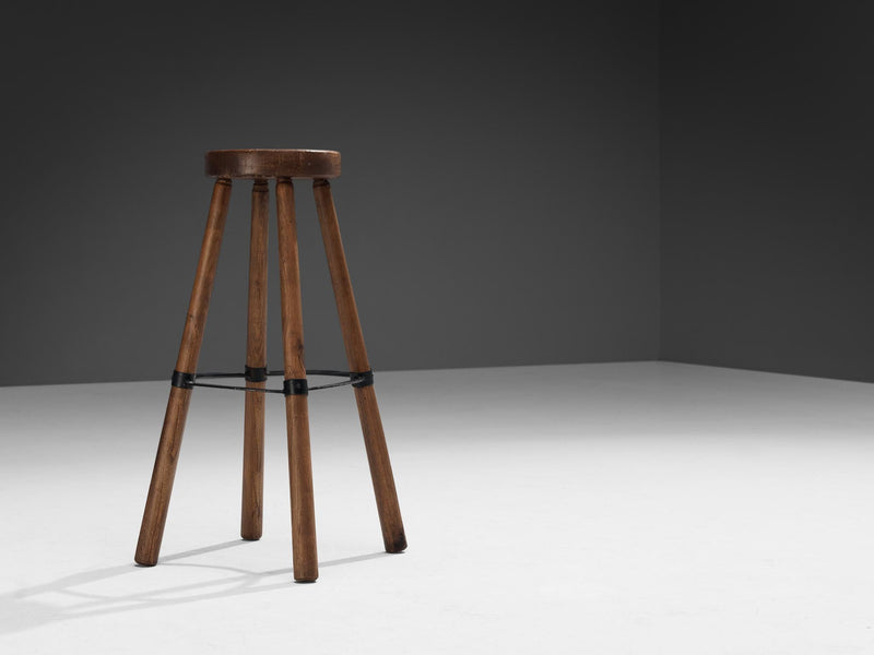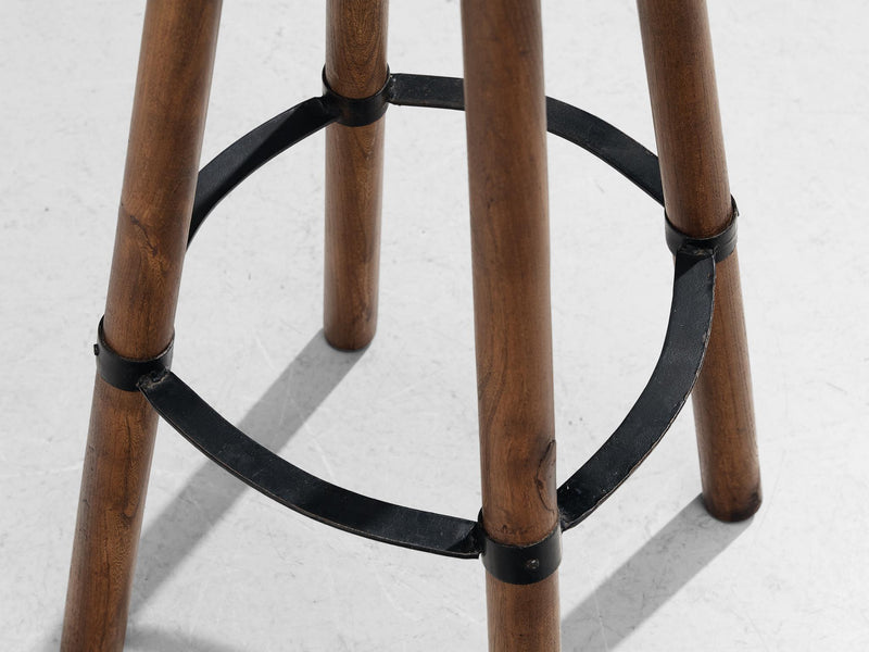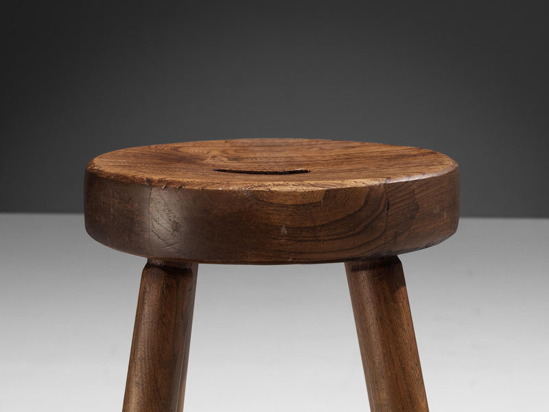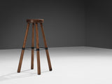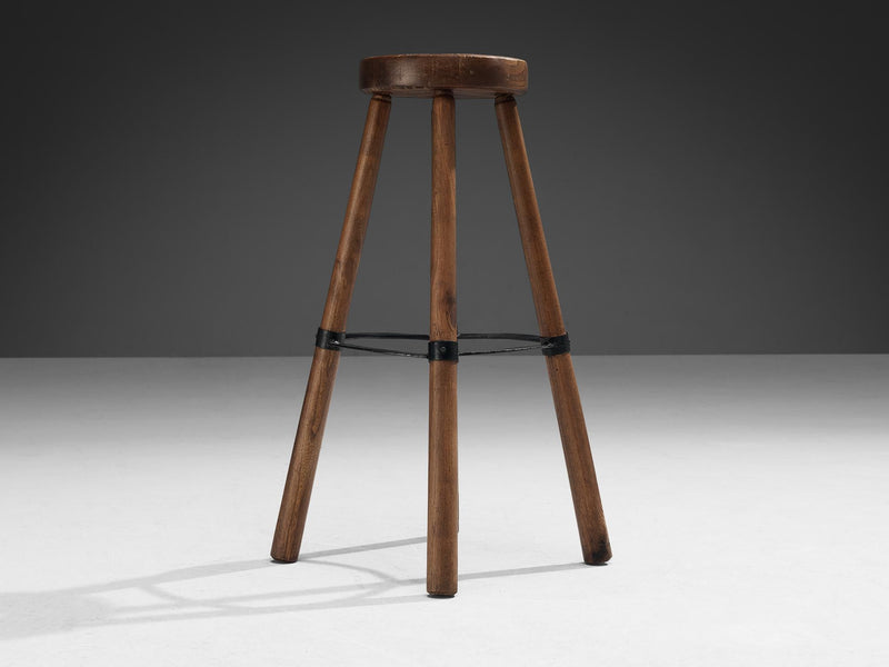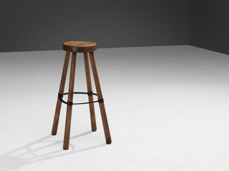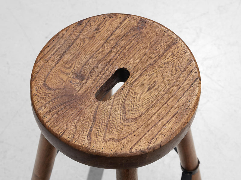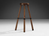 Sturdy stool in beech made in France in the 1960s. This piece shows a beautiful patina formed over time by using A nice feature is the metal ring around the crux of the stool, providing sturdiness and a mix of materials. This piece strongly reminds of the furniture produced by 'Les Artisans de Marolles' in the 1950s and 1960s. A collective of woodworkers founded and directed by Jean Touret (1916-2004) in Marolles, France. Touret was known primarily as an artist and sculptor, who was very much inspired by his religious beliefs. After the period of 'Les Artisans of Marolles', he continued to dedicate his life to making religious works of art for many chapels and churches around France.