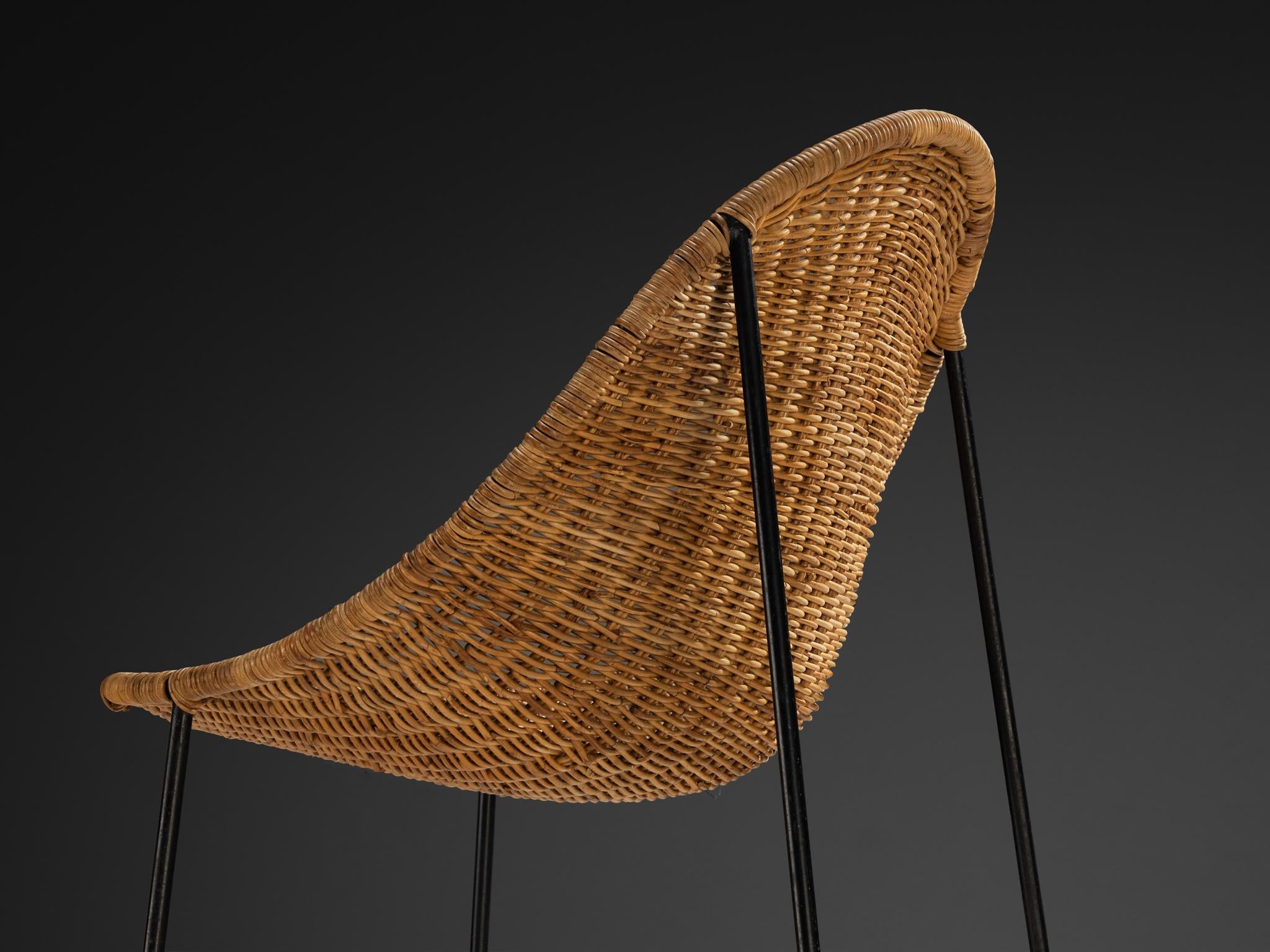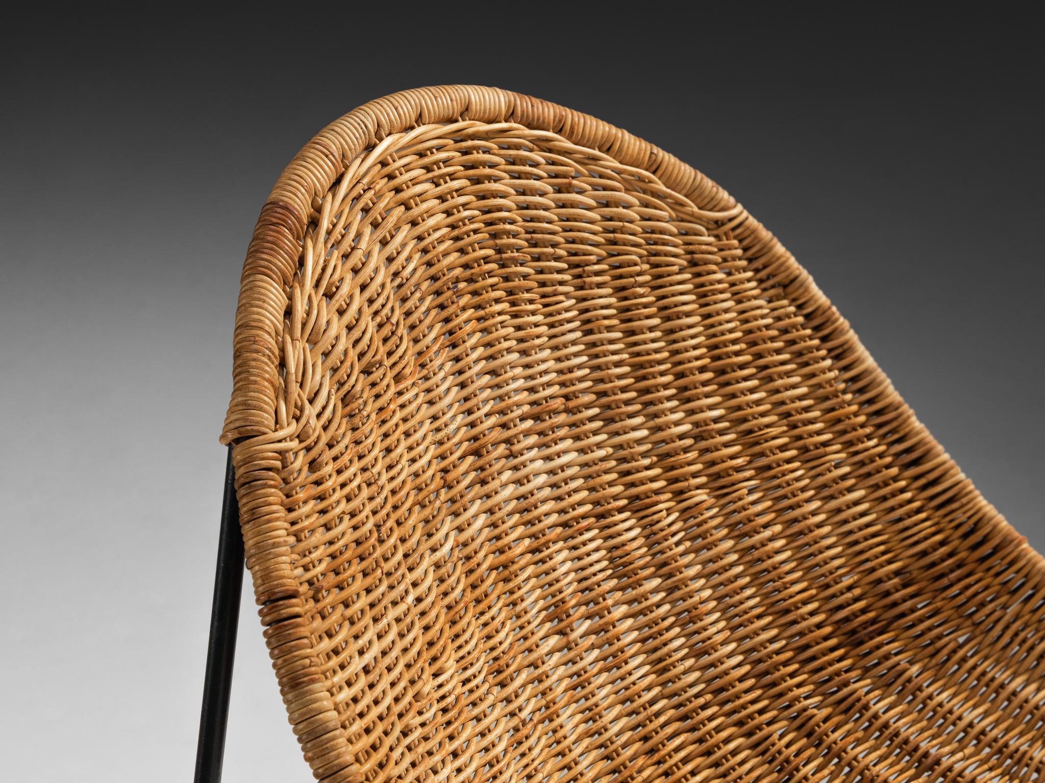 These chairs, designed by Georges and Hermine Laurent, feature gracefully curved woven cane seats that form a continuous, unbroken surface, providing a sense of organic fluidity. Their open framework, composed of black-coated steel rods, introduces a clean, geometric quality that contrasts with the natural cane while maintaining an elegant, restrained appearance.