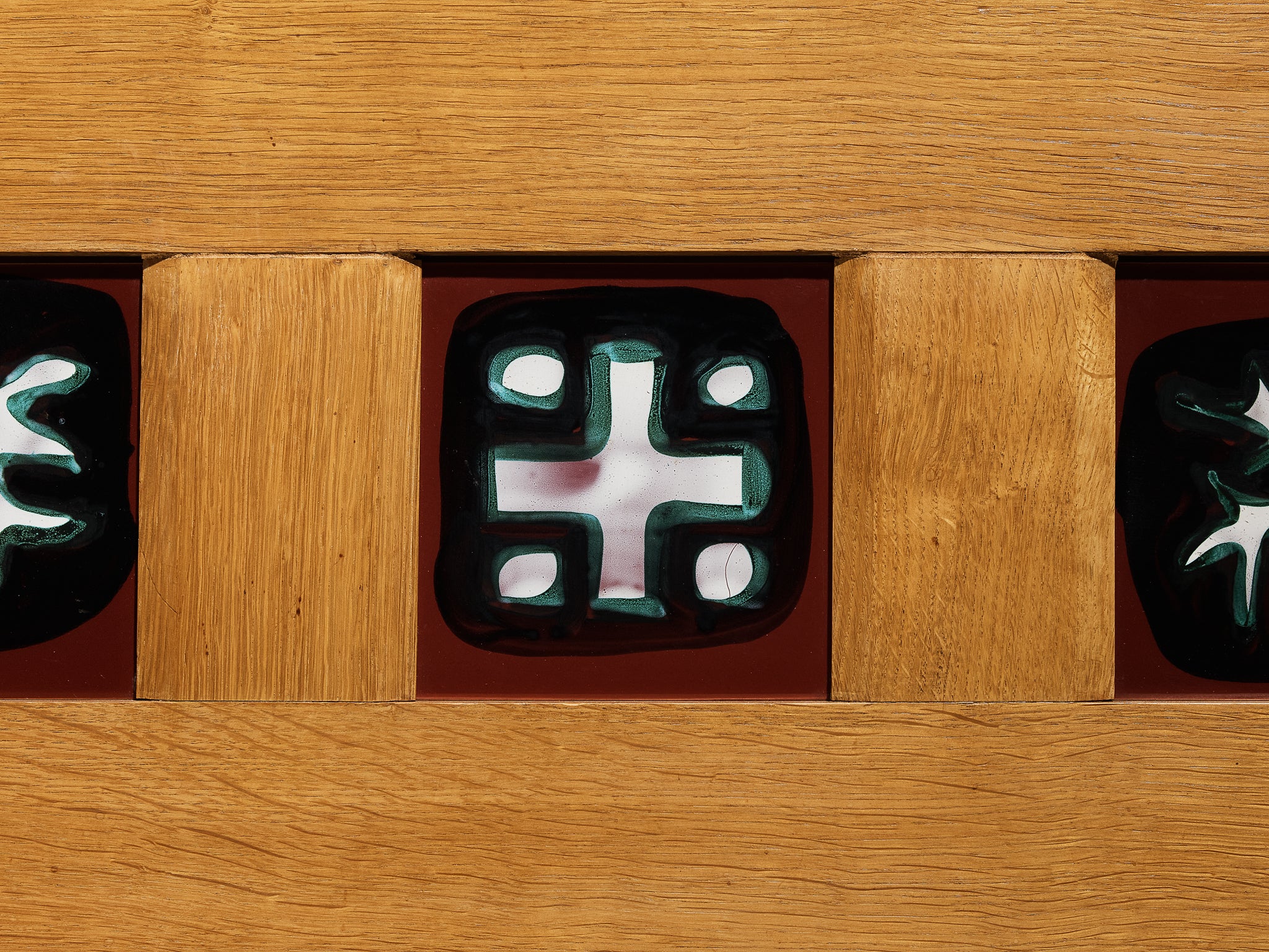 This sideboard by Guillerme et Chambron is a robust and heavy object that speaks through its material honesty and careful proportions. Made from solid oak, its form is grounded and purposeful, with a strong horizontal emphasis; ample storage space is available behind the sliding doors. A series of ceramic tiles with decorative, abstract motifs break up the uniformity of the oak surface with bursts of deep red, black, and white. The sliding doors glide within channels set into the wood, with large wooden knobs integrated into the side frames. The sides of the piece are equally functional and thoughtfully designed. Each end panel conceals an additional door, integrated discreetly into the vertical structure of the cabinet.