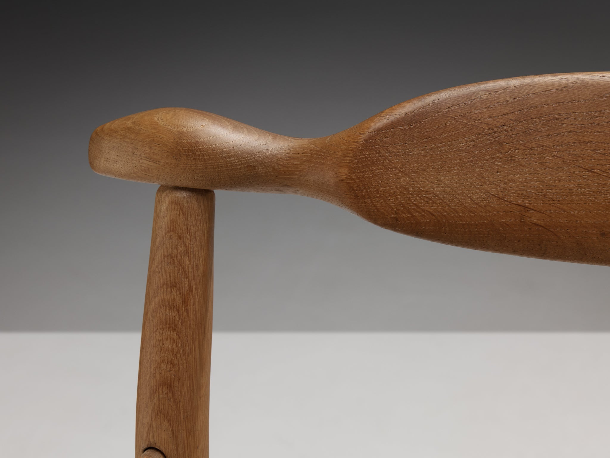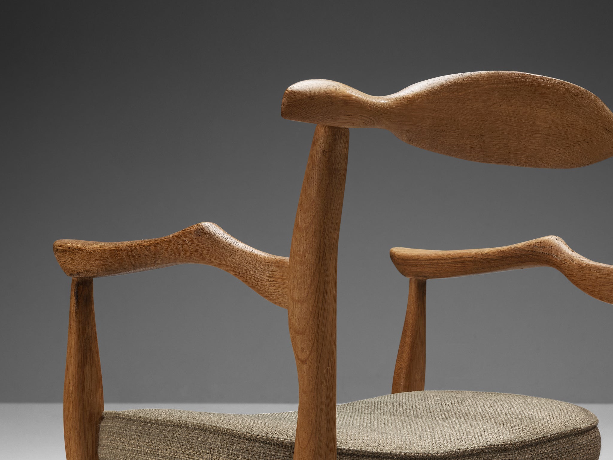Beautifully shaped armchair in blond oak by French designer duo Jacques Chambron and Robert Guillerme. This chair shows beautiful lines in every element. Starting with the characteristic Guillerme and Chambron legs with capricious forms. The armrests are beautifully shaped and curved. The back shows once again the great attention to detail and great woodworking. This desk chair has an open and light character. A nice patina is visible on the wood, which highlights the beautiful lines and curves.