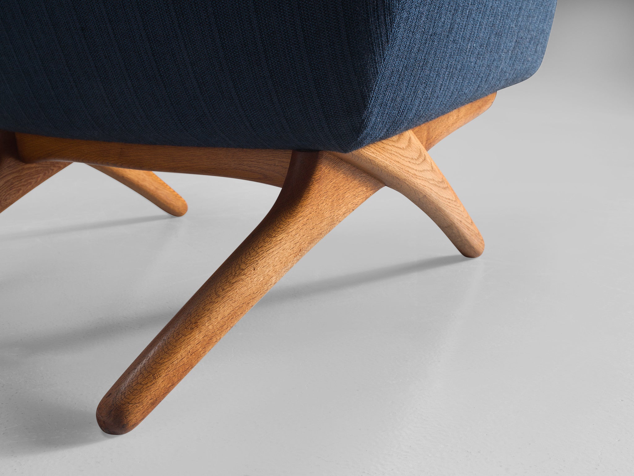 Illum Wikkelsø (1919-1999) was trained as a carpenter and later studied at the School of Arts and Crafts in Copenhagen. He first worked for the Danish furniture maker Jacob Kjær and the architect Peter Hvidt and Orla Mølgaard until 1954 when he opened his studio on the outskirts of Aarhus. Here he designed especially simple and elegant seating with great functionality now considered classics of Danish furniture design. The style of his work varies from Kaare Klint's classicism to the soft organic craft by Arne Jacobsen.