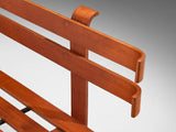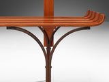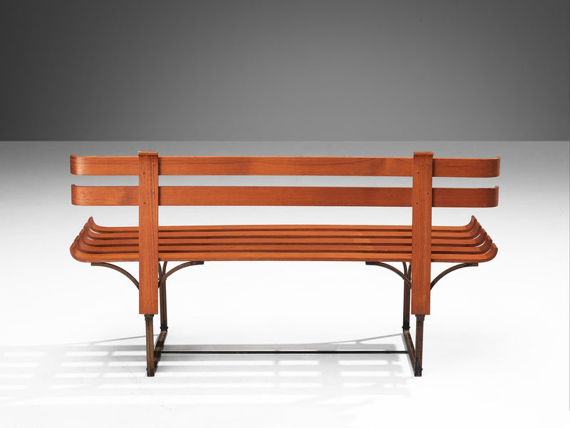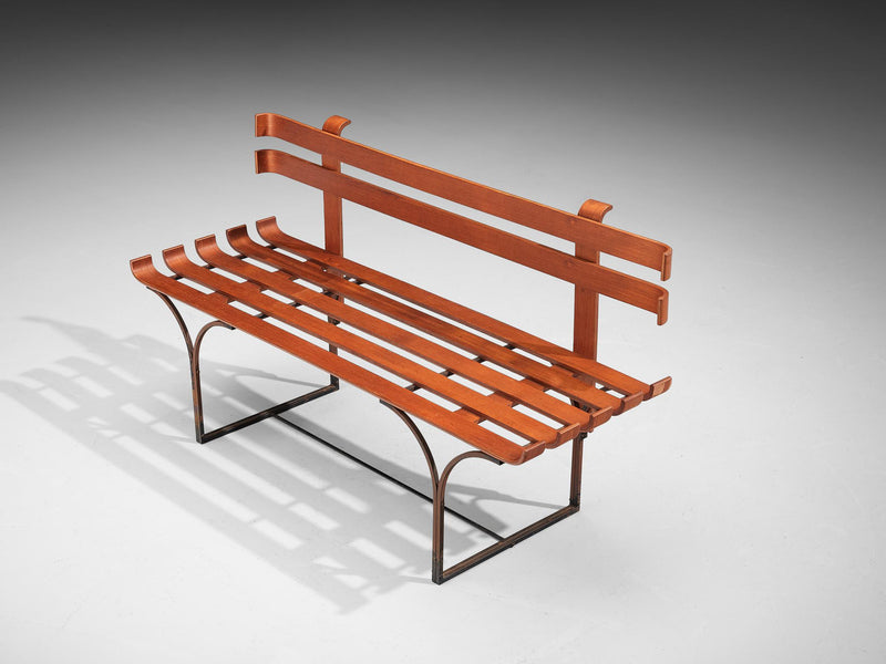 This bent plywood bench represents characteristic Italian design elements such as the playful lines of the bent frame and the typical basic design of the plywood. The overall effect of the bench is decidedly sculptural and floating due to the open character, but it's still very functional. The wood has a beautiful patina.