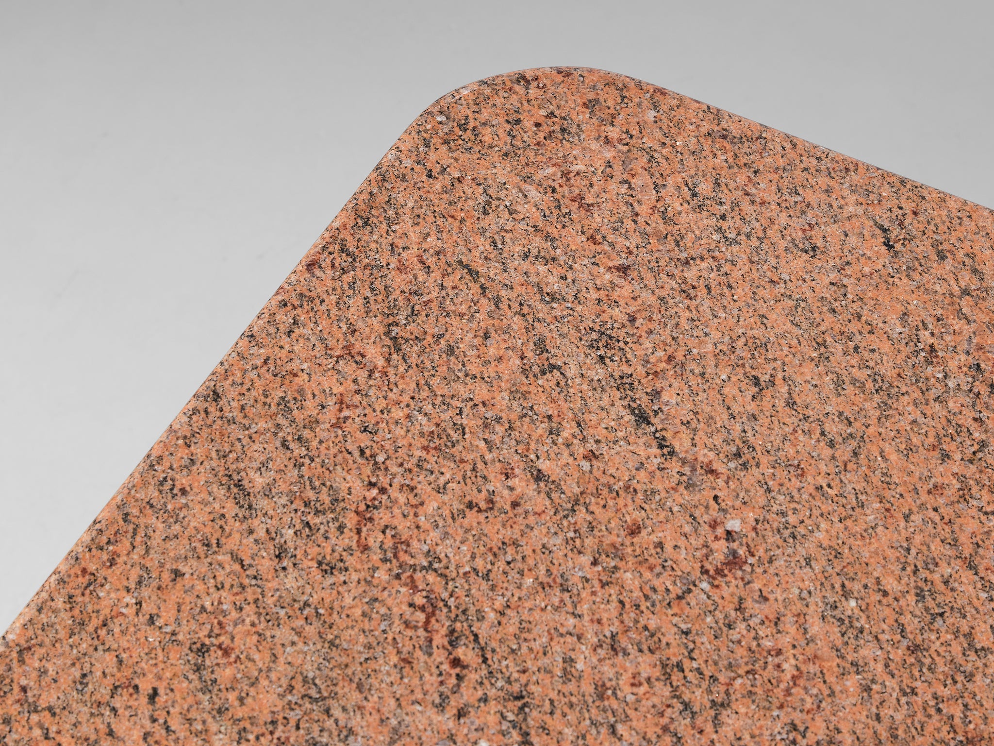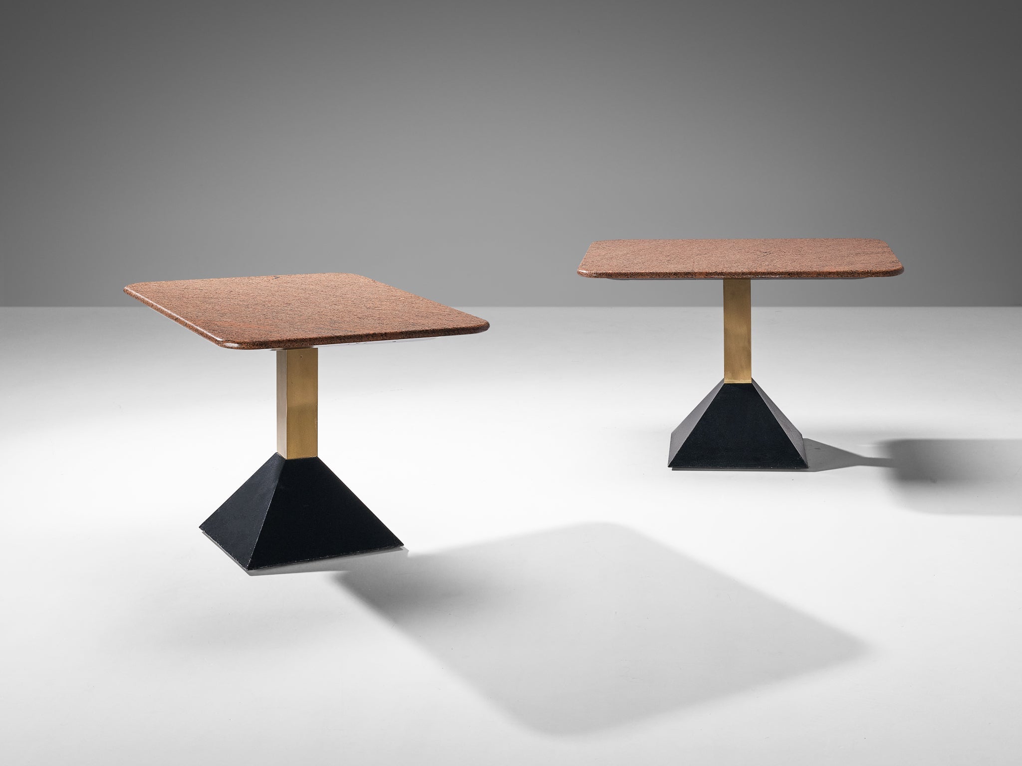 These Italian side tables showcase a rectangular brown granite tabletop with a striking, vivid surface. The granite rests on a brass pedestal, which finishes with a black trapezoidal base. The combination of contrasting textures and shapes creates a visually captivating piece, perfectly reflecting the essence of Italian postmodern design.