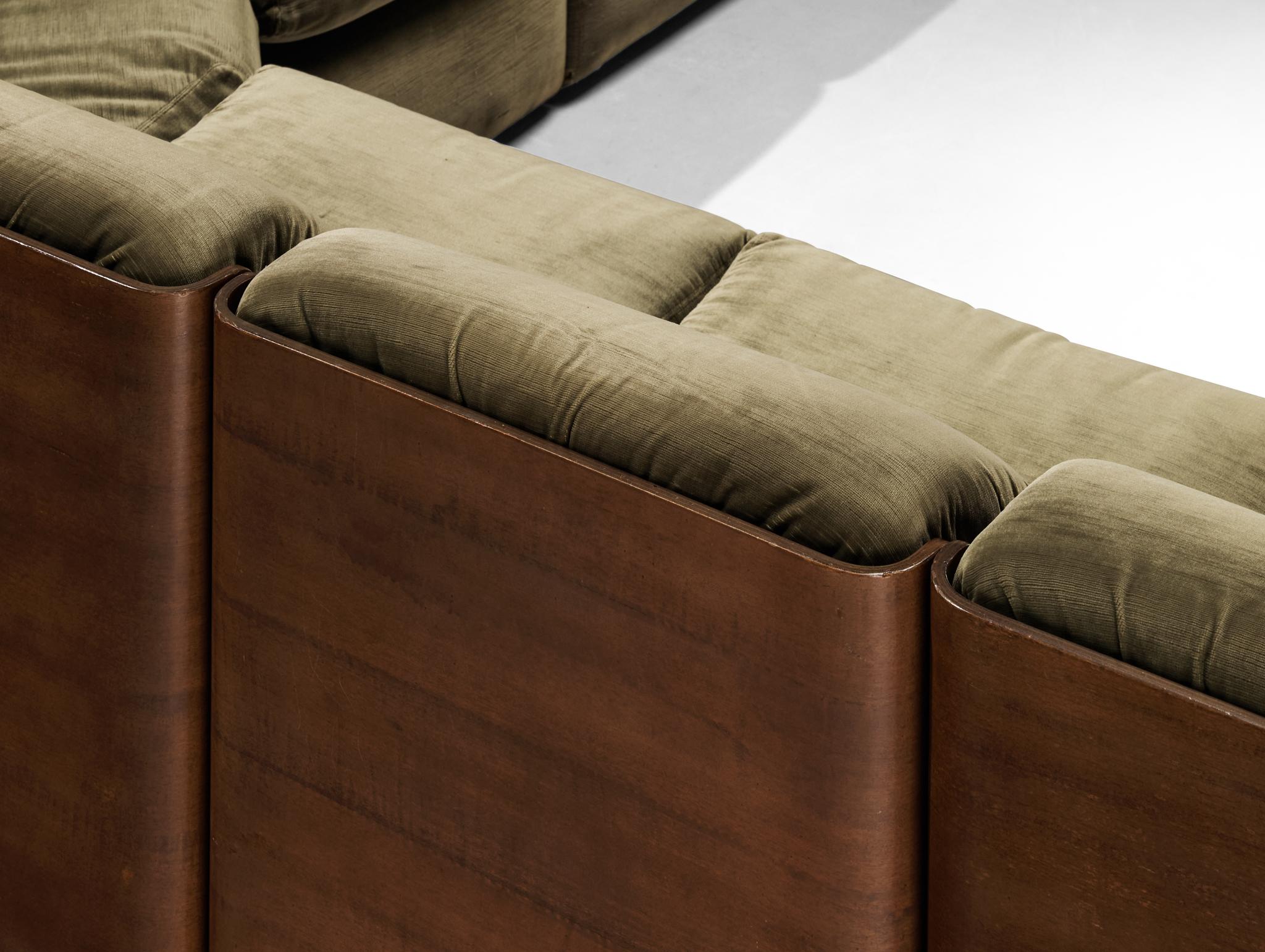 This grand modular sofa, crafted in Italy in the 1960s, is a stunning example of both form and function. Designed for excellent comfort, its expansive structure makes it ideal for bringing people together in a relaxed and inviting setting. The outer shell of the modular elements are executed in wood, provides a beautiful contrast to the plush, generously padded cushions, which are upholstered in a moss-green fabric. The deep, organic tones enhance its attraction, while the modular design allows for a flexible arrangement, adapting to different spaces and needs.