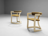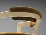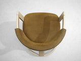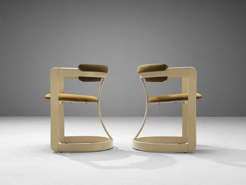 These armchairs embrace the aesthetic sense of the 'Pamplona' chairs designed by Augusto Savini for Pozzi. This design is based on solely round shapes. The curved shape of the back is repetitive in the seat and the base, which contributes to the chair's simplified and clear appeal. The seating is designed as a shell that embraces the sitter wonderfully. Moreover, this semi-circular shape functions as armrests, providing comfort while still being eccentric and stylish. The design is also visually convinced by the brown fabric with a green hue that beautifully complements the off-white frame. The artistry of these chairs makes sure that it can be placed as a visual statement in the room.