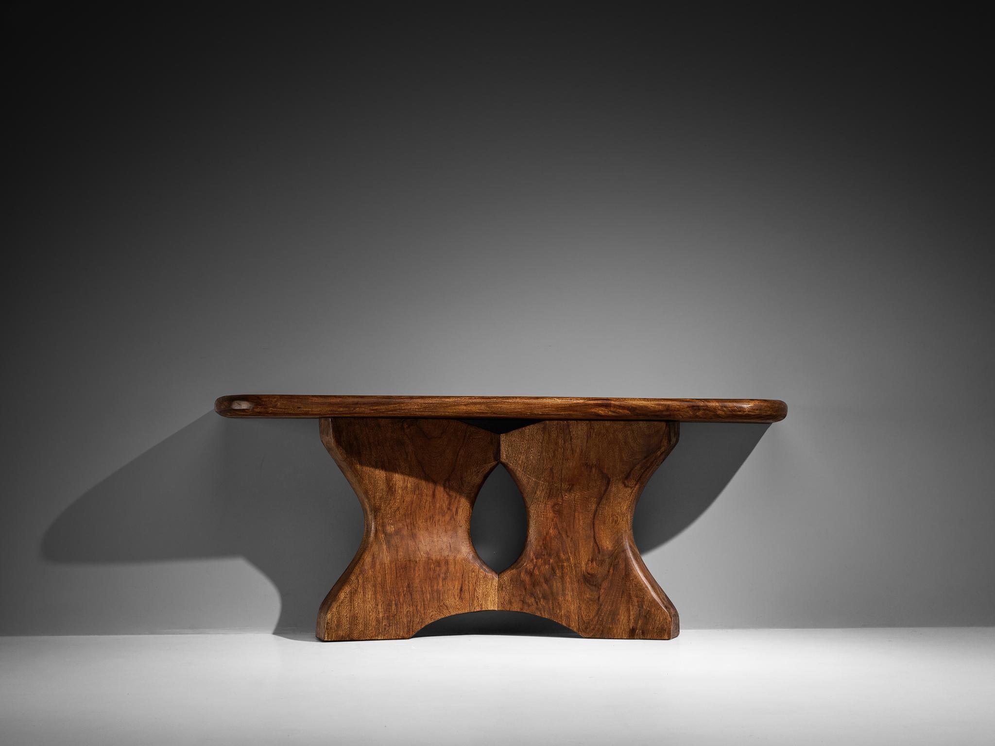 This exceptional hand carved console embodies everything that José Zanine Caldas stood for: love of nature and especially wood. Created in the 1980s, this console is meticulously crafted from exotic hardwood. The design features a free-form top with organic, free flowing edges of the wood. The base is defined by a harmonious interplay of concave and convex elements, of which the centre exhibits an oval-shaped hole expertly hollowed with a smooth finish. This approach contributed to a dynamic and natural appearance of the design. The wood showcases an intricate grain pattern with a warm, deep hue. When Zanine Caldas returned to his home state of Bahia later on in his career, he became inspired by the local craftsmen who carved boats and furniture from felled trees. As such, he began experimenting with chiselling and carving large, sculptural pieces of furniture such as the present one. A pioneer in the field of forest preservation and ecology, he wrote extensively about his connection to the forest and attempted to either use salvaged wood or to plant a new tree for each one he used in one of his projects. His work is a testament to the power of natural wood and its beauty as a material.
