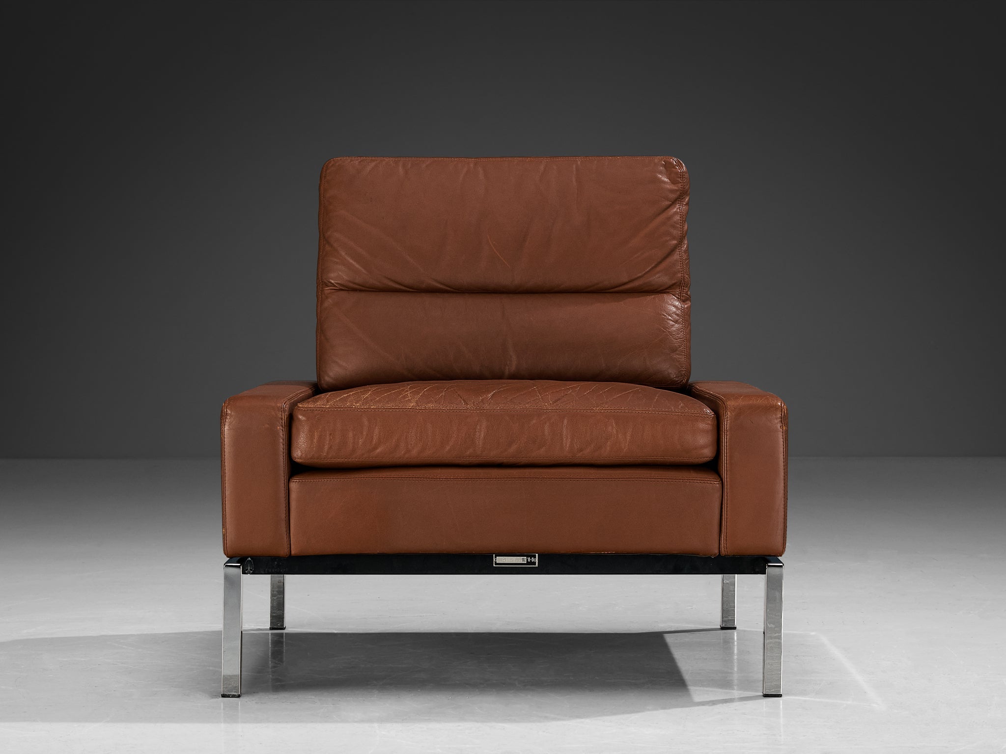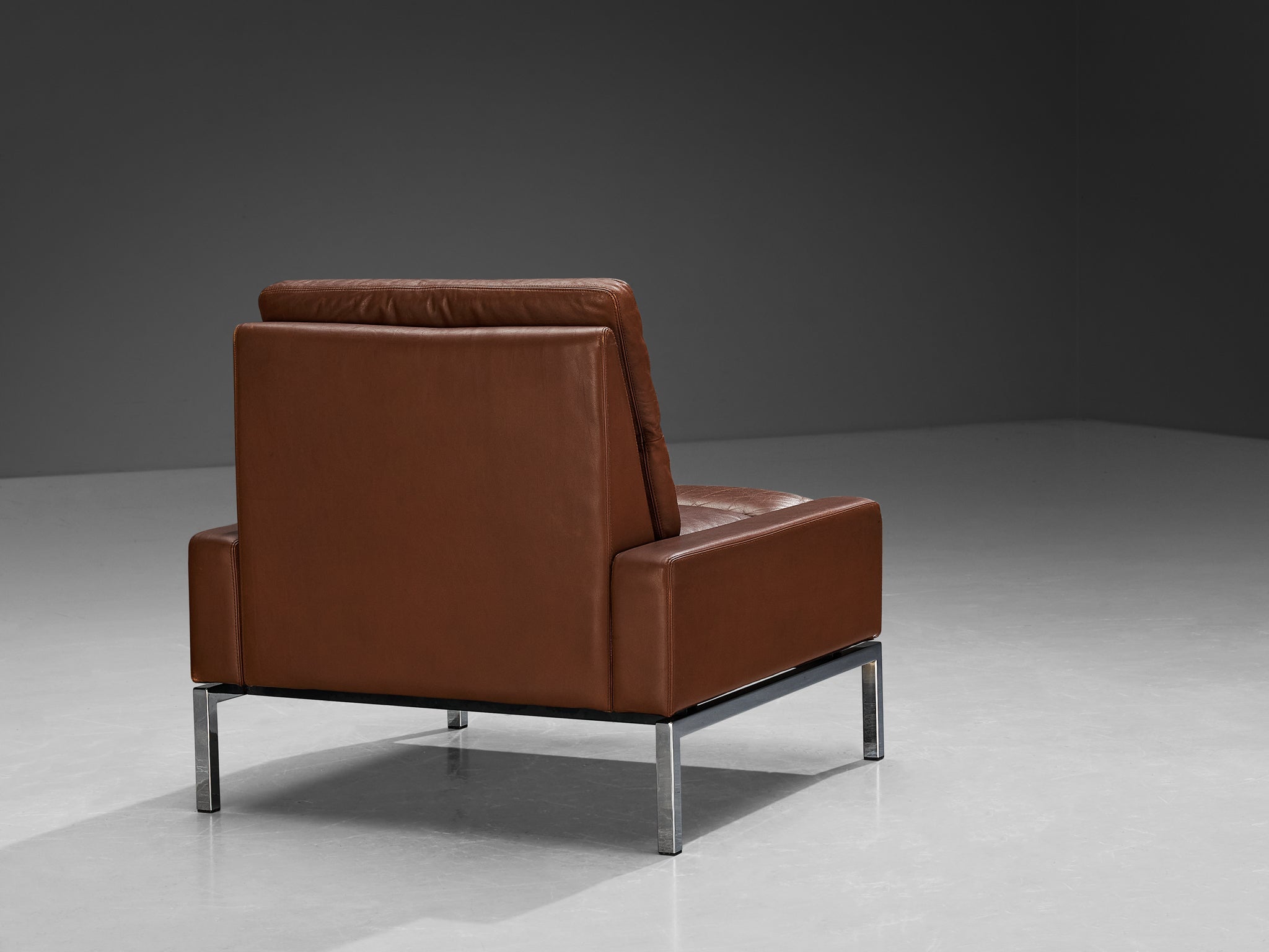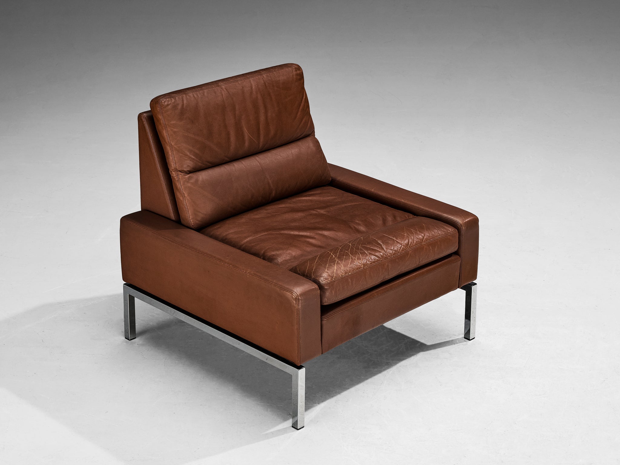 This comfortable lounge chair shows an elegant steel frame. The combination of steel and leather gives these lounge chairs a modern and rich appearance. Upholstered in brown leather that shows patina, this serves as a beautiful lived-in feature to the chair's polished design.