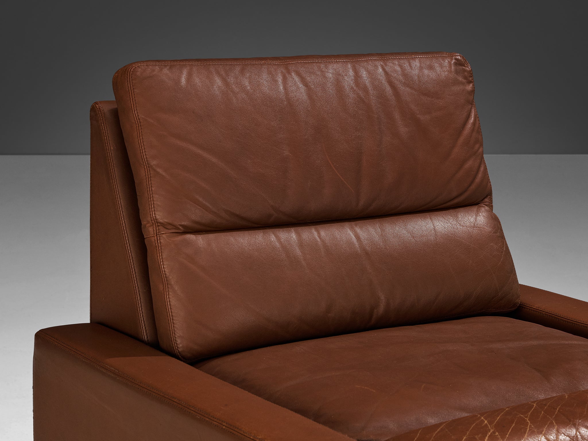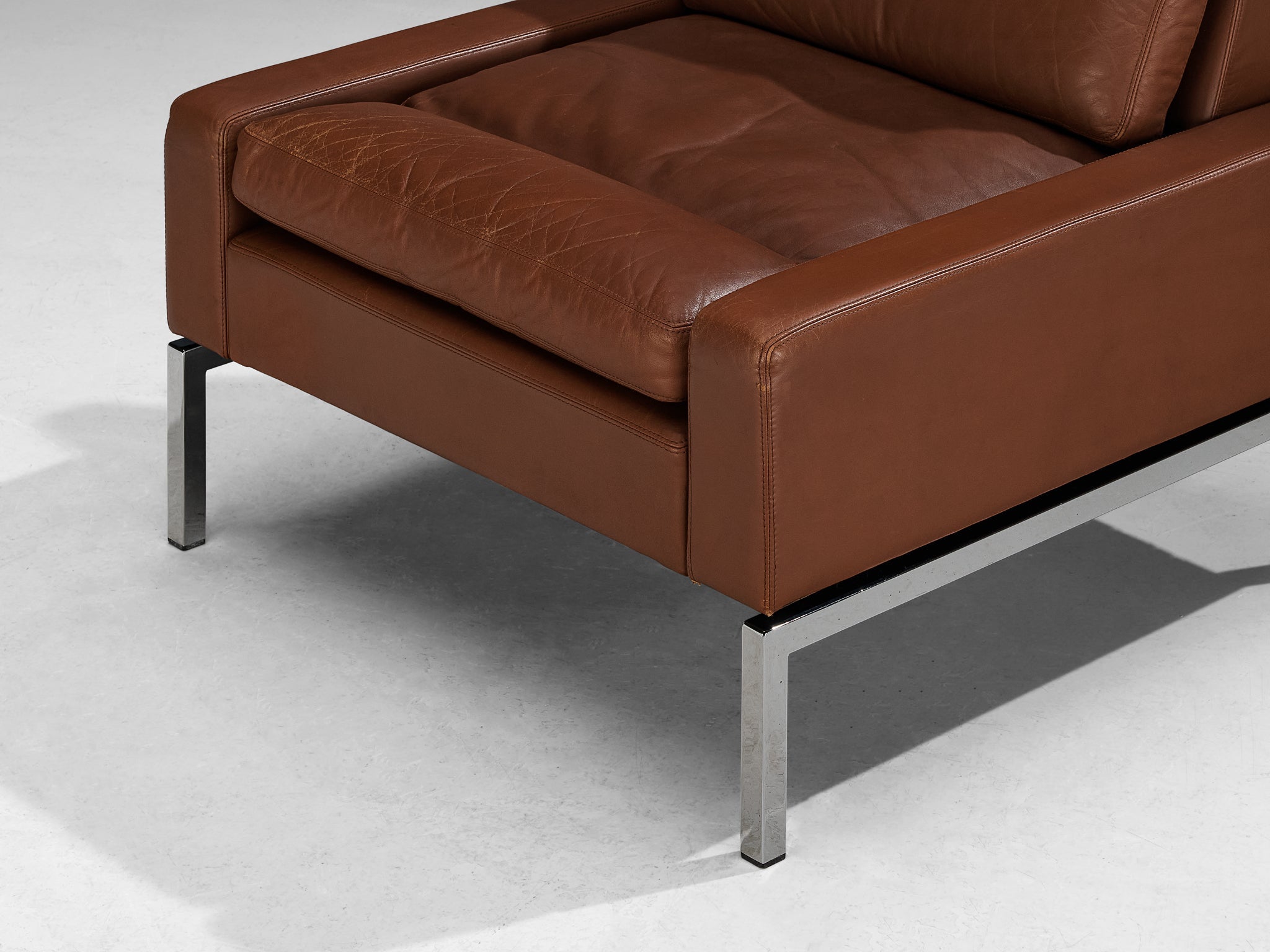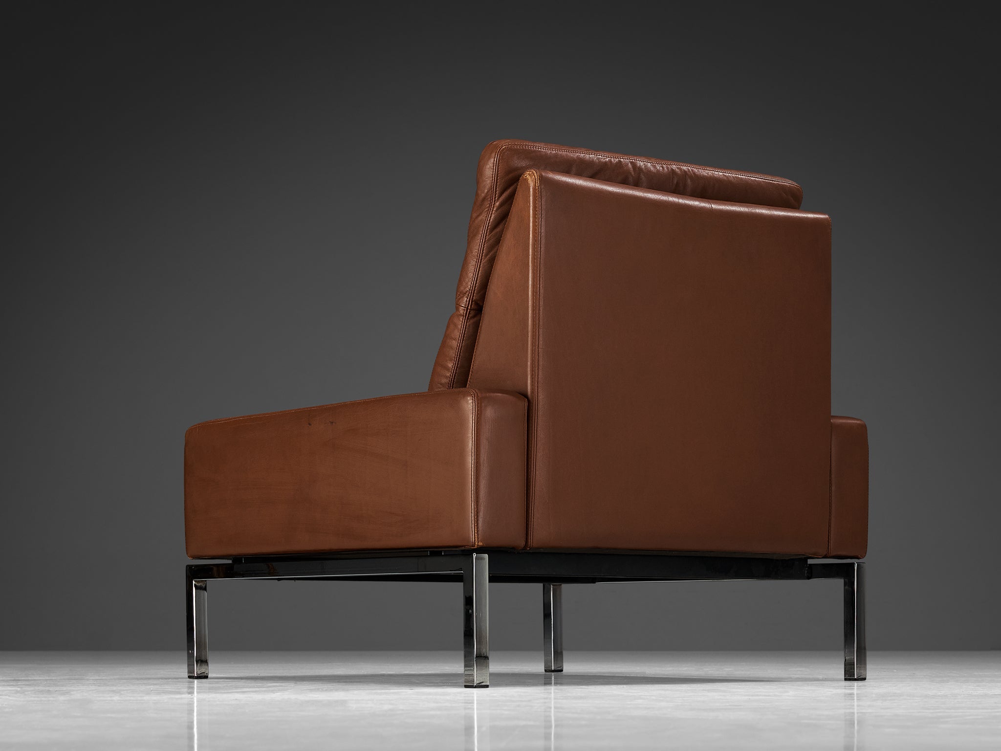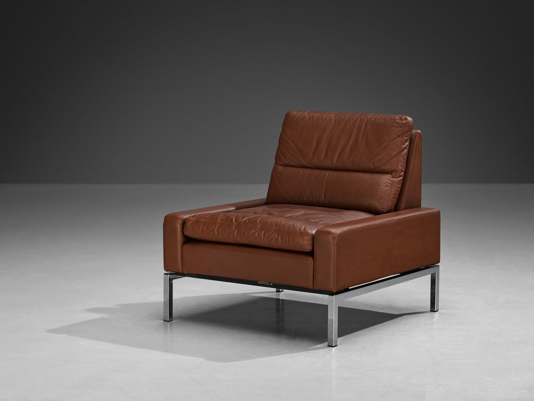 This comfortable lounge chair shows an elegant steel frame. The combination of steel and leather gives these lounge chairs a modern and rich appearance. Upholstered in brown leather that shows patina, this serves as a beautiful lived-in feature to the chair's polished design.