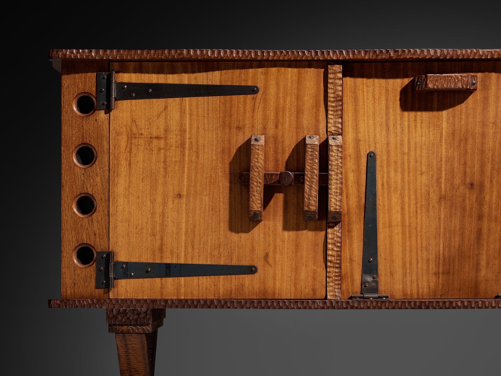 This sideboard, dating from the 1960s, immediately stands out with its unusual shape and rugged material contrast. The body of the piece is partially constructed from meranti, a hardwood known for its rich, warm hue and subtle grain. The cabinet stands on two large, X-shaped legs. These intersecting wooden supports are positioned at either end of the cabinet and are angled outward, creating a visual break from the otherwise rectangular form above. The thick timbers used for the legs enhance the cabinet’s sturdy, grounded character. What makes the piece particularly interesting is how the surface is broken up by an array of hardware and unexpected cutouts. The wrought iron hinges and brackets are not hidden – they're exaggerated, even oversized. They function structurally but also visually, slicing the warm wood with stark black lines. There’s something medieval about it. One of the more intriguing aspects of the cabinet is the series of circular cut-outs along the sides backed with fine mesh, referring to nautical portholes. The carved irregular ridges of the chest are subtle yet defining features. Along the perimeter and the full surface of the legs, a continuous rhythm of fine gouge cuts contour the piece, endowing the piece with an organic stance. In sum, this sideboard is not the refined elegance of high modernism, but rather a kind of honest, slightly raw craftsmanship that reflects the broader experimental tendencies of the 1960s.