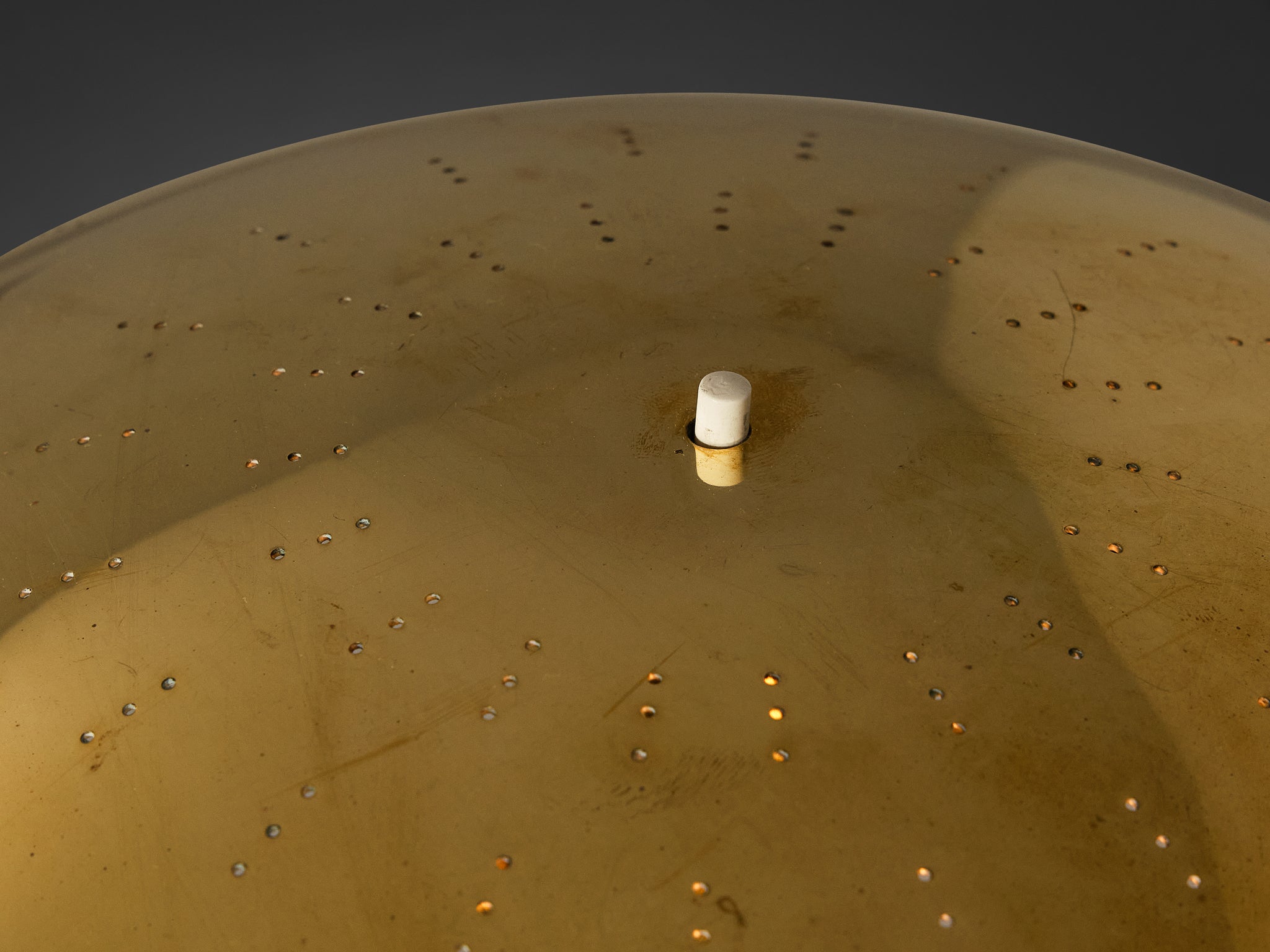 A truly magnificent piece that scores highly on every design aspect: execution, use of materials, craftsmanship, and detail. Paavo Tynell, the master in the fields of lighting, created the '5061' table desk lamp around 1950. An imaginative mushroom-shaped shade is adorned with subtle round perforations through which the light shines, creating an optical shimmering effect. A round base supports the stem that gradually widens towards the top. With regard to its essential form and material use, this lighting object is a testimony to the Golden Age of Scandinavian design. This design is certainly a work of art in its own right.