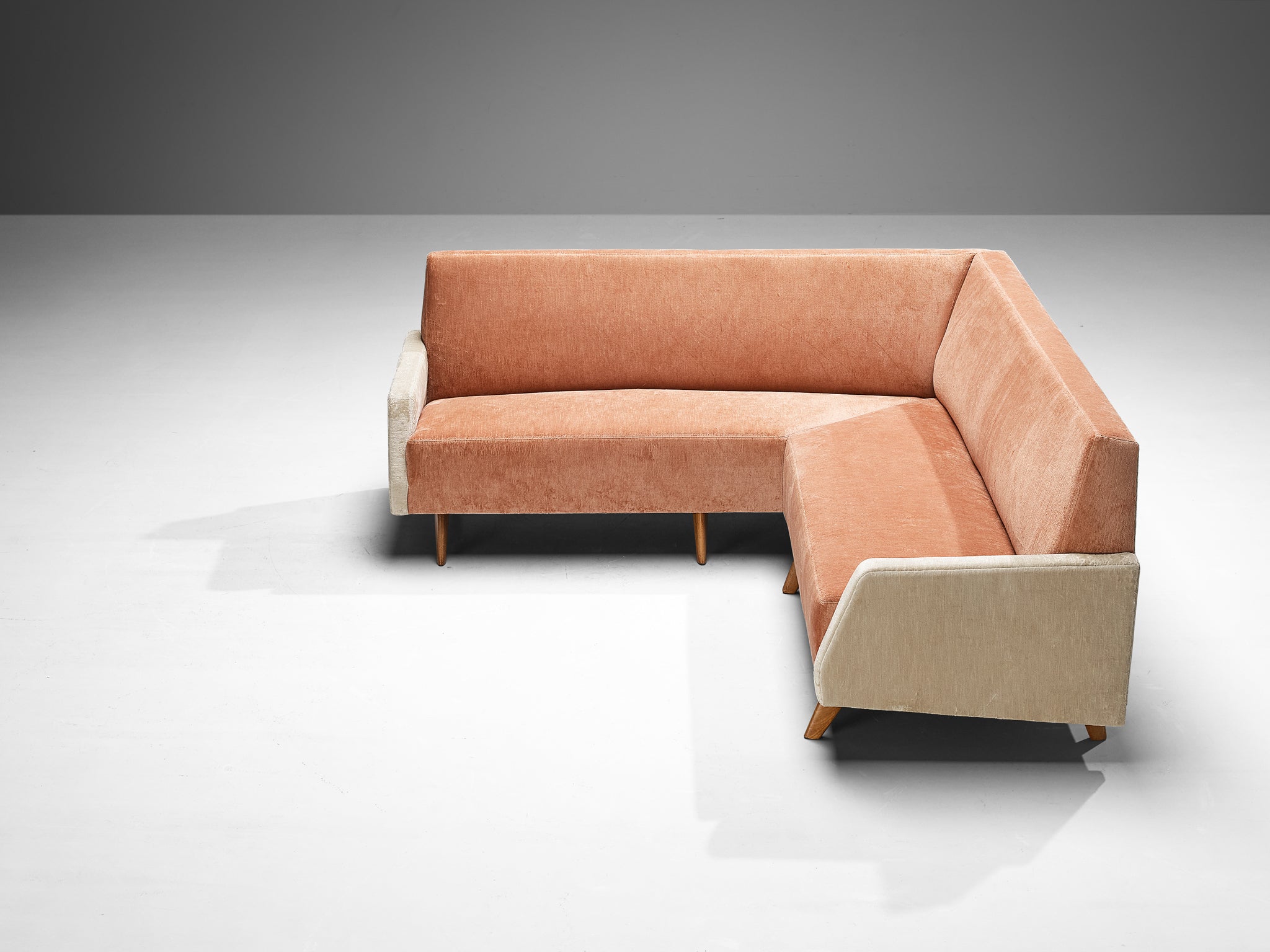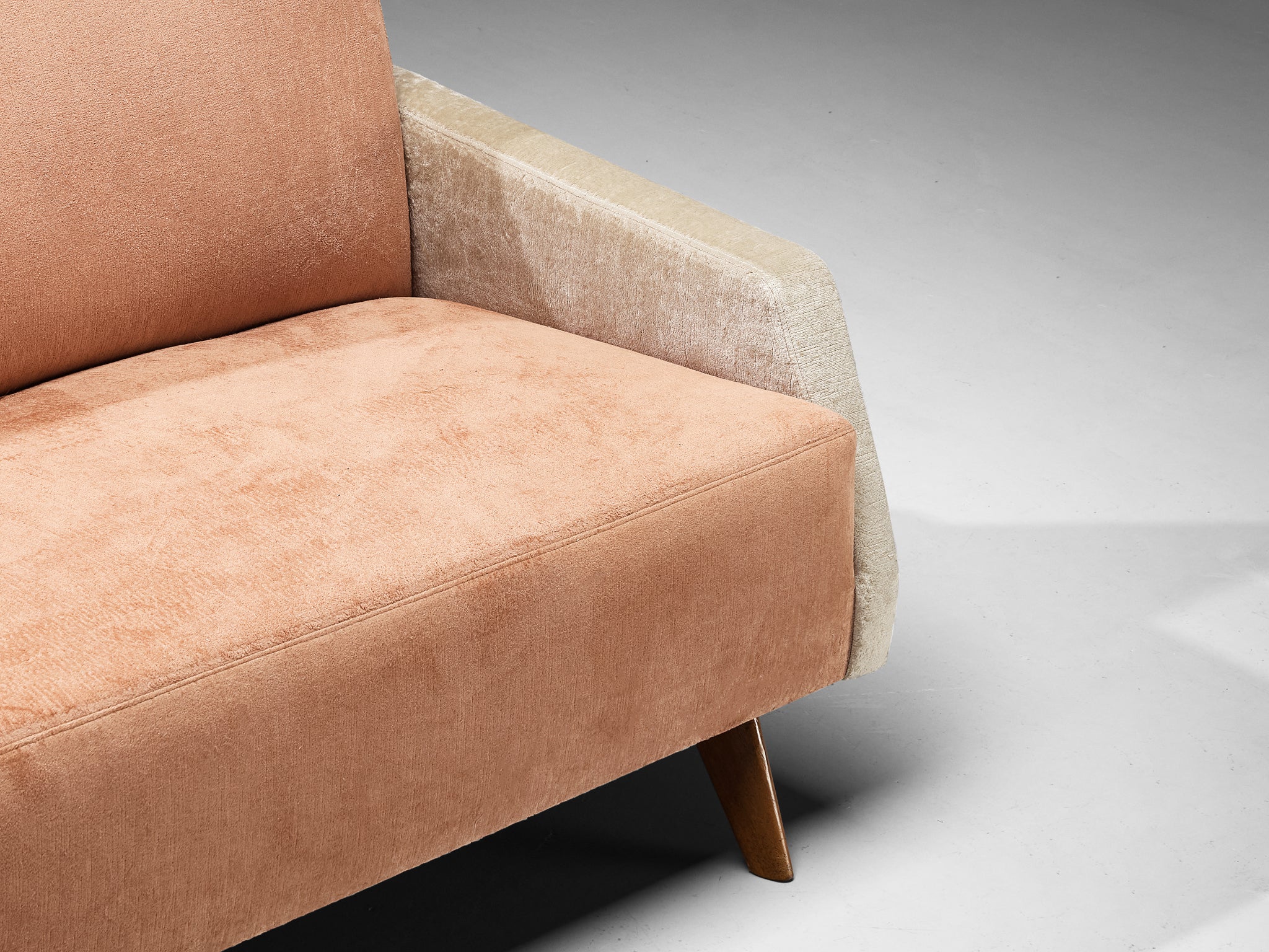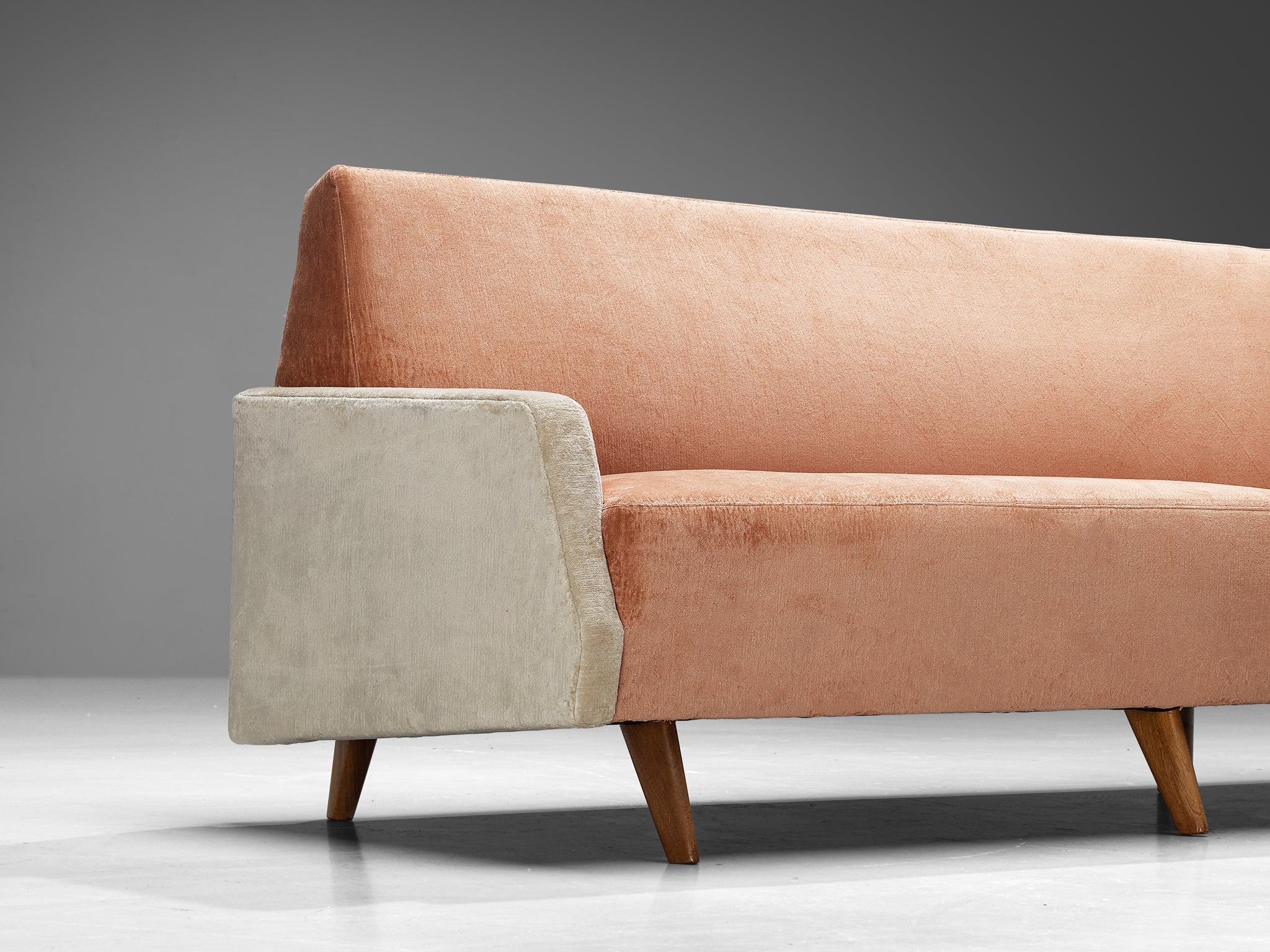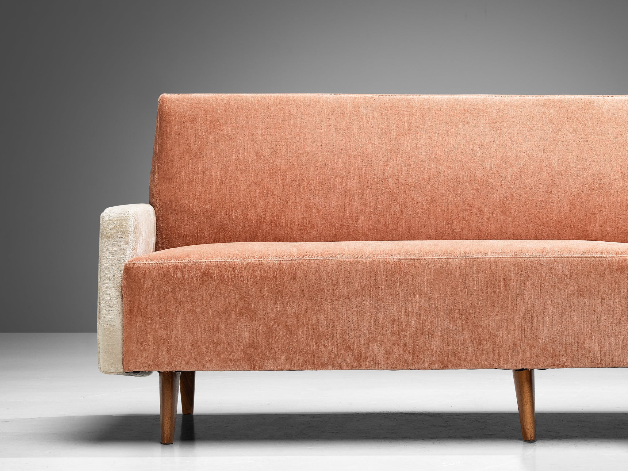 The first thing that catches the eye is the sculptural form of this sofa, the boomerang shape has great visual qualities. The shape of this sofa emphasized by the way it is upholstered, the interior is executed in pink and the outer shell in off-white. This piece, in its clearly elegant form, is newly upholstered and perfectly ready to be enjoyed.