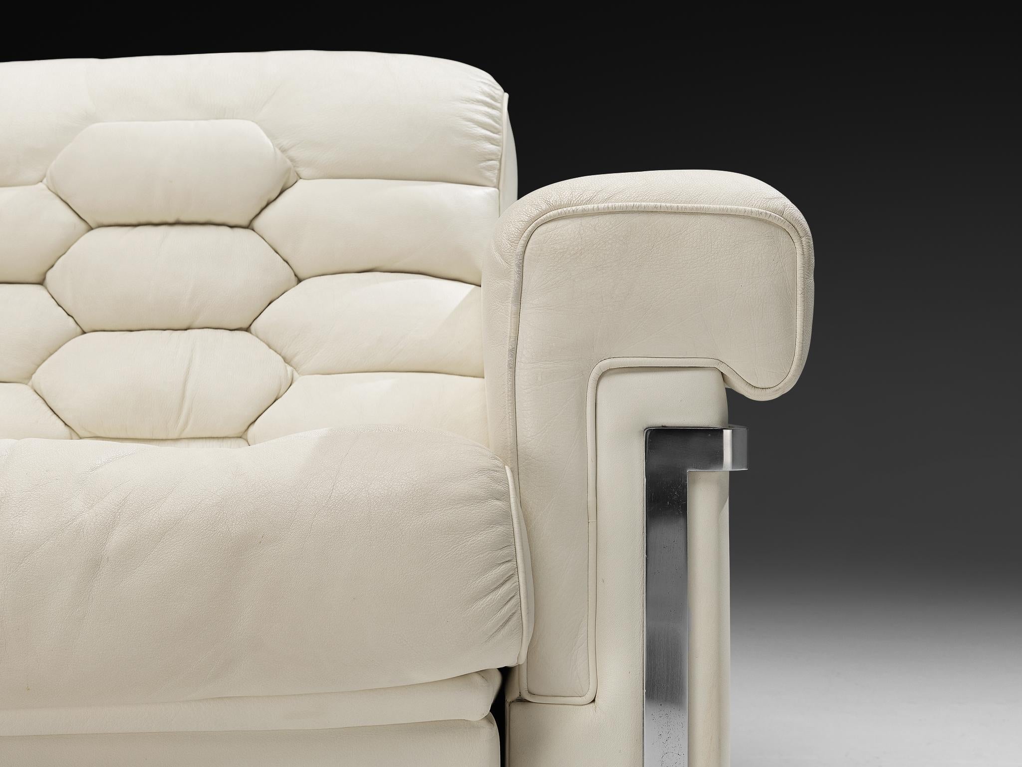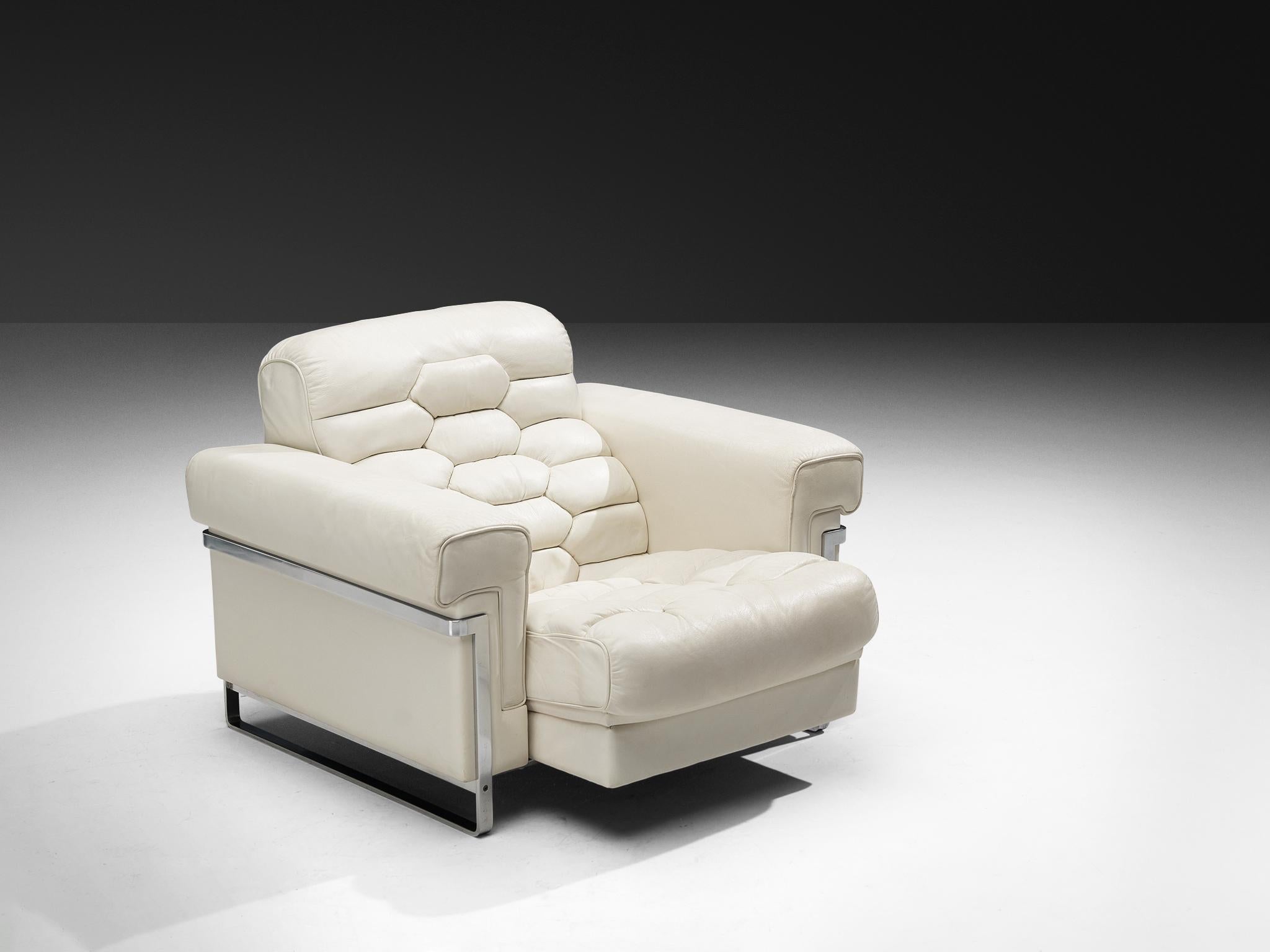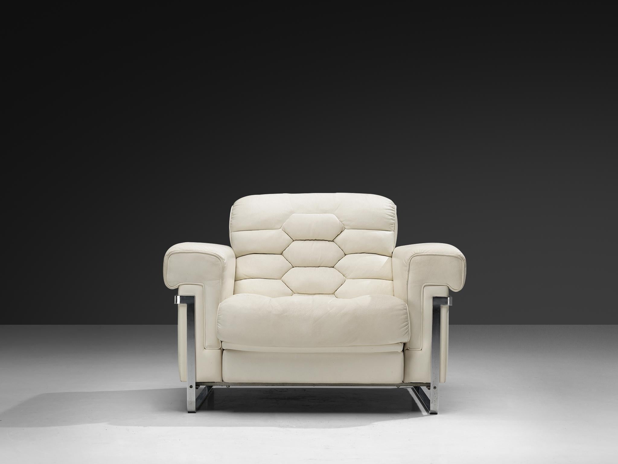 The DS-P lounge chair designed by Robert Haussmann for De Sede, is a striking example of functional elegance. Its substantial form is accentuated by a padded surface in white leather featuring a honeycomb tufting pattern, creating a visually engaging and textured three-dimensional effect. This stylistic choice not only enhances its tactile appeal but also ensures exceptional comfort. The seat can be transformed into a lying position, providing an additional ergonomic experience. The cushions are encased in sleek chromium steel, characterized by an open framework with crisp lines, which contribute to the chair's graceful modern charm.