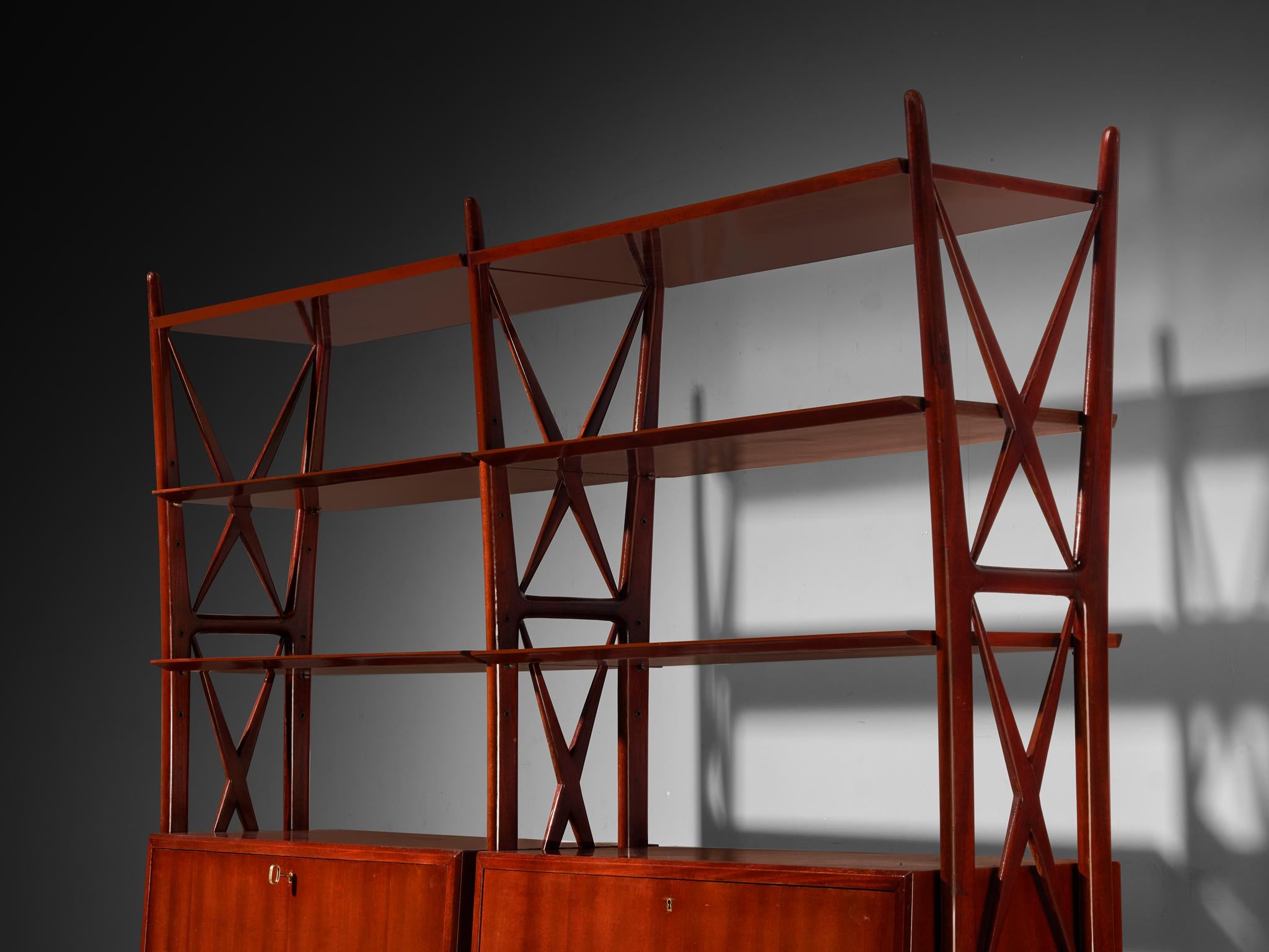 This elegant library is a striking example of Italian design, crafted by designer Silvio Cavatorta in the late 1940s. Executed in richly hued mahogany wood, the piece showcases Cavatorta's mastery of form and elegance. Its open, geometric structure features crossed supports, lending it a sculptural quality while maintaining an airy, lightweight appearance. The piece balances open shelving for display with closed compartments, which provides practical storage. The craftsmanship and refined materials highlight post-war Italian design, making this highboard a versatile and luxurious addition to any space.