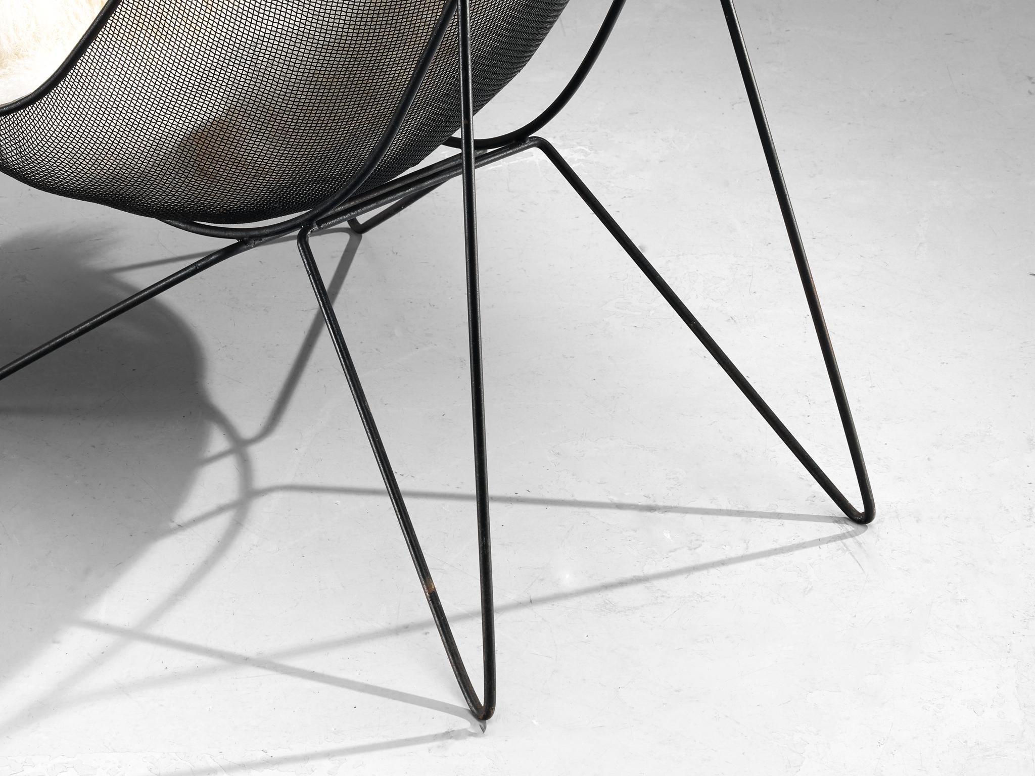 Sol Bloom for New Dimensions Furniture, 'Scoop' patio chair with catch-all table, wrought iron, steel mesh, United States, 1950
