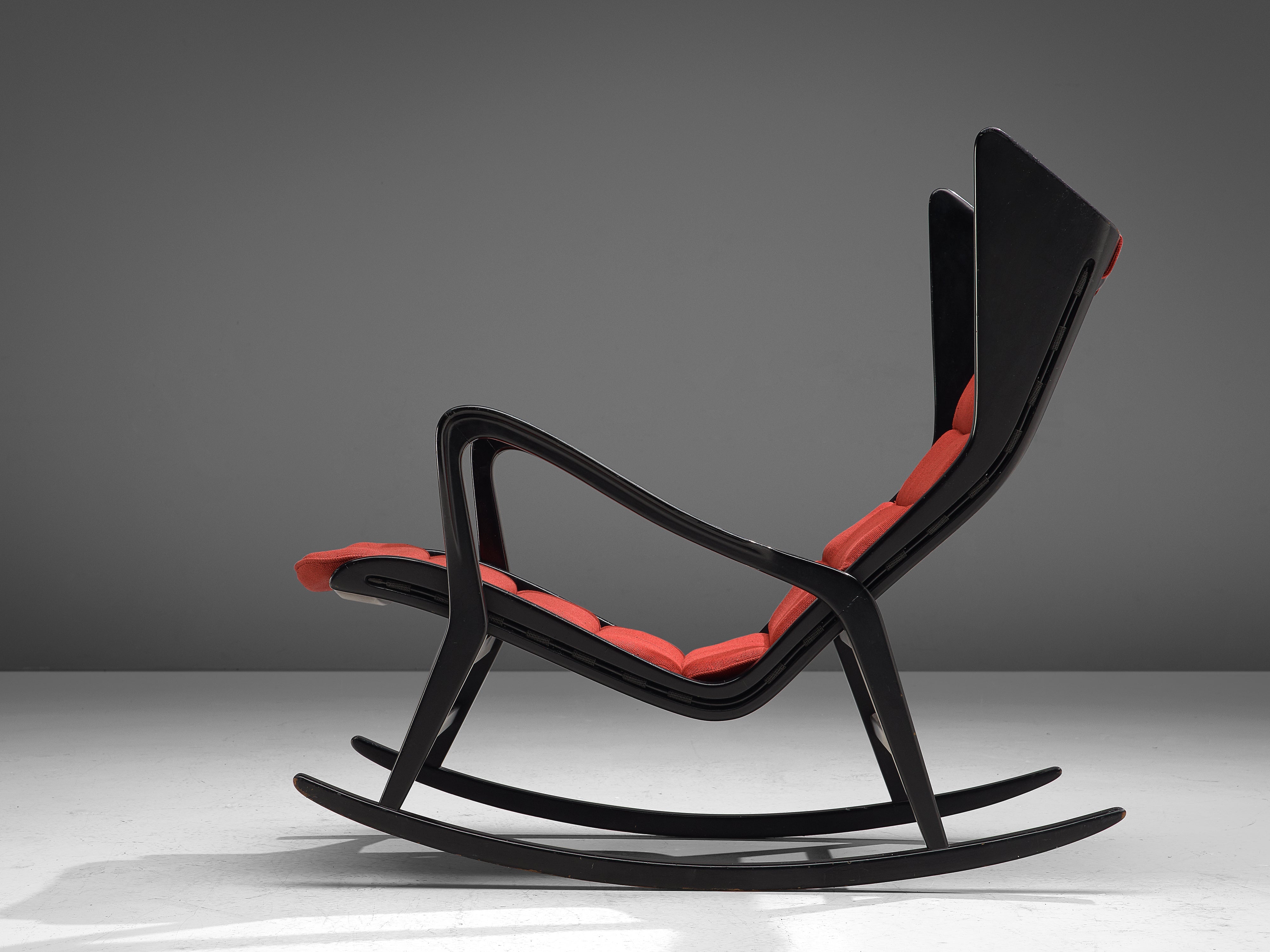 Studio Cassina '572 Rocking' Chair in Ebonized Wood and Red Upholstery