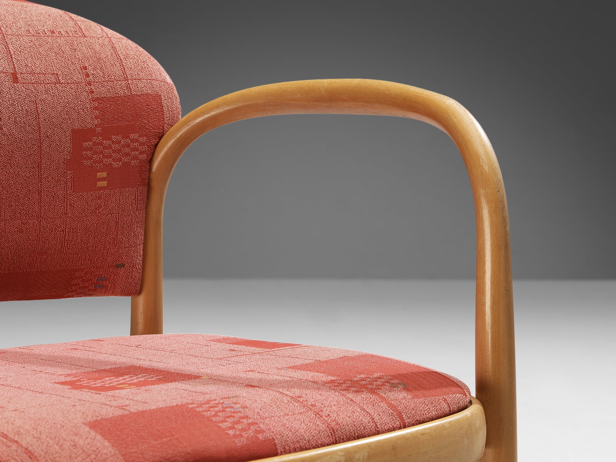This elegant set of dining chairs, manufactured by Ton, features a wonderful bentwood frame. The round shape of the back and armrests surrounds the sitter. The seat and backrest are upholstered in a red, patterned fabric which is in good, used condition.