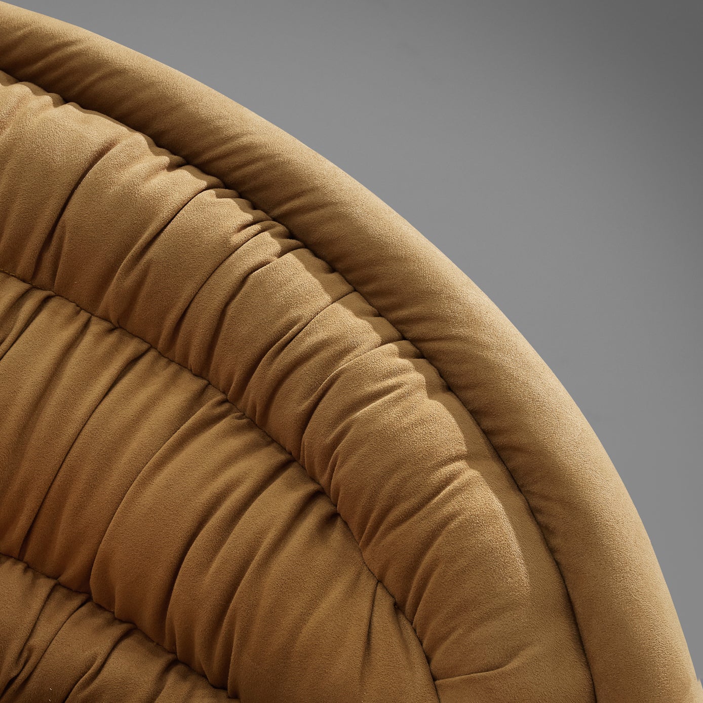 This 'Ellipse' lounge chair truly employs the designer’s aesthetic vocabulary and approach towards functionality. The textured surface of the seat with its pronounced folds is achieved by a refined upholstery technique what Kagan referred to as a 'channeled pillow back.'. The inviting and open appearance is reached by the crescent construction of the body. The base is comprised of a circular frame which conceals the casters and together with the swivel function of the seat, Kagan created a very mobile armchair.